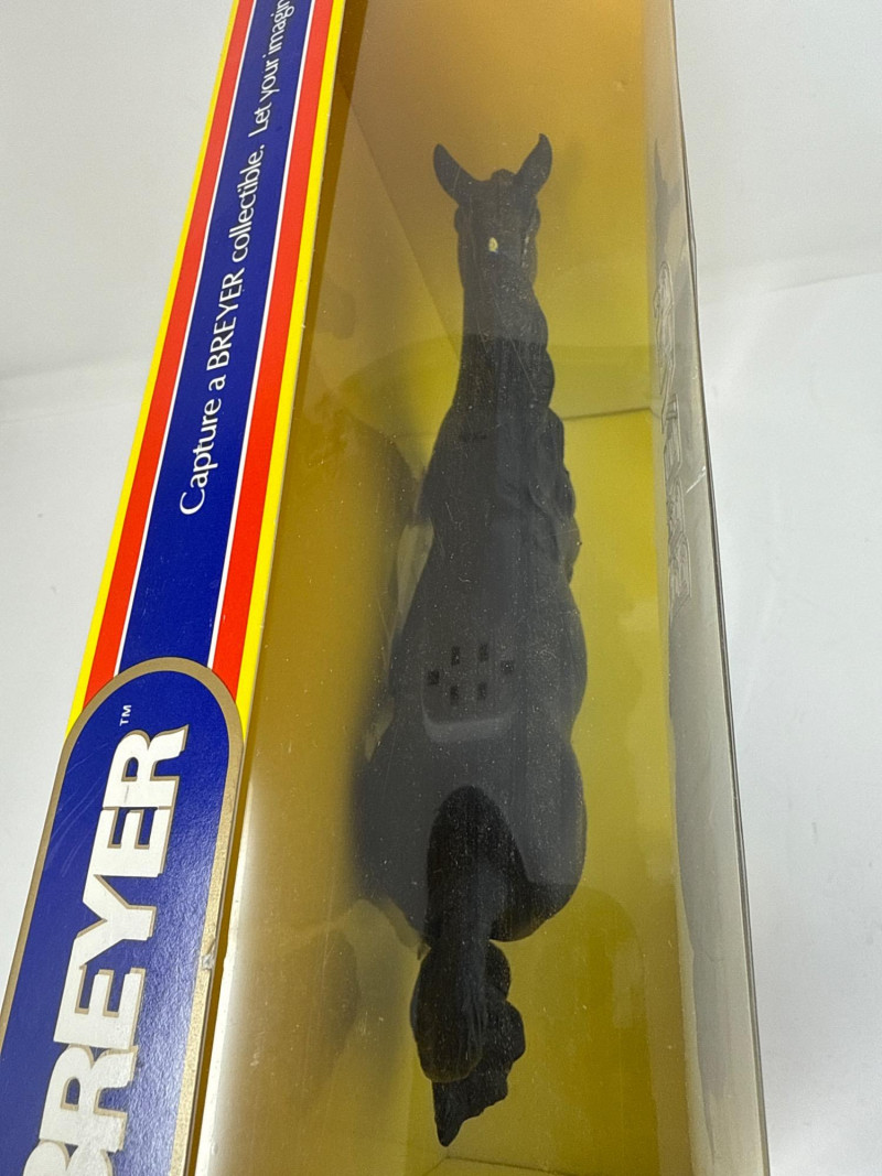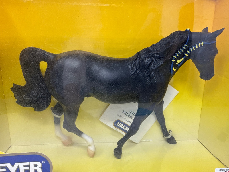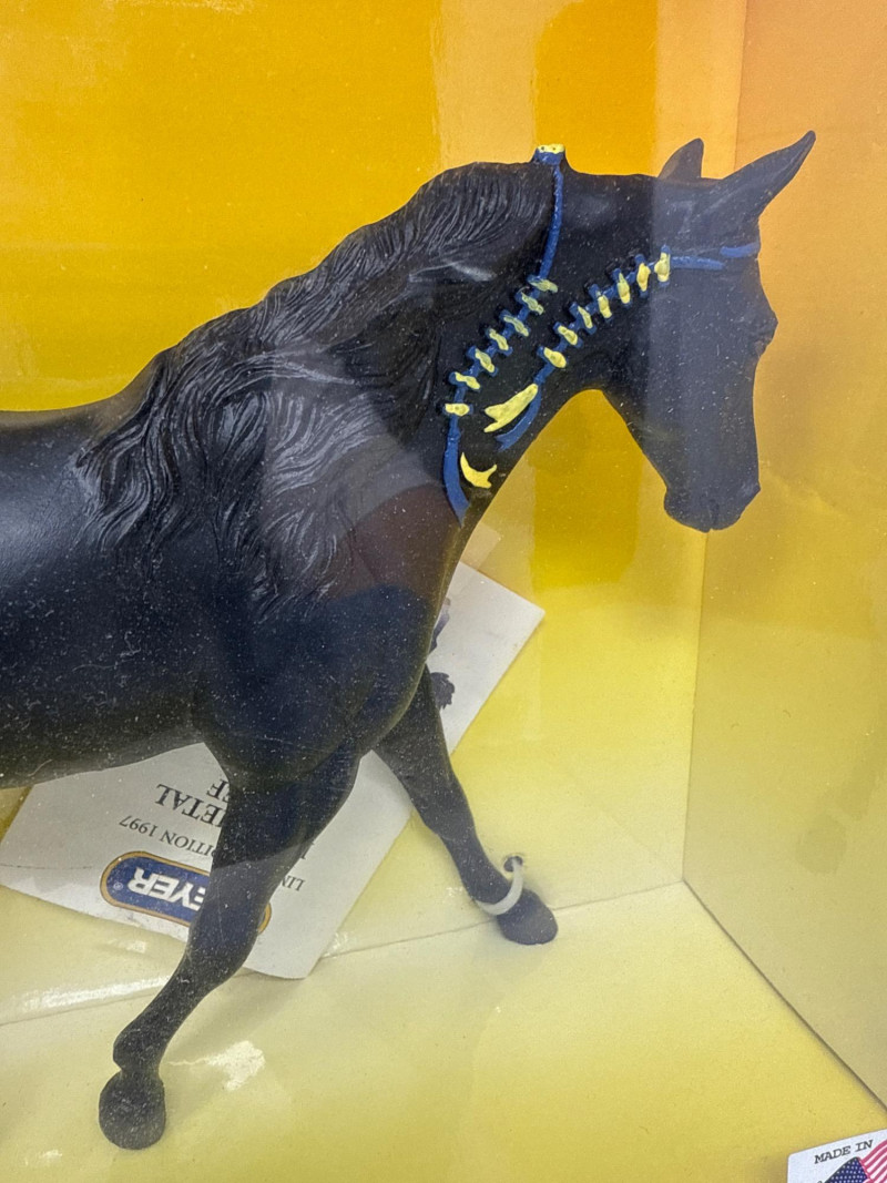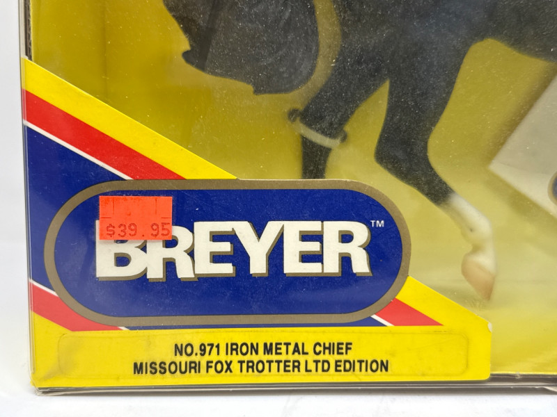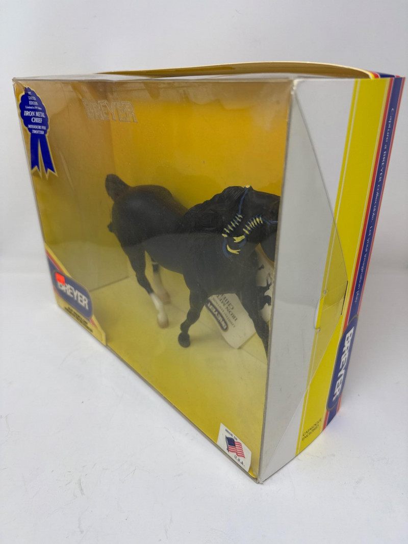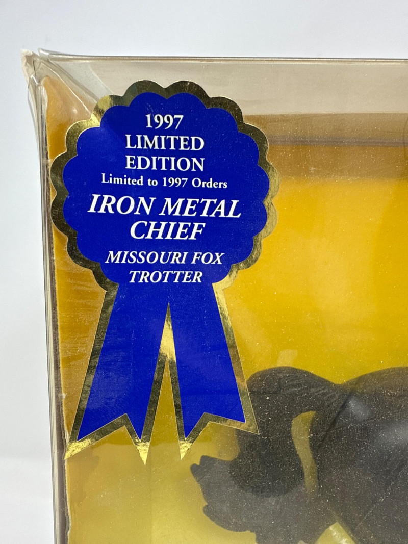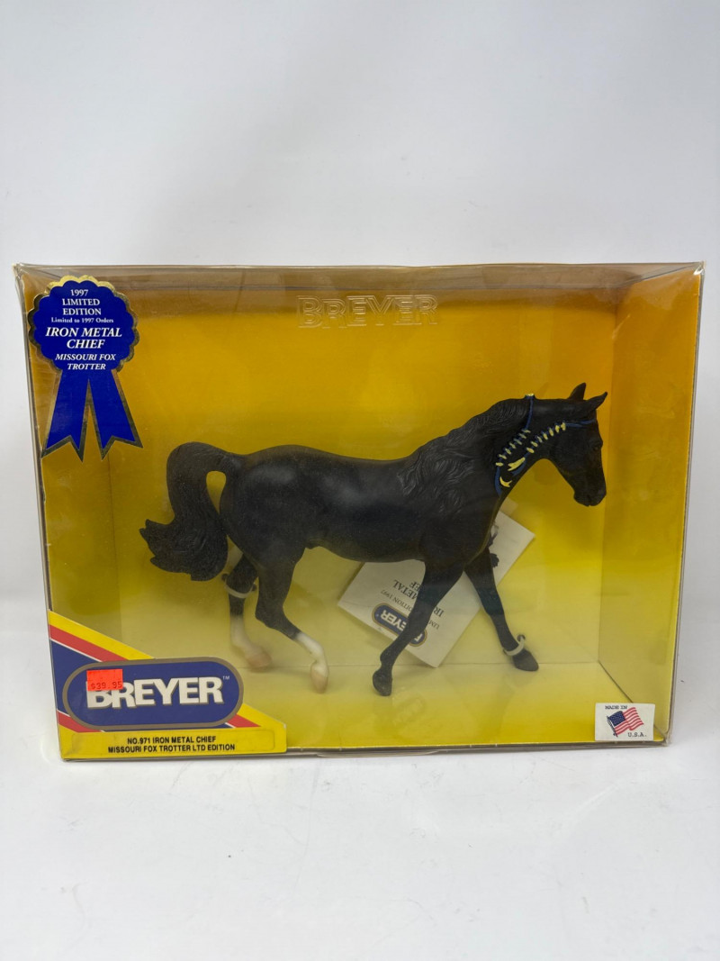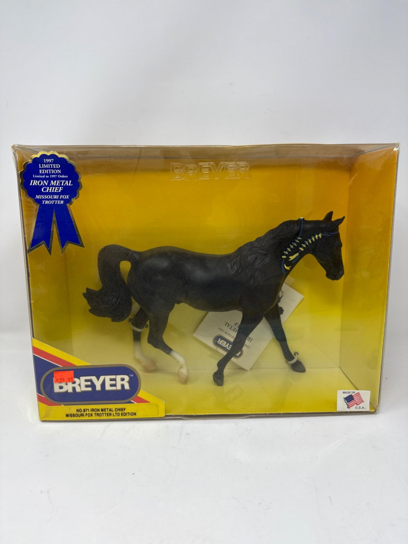 A rare and highly collectible Breyer model, “Iron Metal Chief” captures the proud stance and smooth gait of the Missouri Fox Trotter in a striking metallic finish. Released as a 1997 Limited Edition, this piece was restricted to just 1,997 orders, making it a prized find for serious Breyer enthusiasts and equine art collectors alike. Model No.: 971 Title: “Iron Metal Chief” – Missouri Fox Trotter Manufacturer: Breyer Edition: 1997 Limited Edition – only 1,997 produced Material: Cast iron-look finish (not actual iron; simulated metallic surface) Packaging: Original box with blue ribbon label and price sticker ($39.95) Condition: Appears unused in original packaging; box shows minor shelf wear Markings: Breyer logo and edition details printed on packaging Dimensions: Approx. 12" L × 9" H × 3.5" W Provenance: From a curated estate collection of vintage Breyer models