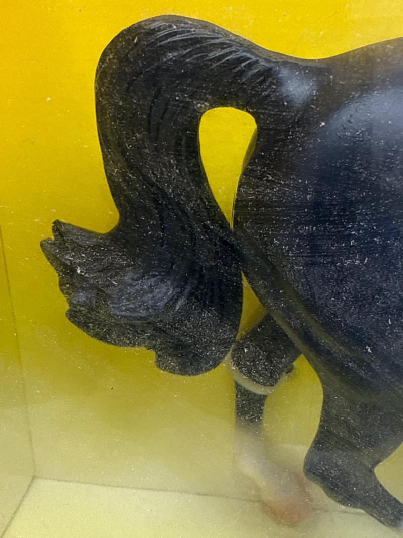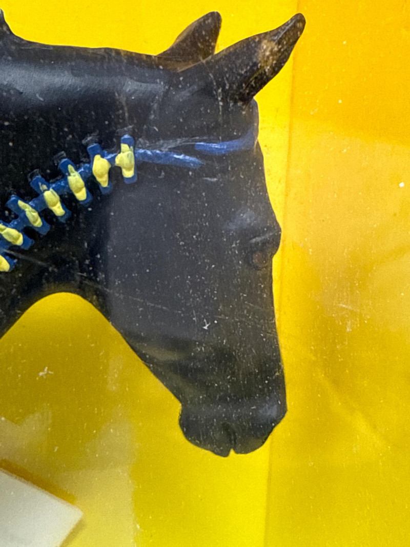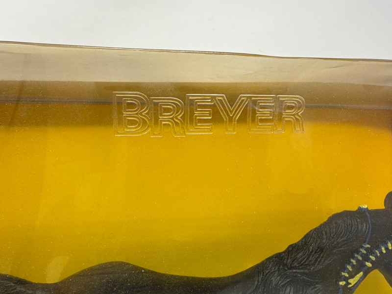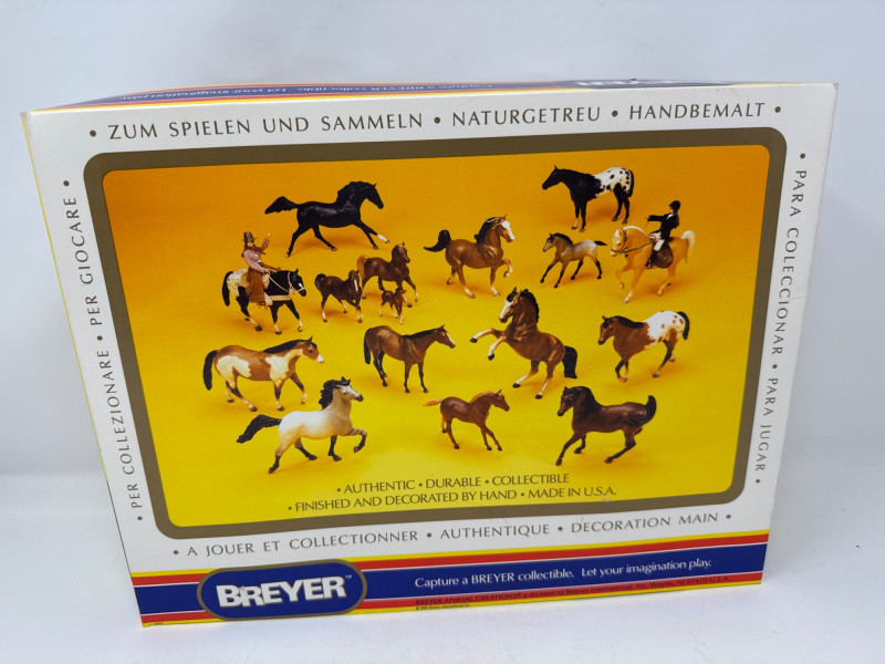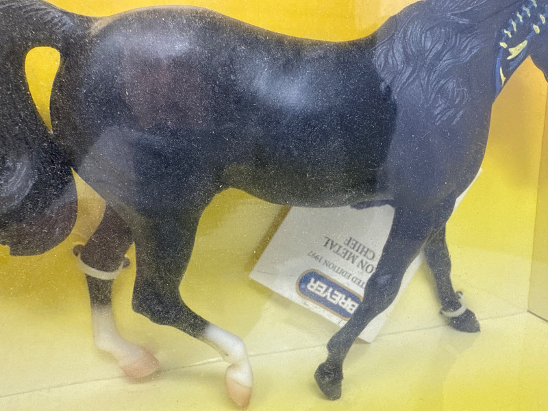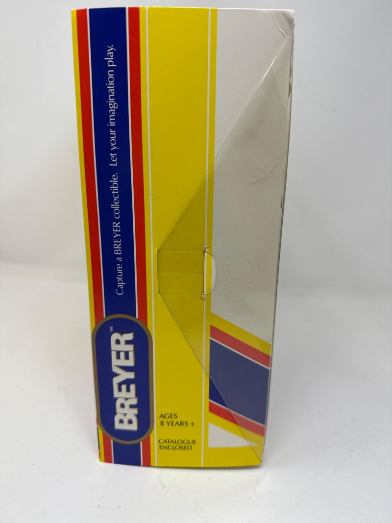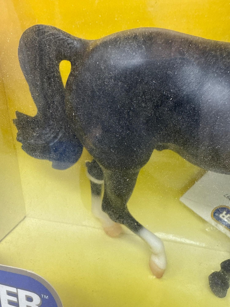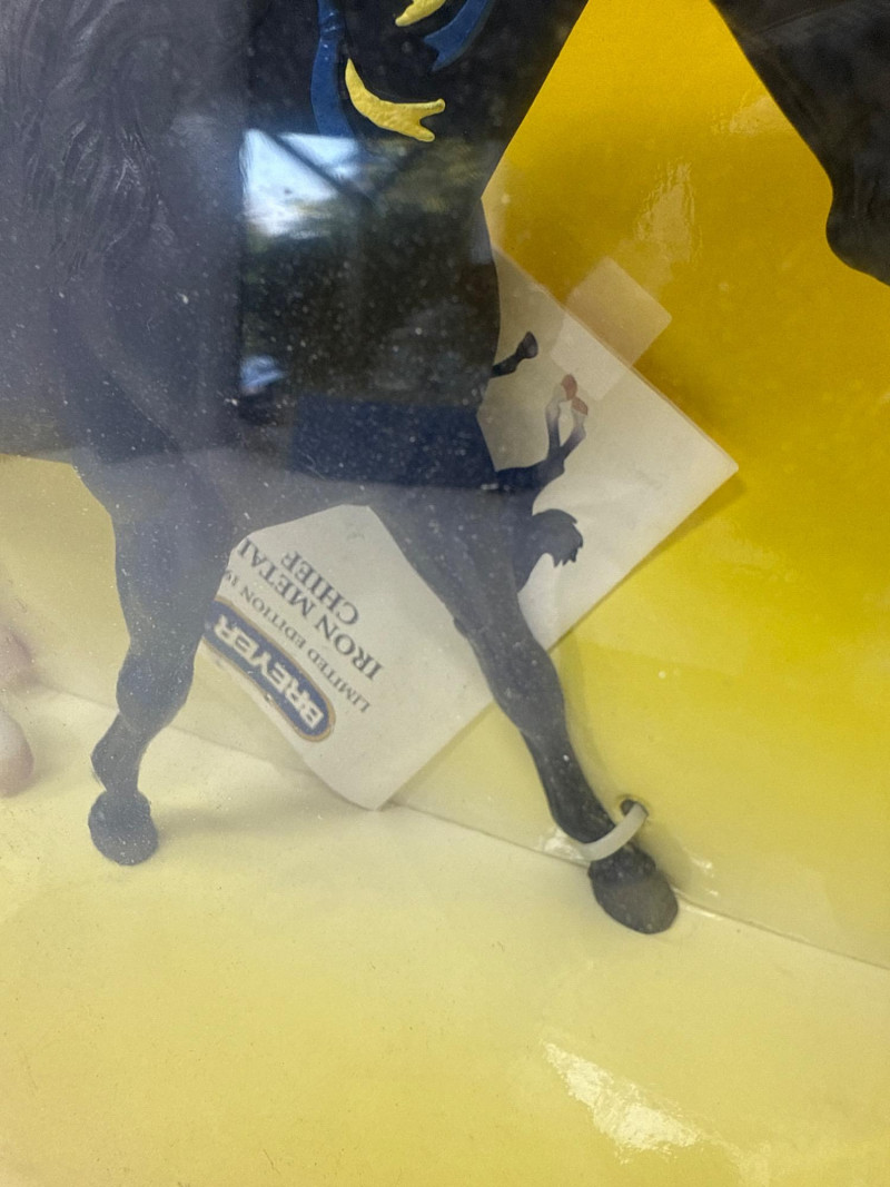 A rare and highly collectible Breyer model, “Iron Metal Chief” captures the proud stance and smooth gait of the Missouri Fox Trotter in a striking metallic finish. Released as a 1997 Limited Edition, this piece was restricted to just 1,997 orders, making it a prized find for serious Breyer enthusiasts and equine art collectors alike. Model No.: 971 Title: “Iron Metal Chief” – Missouri Fox Trotter Manufacturer: Breyer Edition: 1997 Limited Edition – only 1,997 produced Material: Cast iron-look finish (not actual iron; simulated metallic surface) Packaging: Original box with blue ribbon label and price sticker ($39.95) Condition: Appears unused in original packaging; box shows minor shelf wear Markings: Breyer logo and edition details printed on packaging Dimensions: Approx. 12" L × 9" H × 3.5" W Provenance: From a curated estate collection of vintage Breyer models