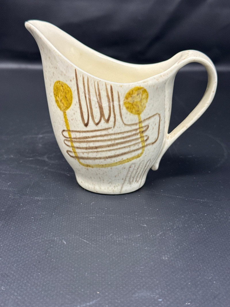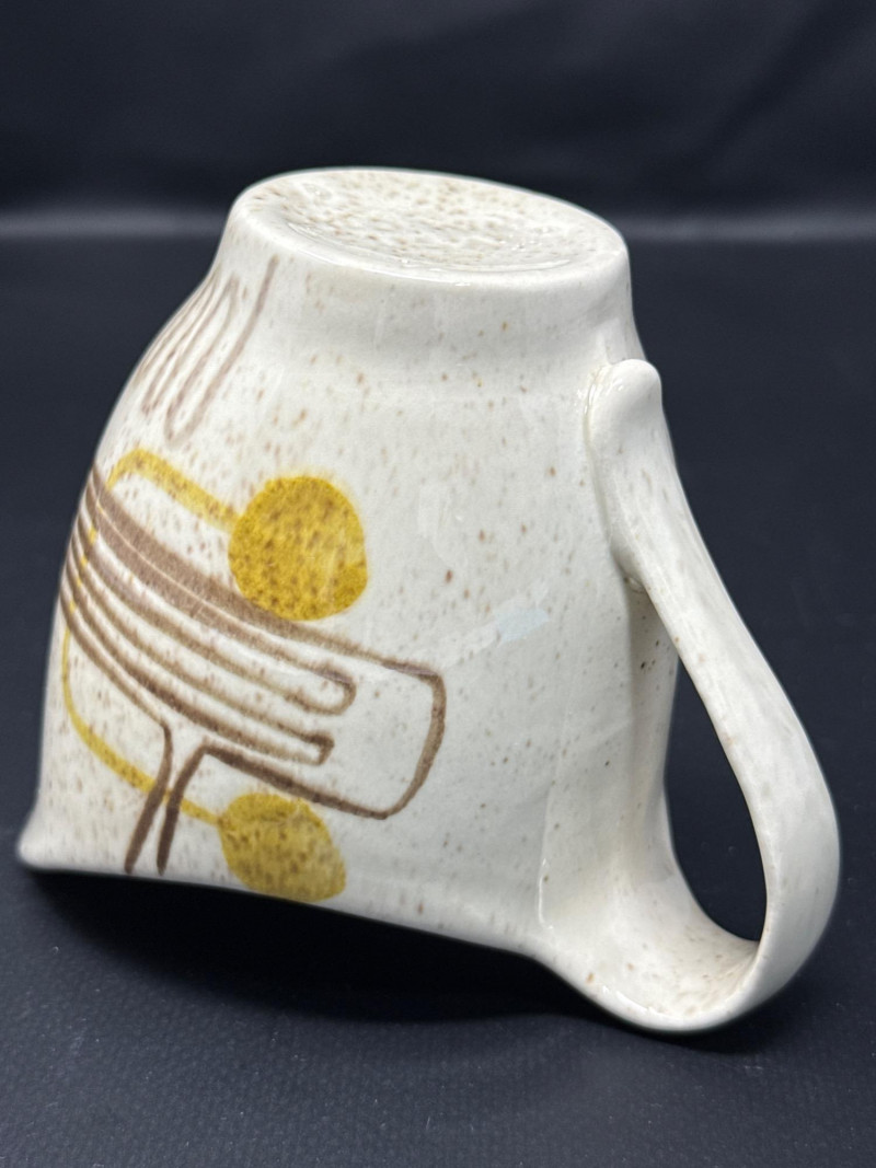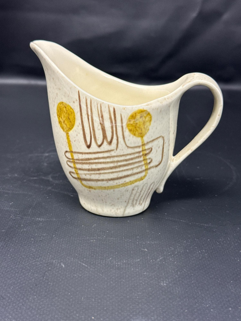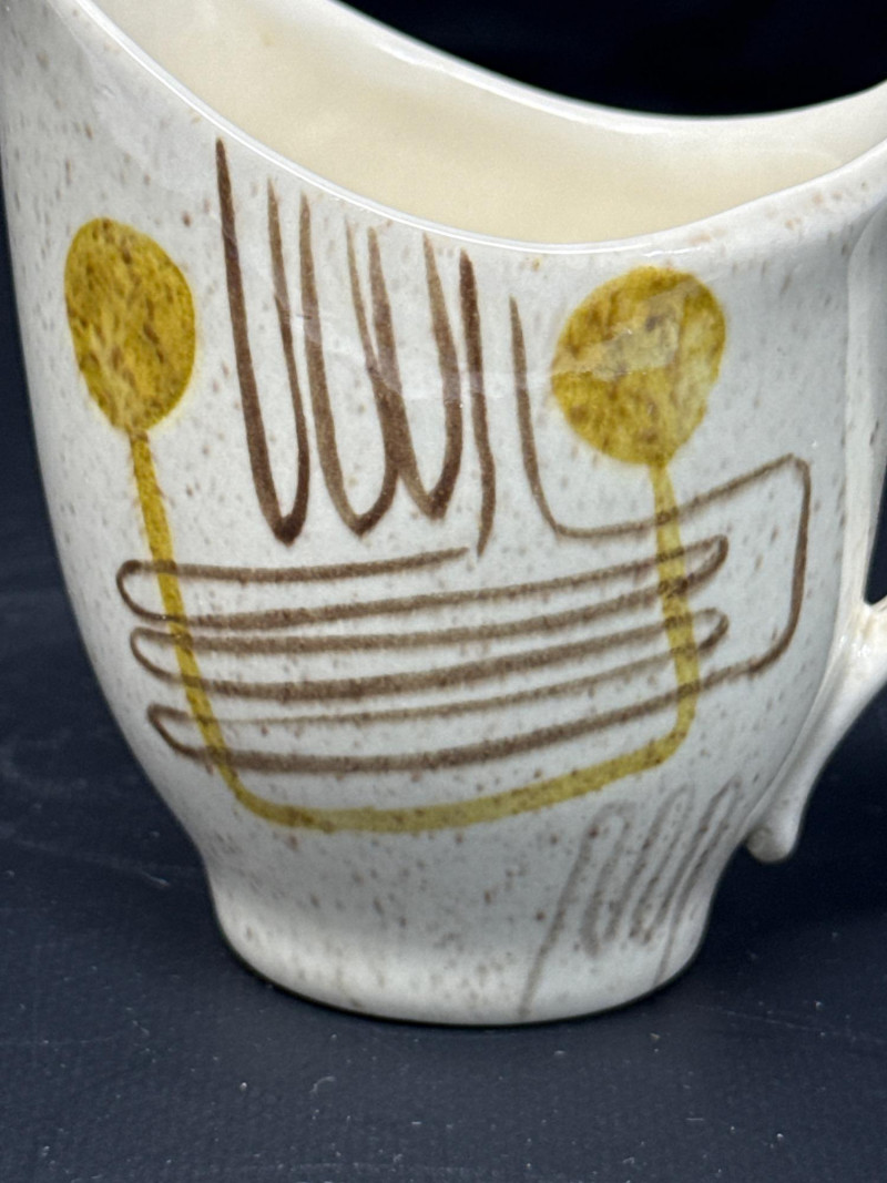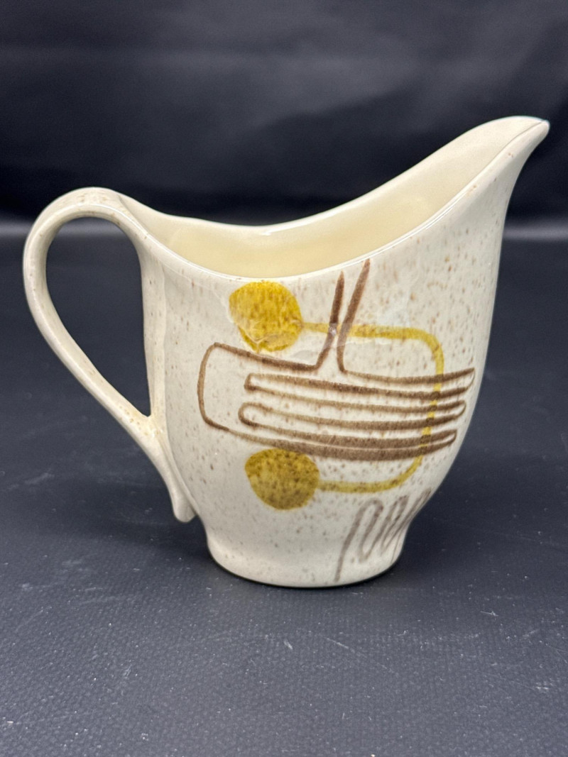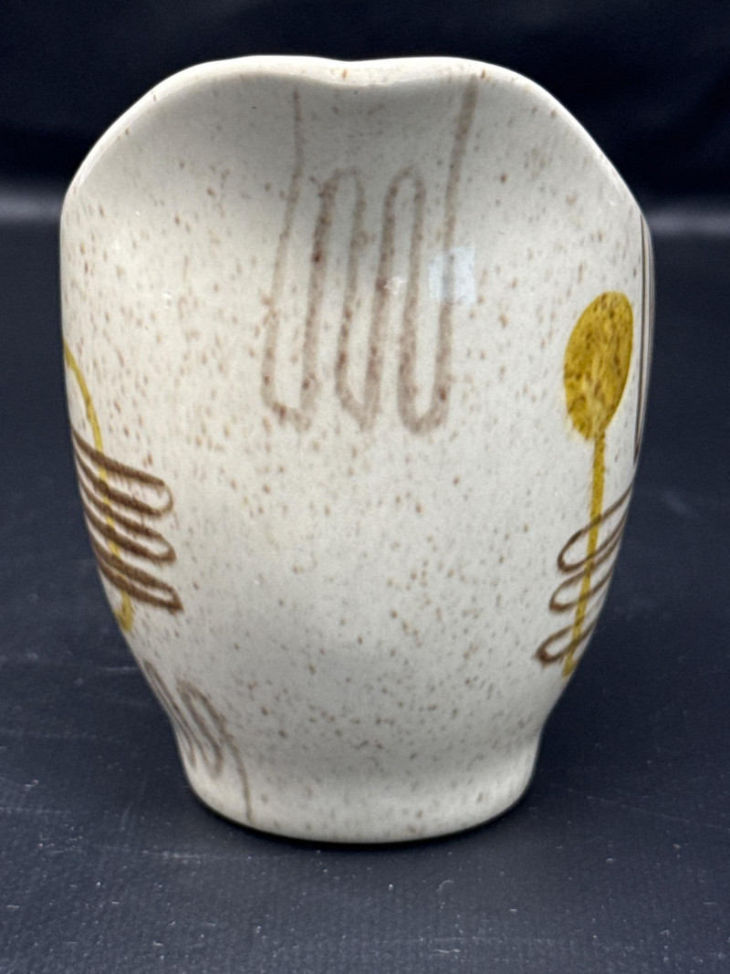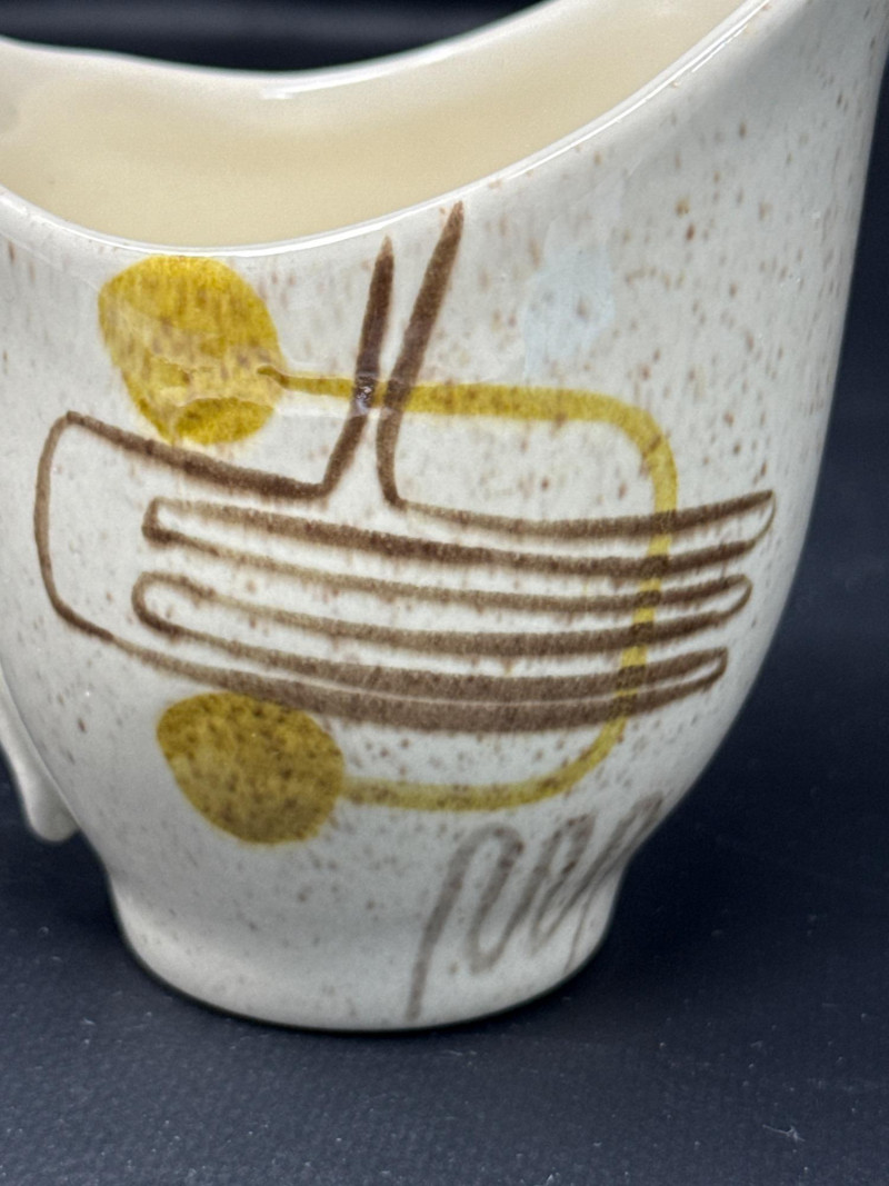 This sculptural creamer captures the dynamic spirit of Red Wing Pottery’s “Crazy Rhythm” pattern, a bold and expressive line produced in Minnesota during the mid-20th century. Crafted from glazed stoneware ceramic, the piece features a flared spout and looped handle, finished in a swirling glaze of earthy reds, taupes, and charcoal—each application uniquely rendered in the kiln. Maker: Red Wing Pottery, Minnesota, USA Pattern: Crazy Rhythm Material: Glazed stoneware/ceramic Era: Mid-Century Modern, circa 1950s–1960s Dimensions: Approx. 4.5" W x 4" H Condition: Excellent vintage condition with light wear commensurate with age.