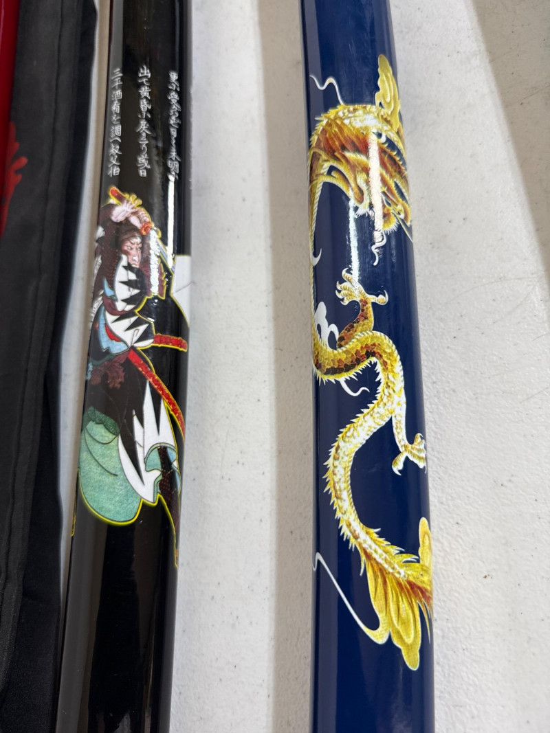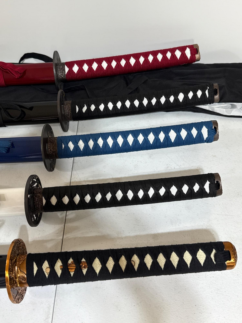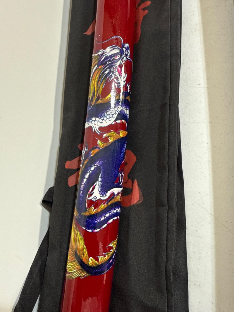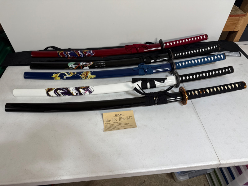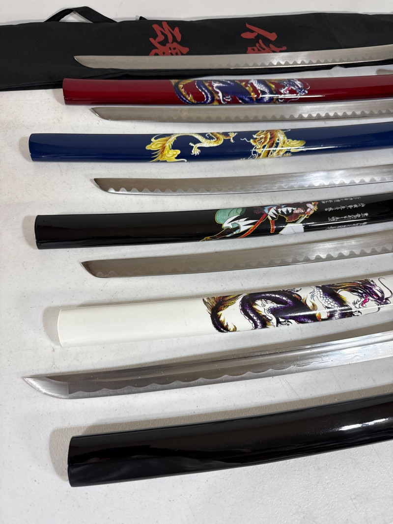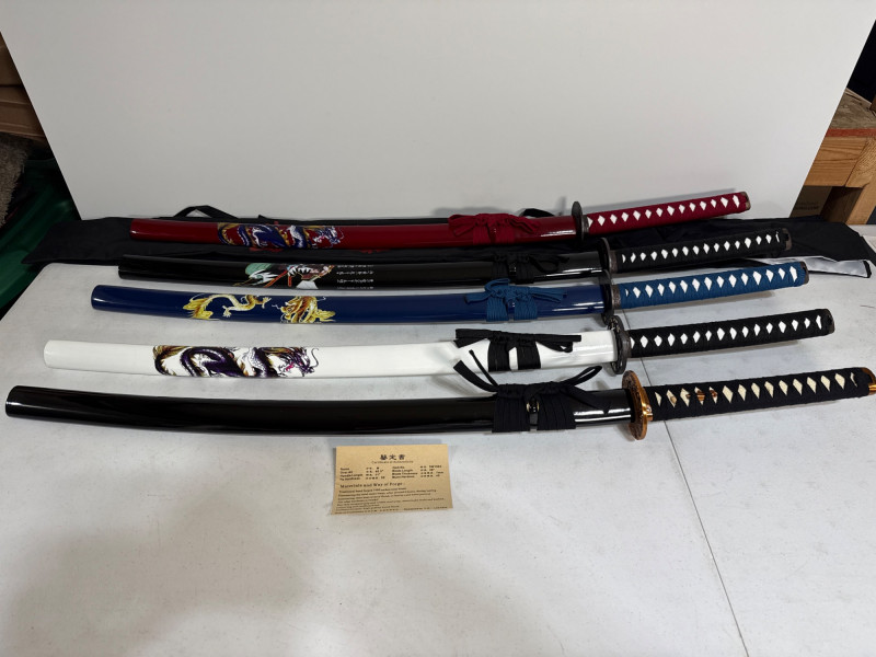 A set of five Japanese-style decorative katana swords, each celebrating the spirit of Bushido through vivid dragon motifs, samurai imagery, and traditional design elements. The scabbards are painted in bold hues—red, blue, black, white, and purple—with hand-drawn dragons and vertical kanji inscriptions that evoke East Asian mythology and warrior ethos. Protective sleeves and boxed packaging for each sword. Dimensions: Approx. 41 inches Design Features: Scabbards adorned with dragons, samurai figures, and calligraphy Cord-wrapped handles in black, blue, and red Engraved Tsubo (hand guards) with kanji and ornamental detailing Blades feature stylized Hamon patterns and one bears the registered “S.W.” logo Use & Compliance: Intended for display or cosplay; Sharp, but not suitable for combat. Not a toy. Buyer responsible for local compliance and import regulations This set is ideal for collectors of Bushido-inspired décor, martial arts enthusiasts, or those seeking dramatic statement pieces rooted in samurai heritage. A rare, cohesive ensemble that honors the warrior’s path through art and symbolism.