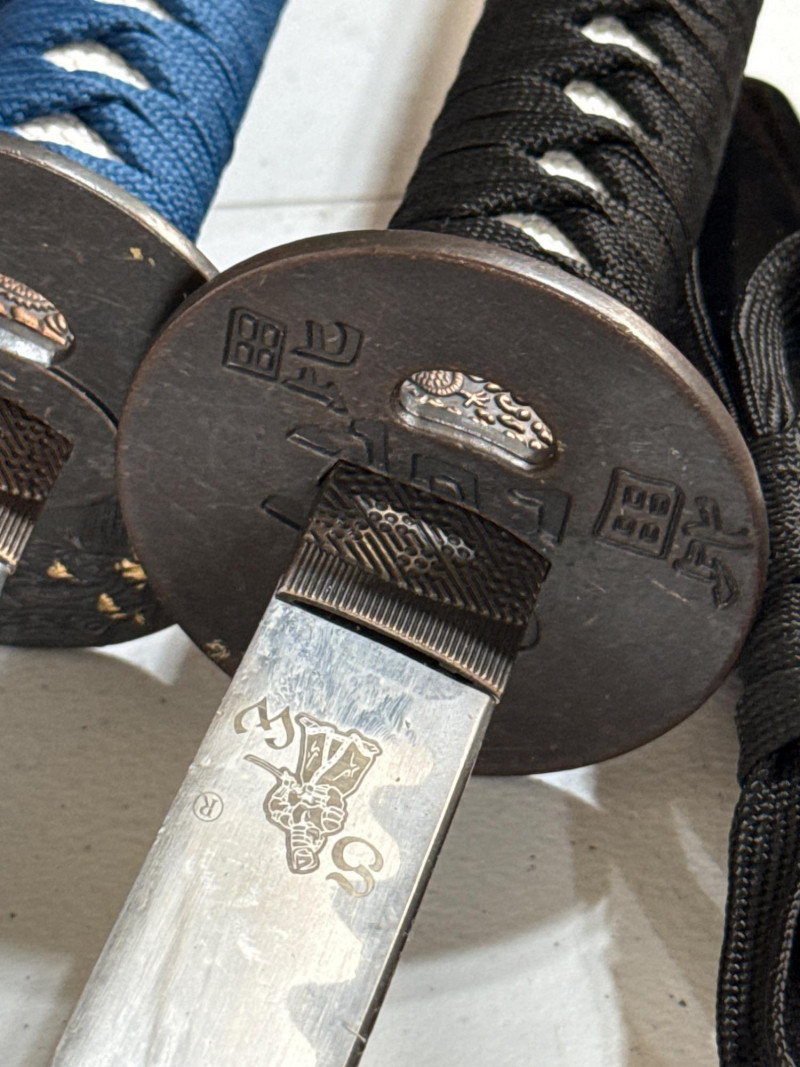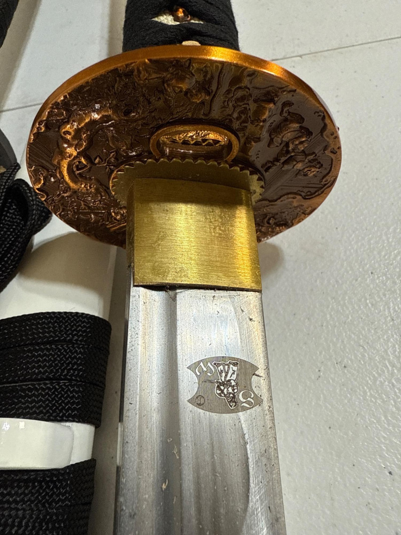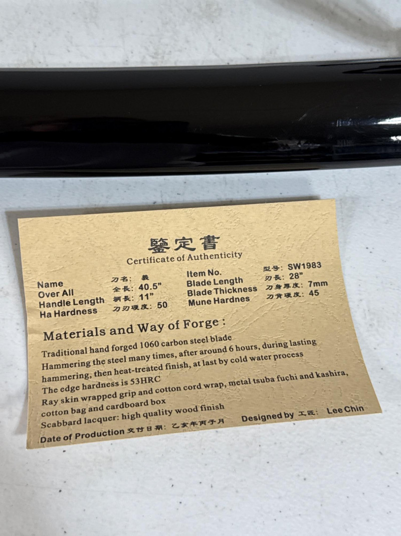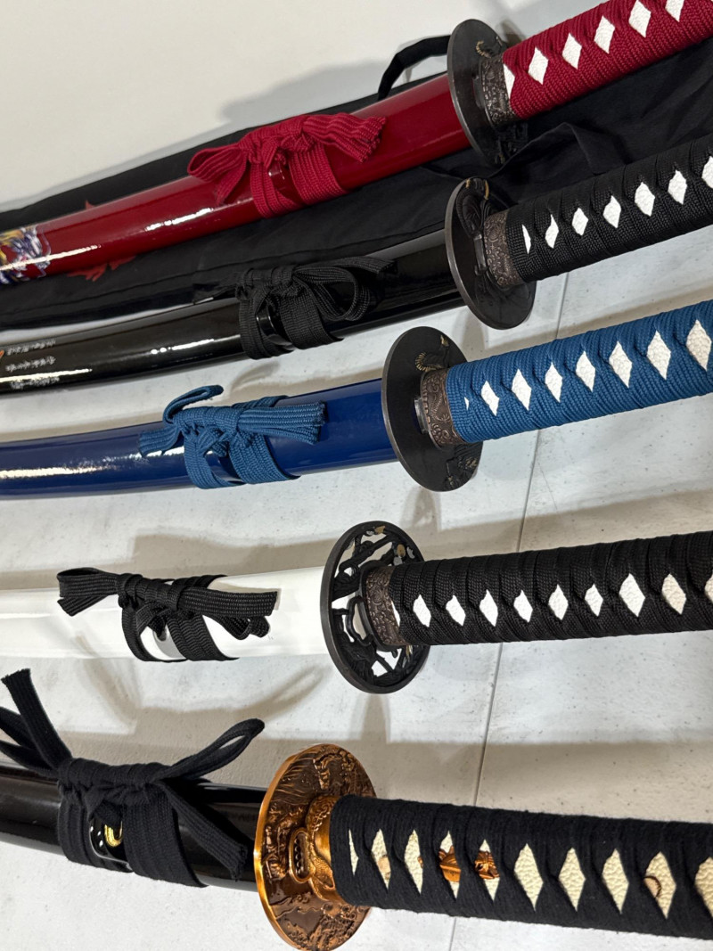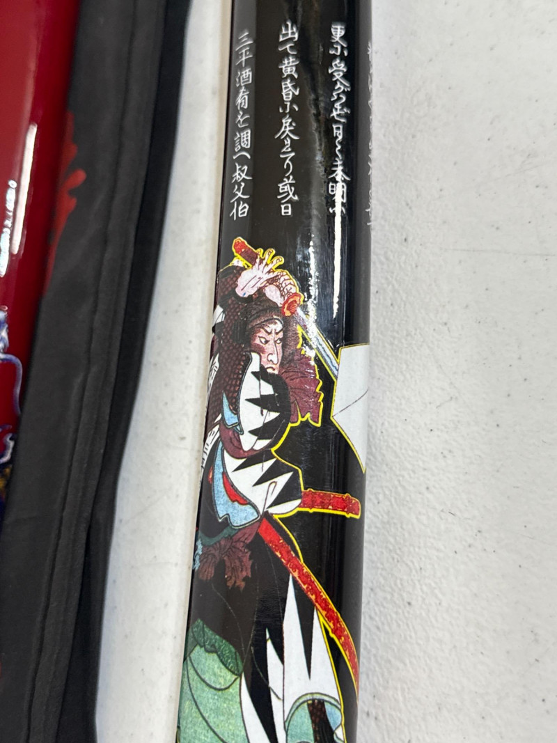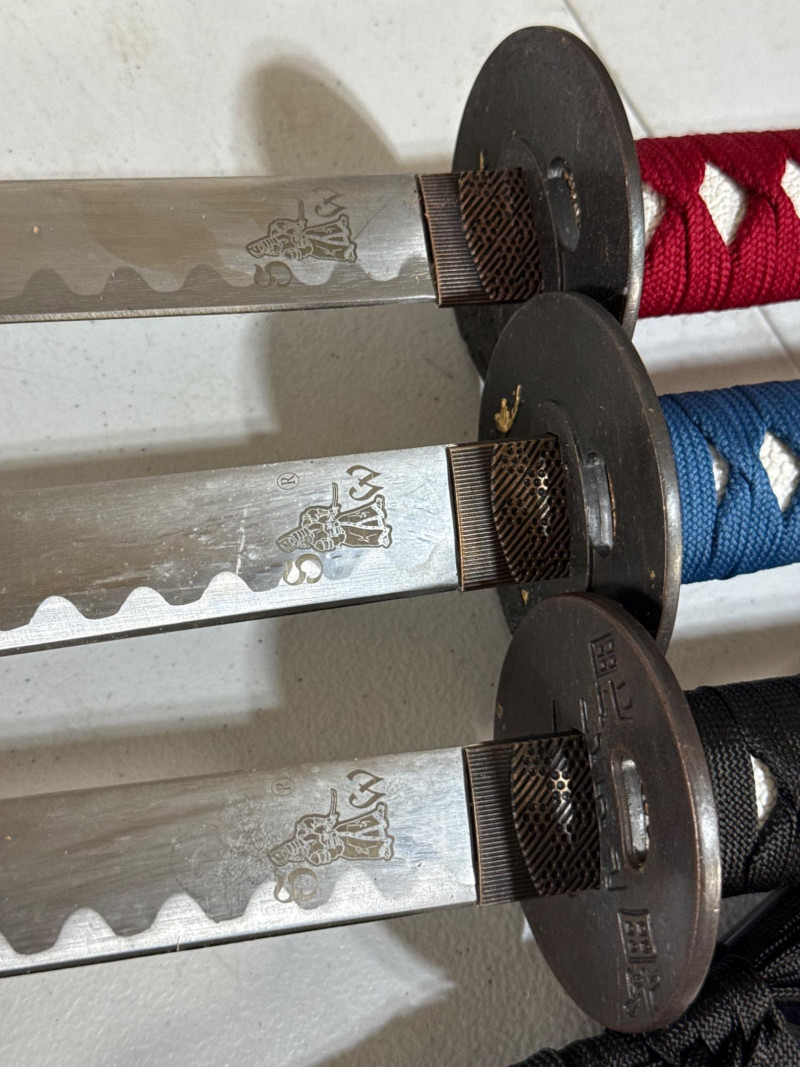 A set of five Japanese-style decorative katana swords, each celebrating the spirit of Bushido through vivid dragon motifs, samurai imagery, and traditional design elements. The scabbards are painted in bold hues—red, blue, black, white, and purple—with hand-drawn dragons and vertical kanji inscriptions that evoke East Asian mythology and warrior ethos. Protective sleeves and boxed packaging for each sword. Dimensions: Approx. 41 inches Design Features: Scabbards adorned with dragons, samurai figures, and calligraphy Cord-wrapped handles in black, blue, and red Engraved Tsubo (hand guards) with kanji and ornamental detailing Blades feature stylized Hamon patterns and one bears the registered “S.W.” logo Use & Compliance: Intended for display or cosplay; Sharp, but not suitable for combat. Not a toy. Buyer responsible for local compliance and import regulations This set is ideal for collectors of Bushido-inspired décor, martial arts enthusiasts, or those seeking dramatic statement pieces rooted in samurai heritage. A rare, cohesive ensemble that honors the warrior’s path through art and symbolism.