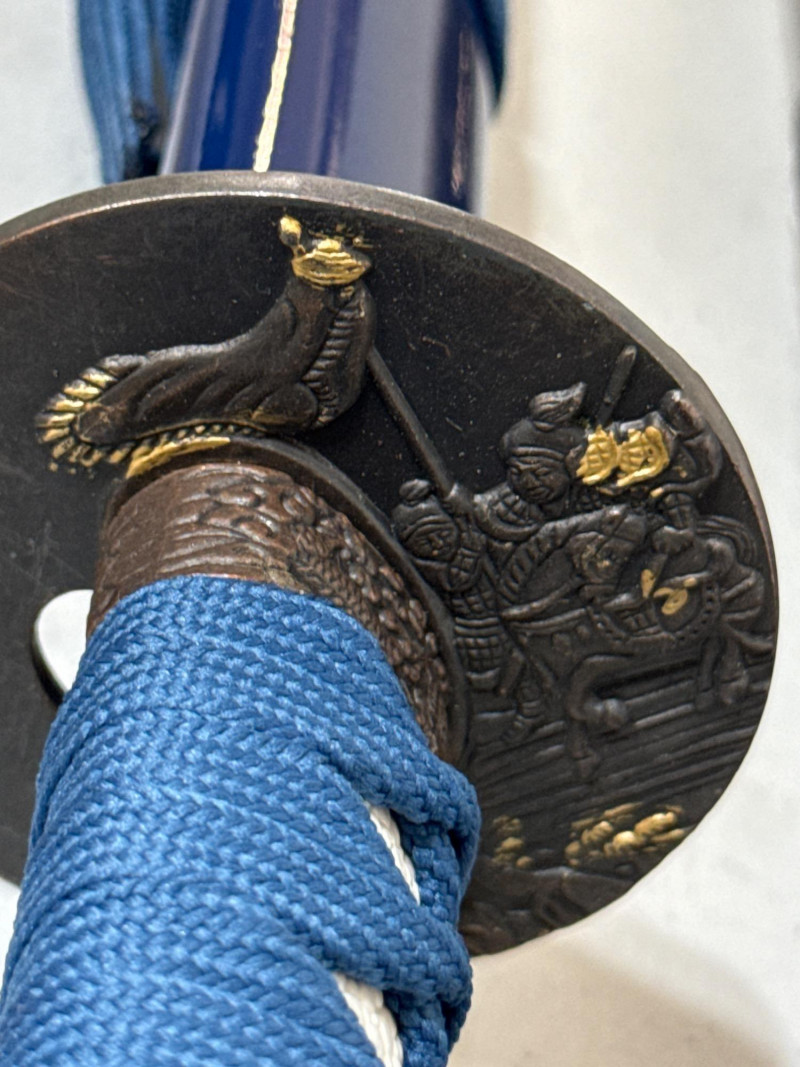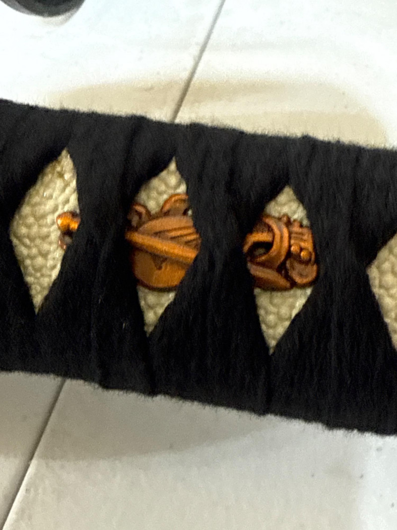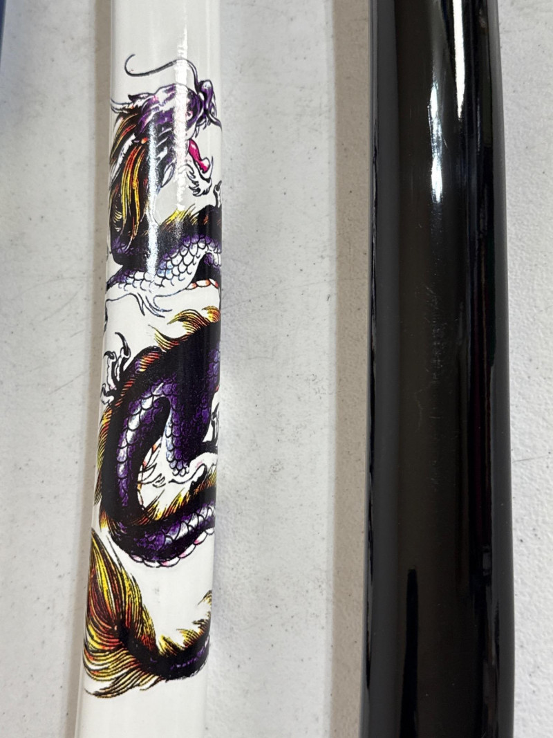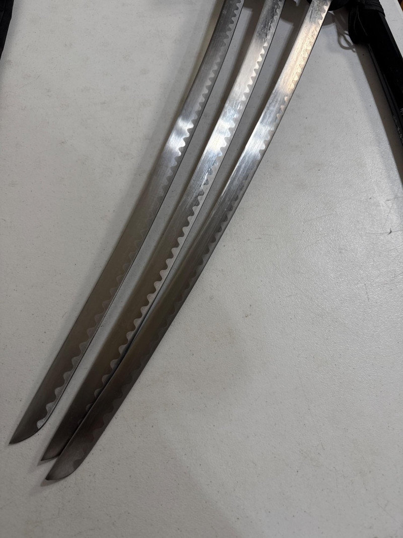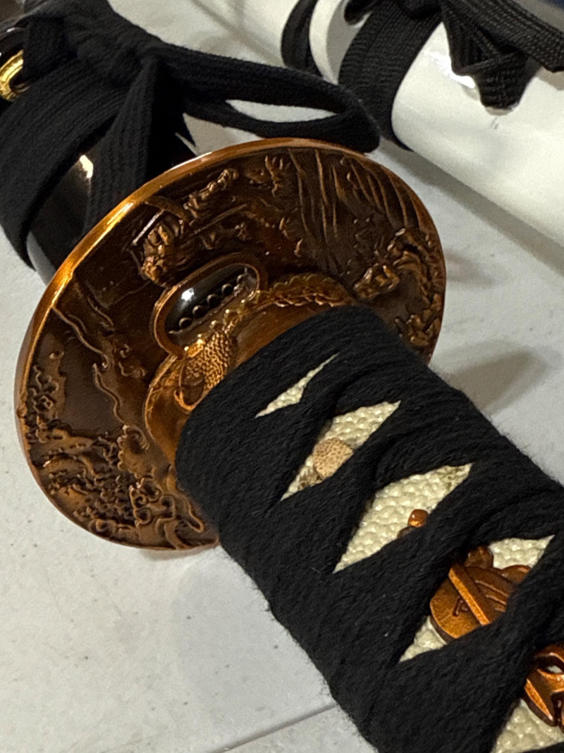 A set of five Japanese-style decorative katana swords, each celebrating the spirit of Bushido through vivid dragon motifs, samurai imagery, and traditional design elements. The scabbards are painted in bold hues—red, blue, black, white, and purple—with hand-drawn dragons and vertical kanji inscriptions that evoke East Asian mythology and warrior ethos. Protective sleeves and boxed packaging for each sword. Dimensions: Approx. 41 inches Design Features: Scabbards adorned with dragons, samurai figures, and calligraphy Cord-wrapped handles in black, blue, and red Engraved Tsubo (hand guards) with kanji and ornamental detailing Blades feature stylized Hamon patterns and one bears the registered “S.W.” logo Use & Compliance: Intended for display or cosplay; Sharp, but not suitable for combat. Not a toy. Buyer responsible for local compliance and import regulations This set is ideal for collectors of Bushido-inspired décor, martial arts enthusiasts, or those seeking dramatic statement pieces rooted in samurai heritage. A rare, cohesive ensemble that honors the warrior’s path through art and symbolism.