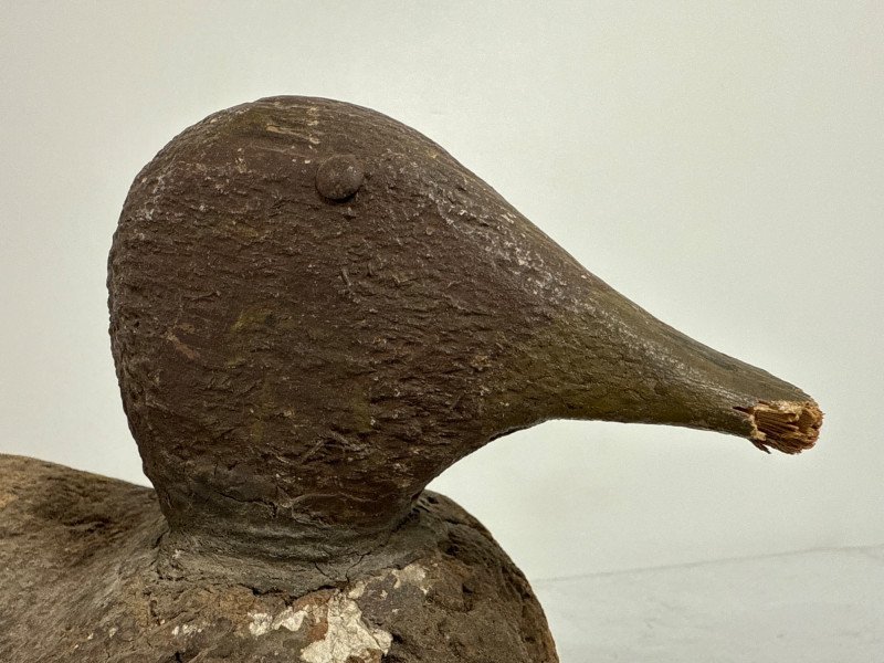 A hand-crafted vintage duck decoy featuring a cork body with painted surface detailing and a carved wooden head. The underside is fitted with a cast iron anchor weight, indicative of traditional waterfowl hunting practices. The decoy exhibits age-appropriate wear, including minor surface abrasions and fading to the paint, consistent with field use. No maker’s mark visible; likely mid-20th century American origin. This piece offers strong decorative appeal for collectors of sporting memorabilia, Americana, or rustic cabin décor. Its authentic construction and patina suggest it was used in active decoy spreads rather than purely ornamental. Dimensions: Length: 13.5 in Width: 5 in Height: 7 in