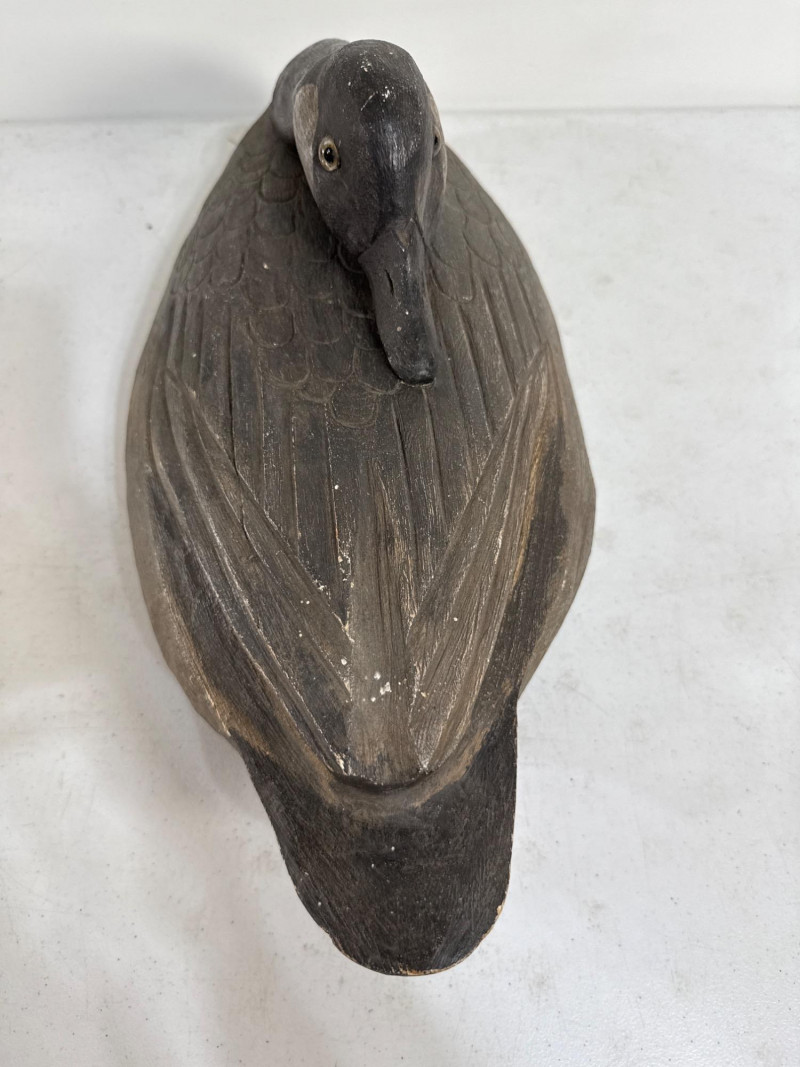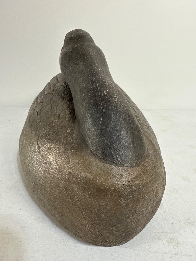 A vintage resin duck decoy molded in durable resin with hand-painted feather detailing and a realistic color palette. This piece evokes classic waterfowl hunting traditions while serving as a striking decorative accent. The surface shows expected signs of age, including minor wear consistent with vintage display use. No visible maker’s mark or signature.