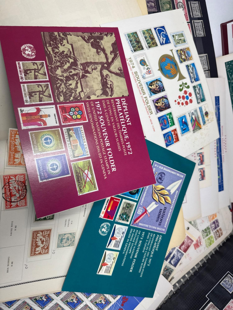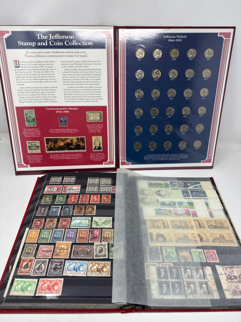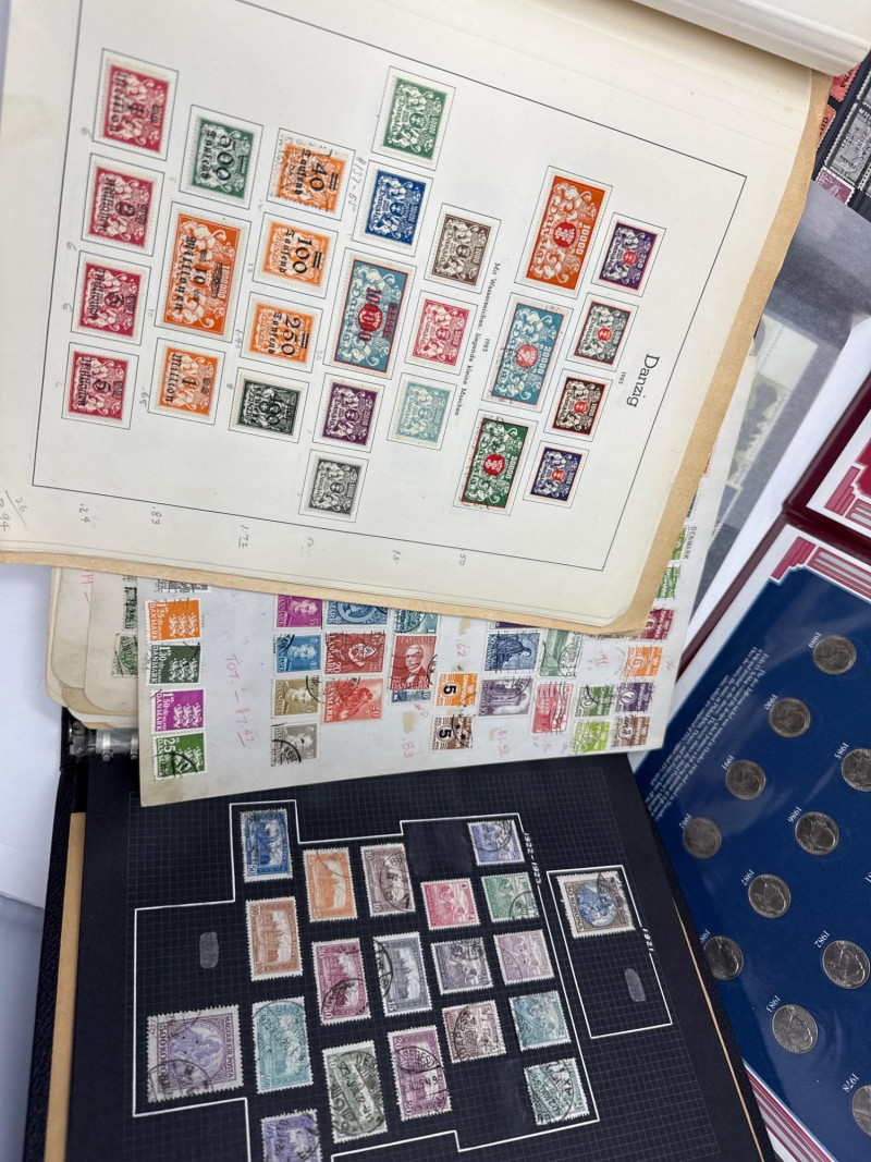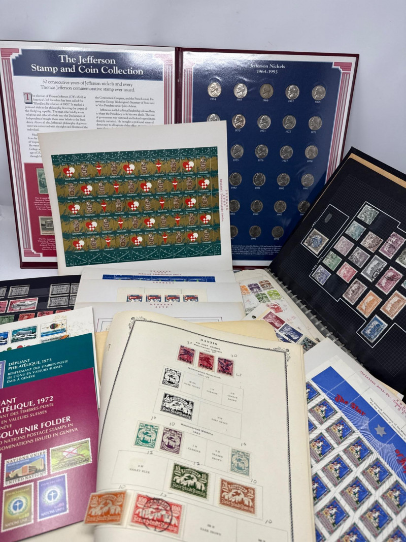 Collector’s lot spanning U.S. numismatics, European postal history, and international commemoratives This diverse assemblage includes: Jefferson Nickels (1938–1995): Chronologically arranged coins with visible mint marks and date ranges. Grades vary from VF to AU. Commemorative Stamp Panel: Illustrated display with historical context and Jefferson-themed U.S. stamps. Binder Archive: Additional pages of stamps from various countries, organized by theme and denomination. Early 20th-century stamps from the Free City of Danzig, mounted with printed labels and handwritten annotations. Includes rare overprints and watermark variants such as “1 M BLACK AND ROSE” and “10 Mark” issues. Two vintage folders showcasing commemorative stamps from 1972. Themes include international organizations, cultural symbols, and historical events. French and English titles suggest bilingual presentation. Binder pages contain stamps from multiple countries and eras, with themes ranging from historical figures to global events. Includes colorful designs, cultural motifs, and postal ephemera ideal for thematic collectors. Cross-category appeal: U.S. coins, European philately, and global stamp themes Ideal for collectors, educators, or resellers seeking variety and depth Strong visual presentation with archival mounts and labeled sheetsJefferson Stamp & Coin Panels