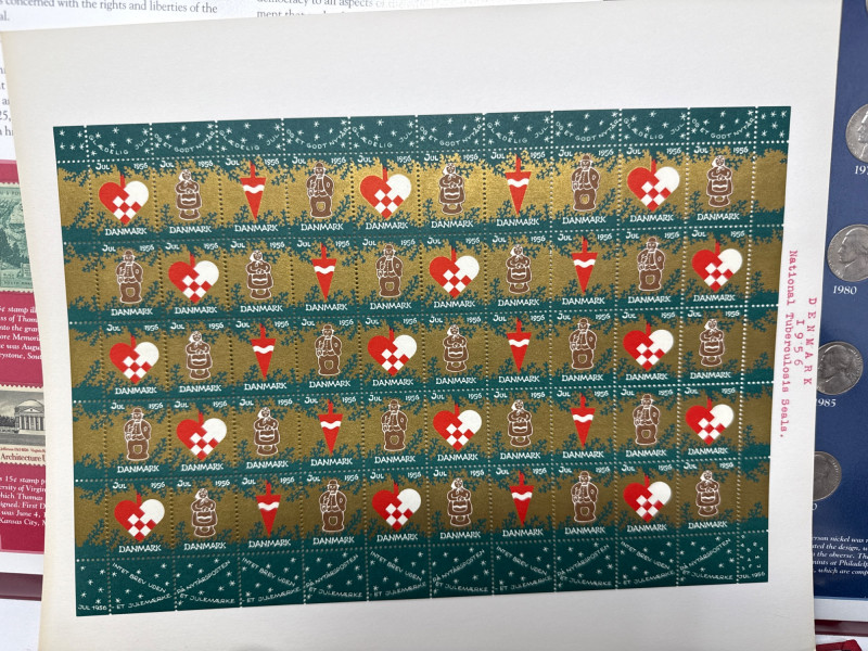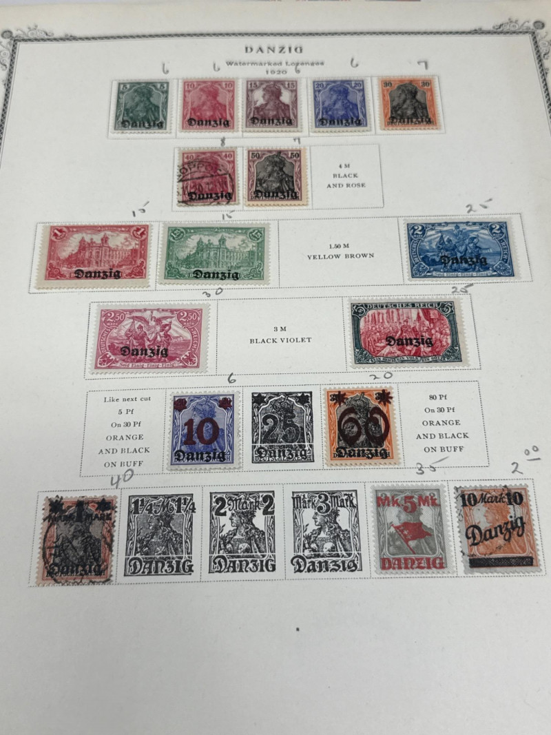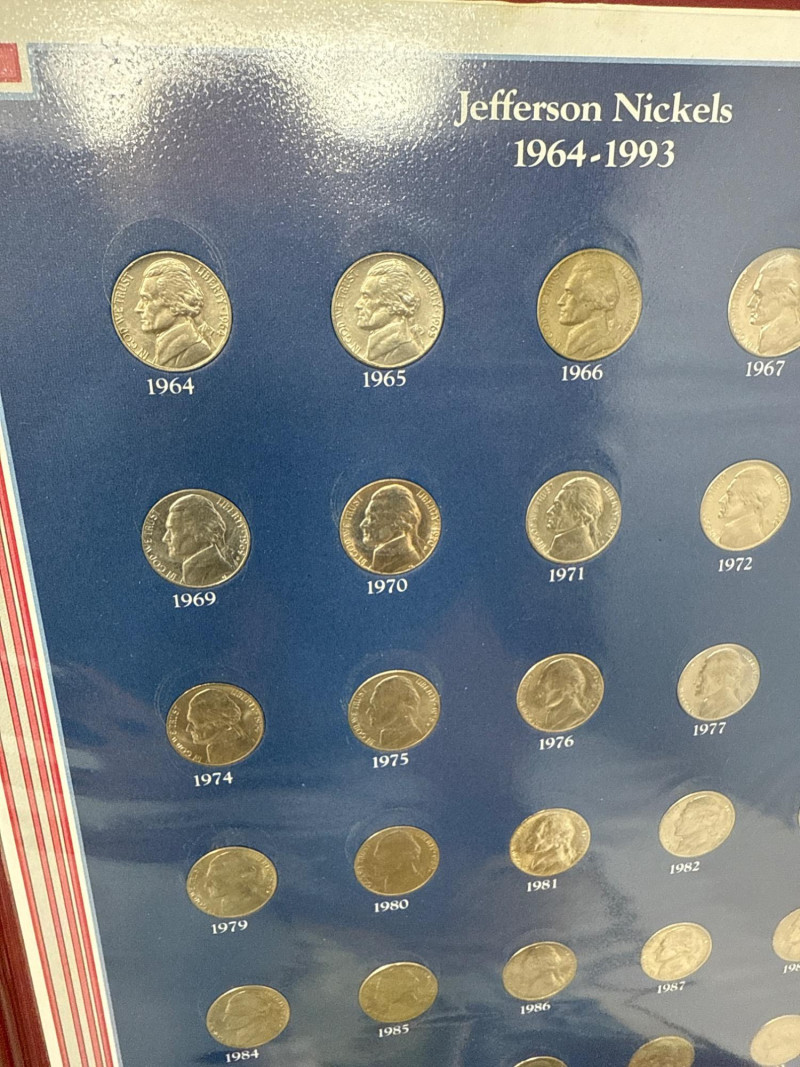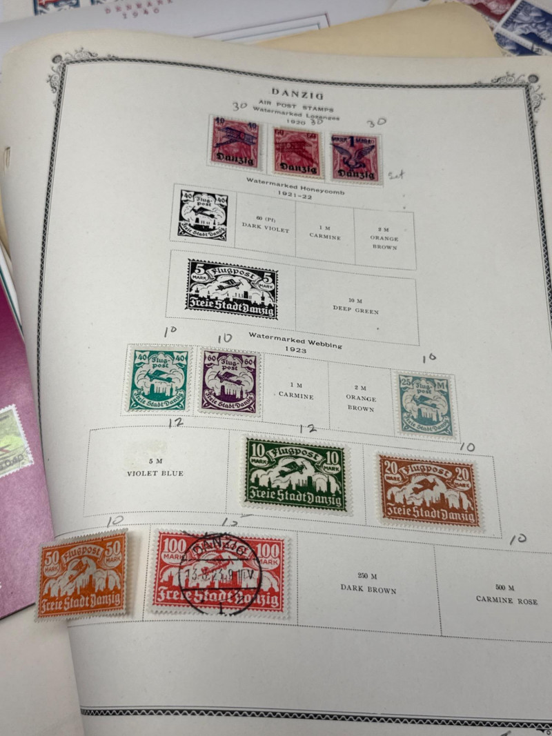 Collector’s lot spanning U.S. numismatics, European postal history, and international commemoratives This diverse assemblage includes: Jefferson Nickels (1938–1995): Chronologically arranged coins with visible mint marks and date ranges. Grades vary from VF to AU. Commemorative Stamp Panel: Illustrated display with historical context and Jefferson-themed U.S. stamps. Binder Archive: Additional pages of stamps from various countries, organized by theme and denomination. Early 20th-century stamps from the Free City of Danzig, mounted with printed labels and handwritten annotations. Includes rare overprints and watermark variants such as “1 M BLACK AND ROSE” and “10 Mark” issues. Two vintage folders showcasing commemorative stamps from 1972. Themes include international organizations, cultural symbols, and historical events. French and English titles suggest bilingual presentation. Binder pages contain stamps from multiple countries and eras, with themes ranging from historical figures to global events. Includes colorful designs, cultural motifs, and postal ephemera ideal for thematic collectors. Cross-category appeal: U.S. coins, European philately, and global stamp themes Ideal for collectors, educators, or resellers seeking variety and depth Strong visual presentation with archival mounts and labeled sheetsJefferson Stamp & Coin Panels