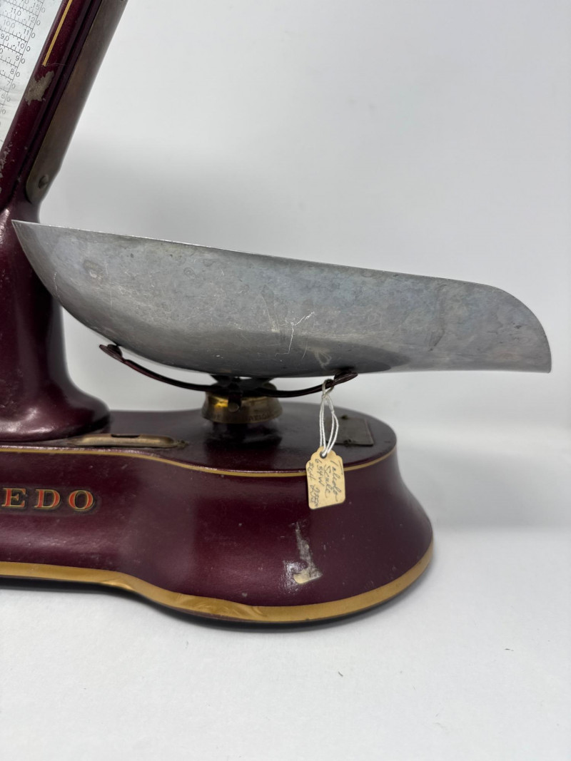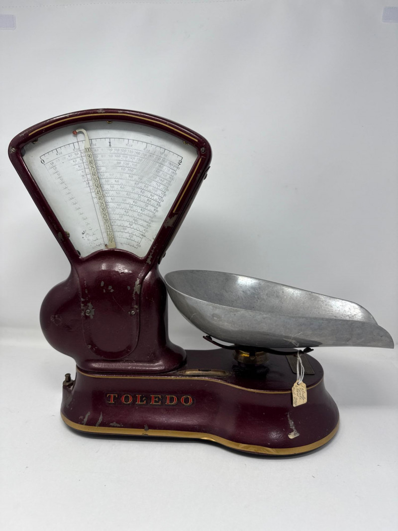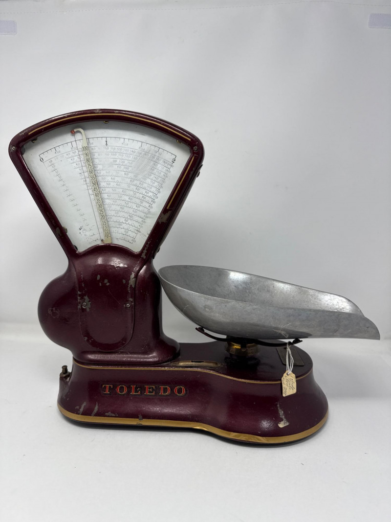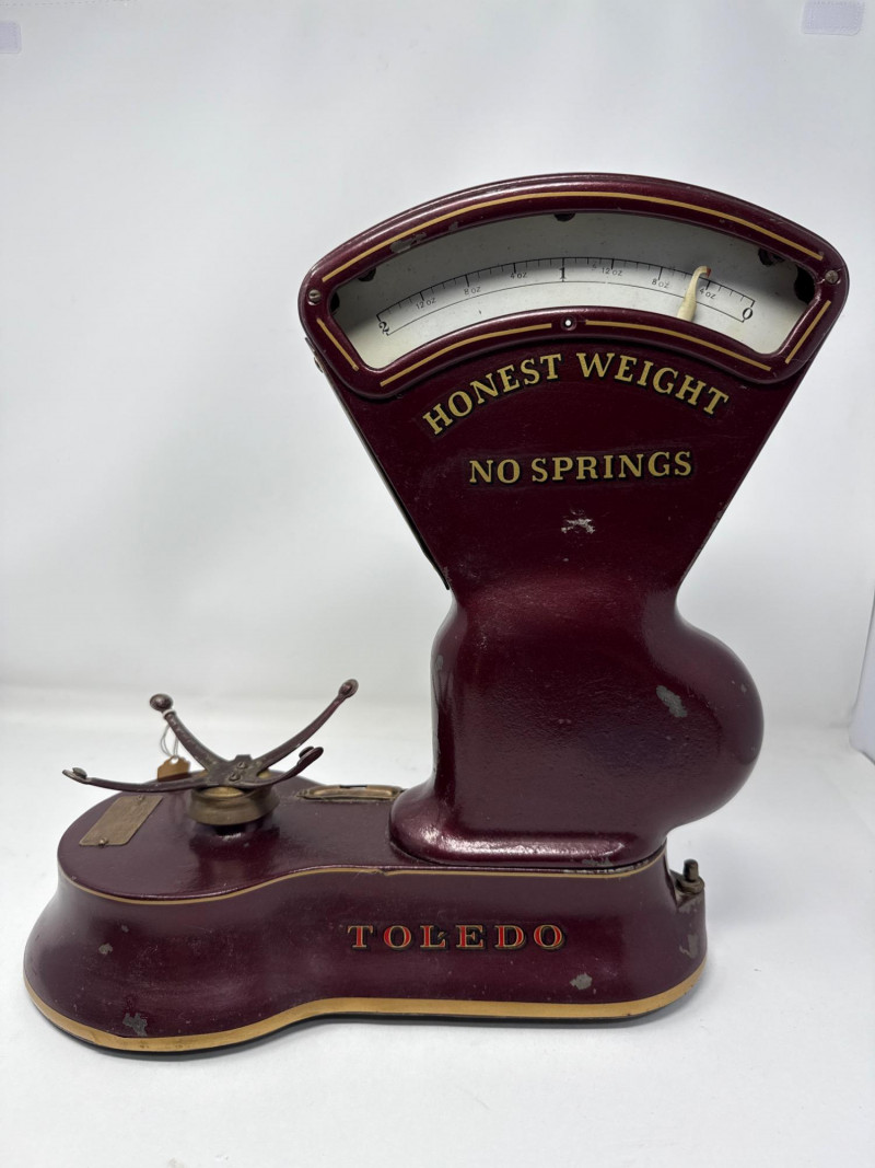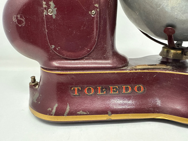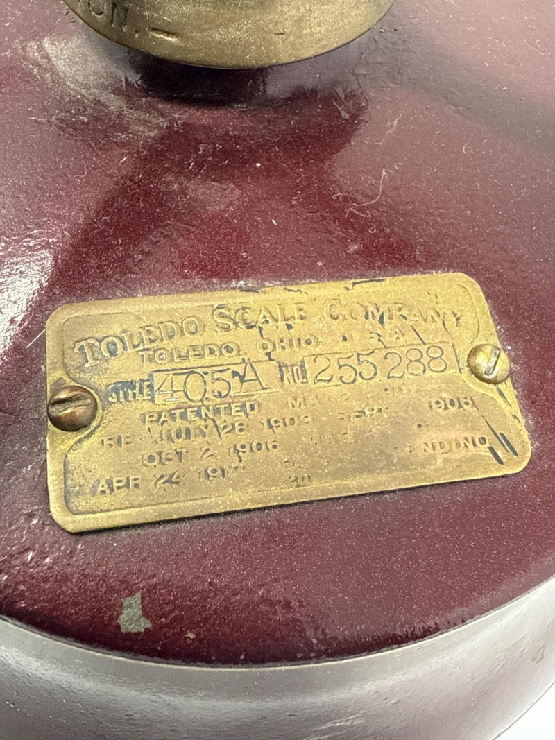 An early 20th-century mechanical scale manufactured by the Toledo Scale Company in Toledo, Ohio, USA. The brass identification plate displays patent dates from 1903 to 1917, confirming its period authenticity. This Model 405A features cast iron construction with a maroon enamel finish and gold trim. Dimensions: 16" L × 5.5" W × 15" H Features Cast iron body with original enamel and gold detailing Large glass-covered dial with graduated weight markings Removable aluminum scoop tray Embossed “TOLEDO” lettering on base Brass plate with model and serial number: Model 405A, No. 235288 Handwritten tag: “Toledo Scale 6.5 W Oct 1955” Condition Missing glass panel on the side that displays the “No Springs” slogan Surface wear and enamel loss consistent with age Mechanism untested; offered as a decorative collectible Historical Context: The Toledo Scale Company was a leader in scale innovation, particularly known for their "No Springs, Honest Weight" advertising slogan. This model would have been used in small businesses and retail counters for weighing produce, dry goods, or bulk items. The cast iron construction and enamel finish were designed for durability and accuracy.