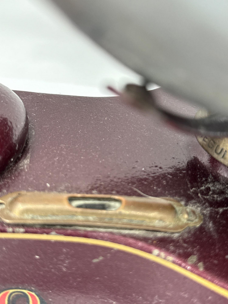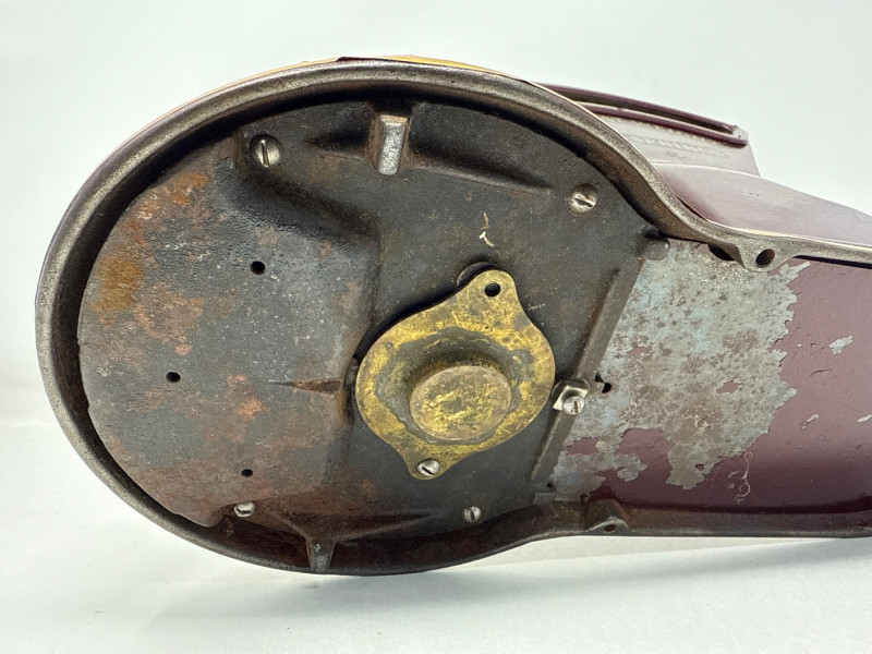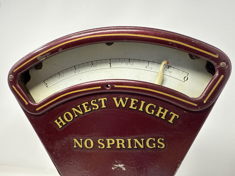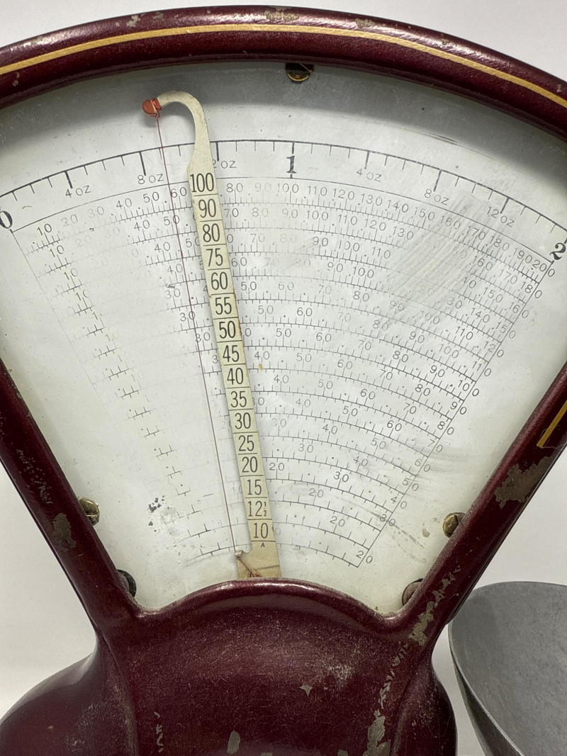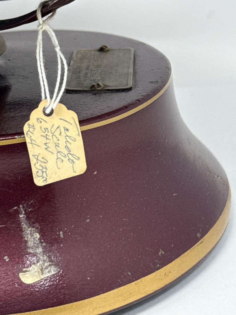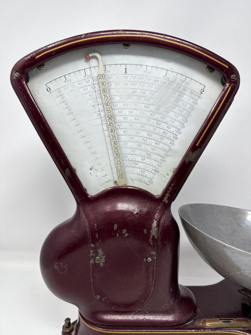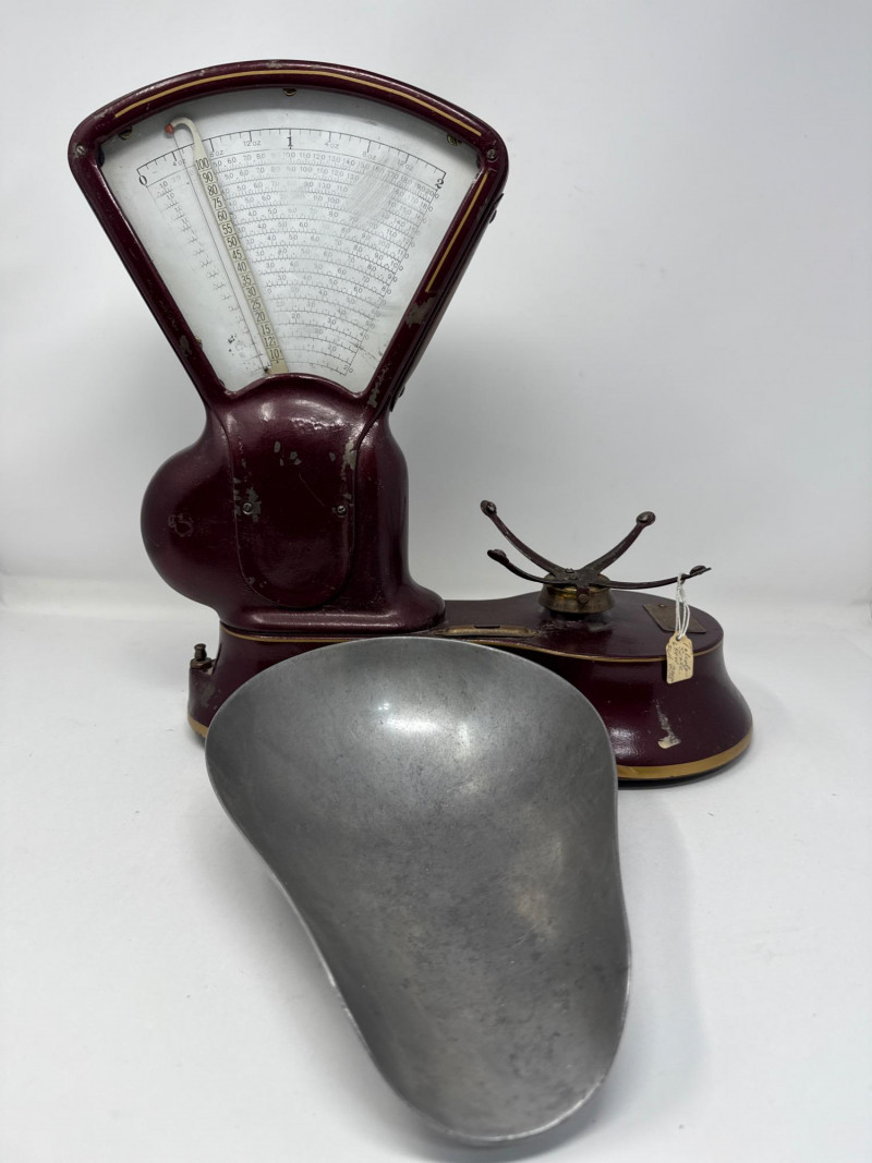 An early 20th-century mechanical scale manufactured by the Toledo Scale Company in Toledo, Ohio, USA. The brass identification plate displays patent dates from 1903 to 1917, confirming its period authenticity. This Model 405A features cast iron construction with a maroon enamel finish and gold trim. Dimensions: 16" L × 5.5" W × 15" H Features Cast iron body with original enamel and gold detailing Large glass-covered dial with graduated weight markings Removable aluminum scoop tray Embossed “TOLEDO” lettering on base Brass plate with model and serial number: Model 405A, No. 235288 Handwritten tag: “Toledo Scale 6.5 W Oct 1955” Condition Missing glass panel on the side that displays the “No Springs” slogan Surface wear and enamel loss consistent with age Mechanism untested; offered as a decorative collectible Historical Context: The Toledo Scale Company was a leader in scale innovation, particularly known for their "No Springs, Honest Weight" advertising slogan. This model would have been used in small businesses and retail counters for weighing produce, dry goods, or bulk items. The cast iron construction and enamel finish were designed for durability and accuracy.