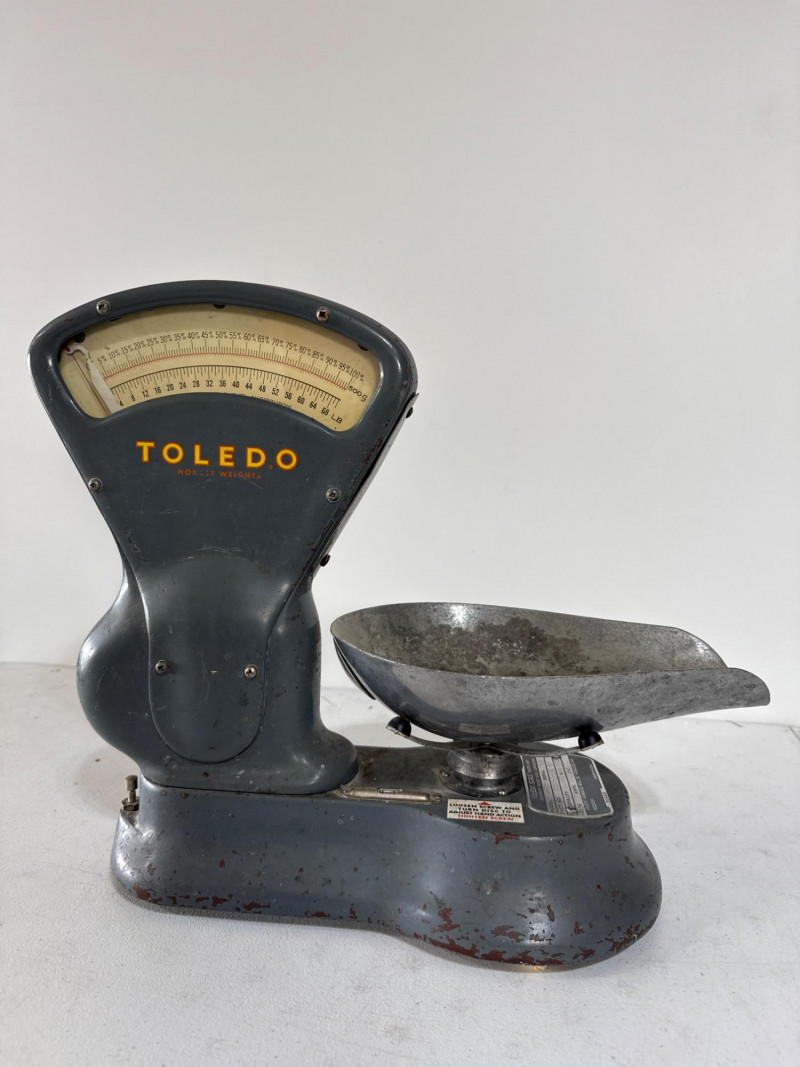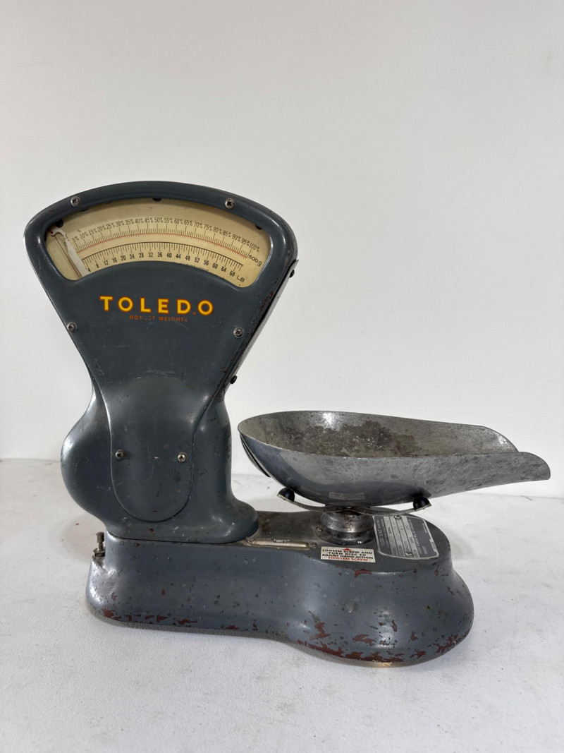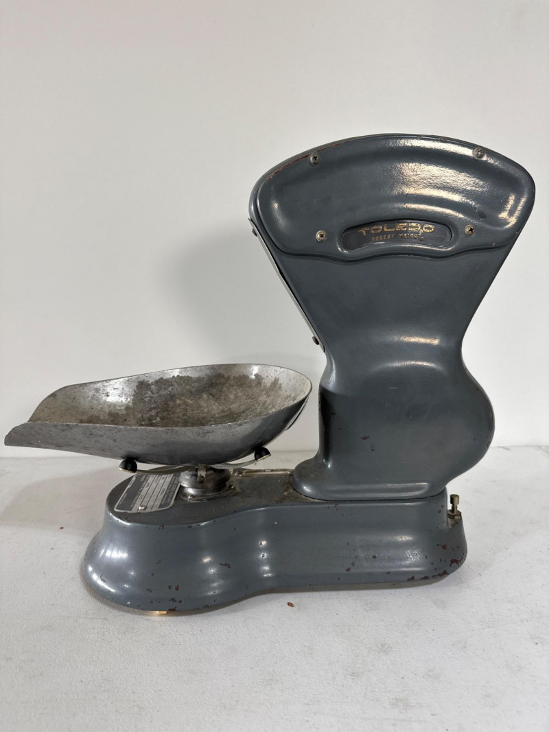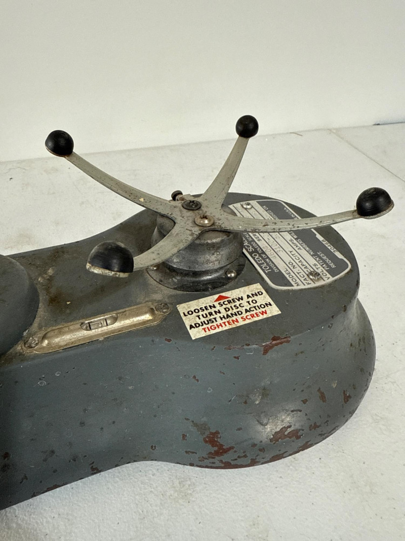 This mid-century bench scale by Toledo Scale Co. features a cast metal body in its original gray enamel finish, boldly marked “TOLEDO – Honest Weight.” The dial offers both pound and percentage readings, housed in a clear display that speaks to its precision engineering. Model: 4601 | Serial: 2980 | Capacity: 500g Factory No.: 31090-0034 BB Design: Removable scooped metal pan, factory decals intact, and original maker’s plate Condition: Authentic wear from decades of use—oxidation, paint loss, and surface marks add character without compromising integrity Size: 14" × 7" × 15" Founded in 1901 by Henry Theobald, the Toledo Scale Company revolutionized weighing technology with its “No Springs, Honest Weight” slogan—a nod to its gravity-based accuracy. Known for producing durable, high-precision scales, Toledo became a trusted name in industrial and retail environments across the U.S.