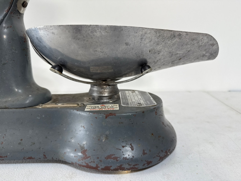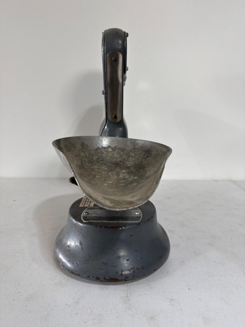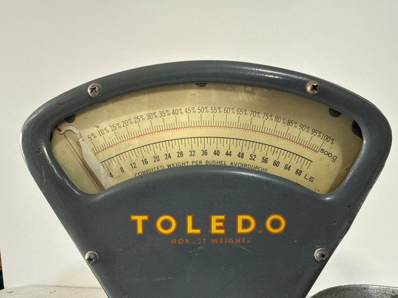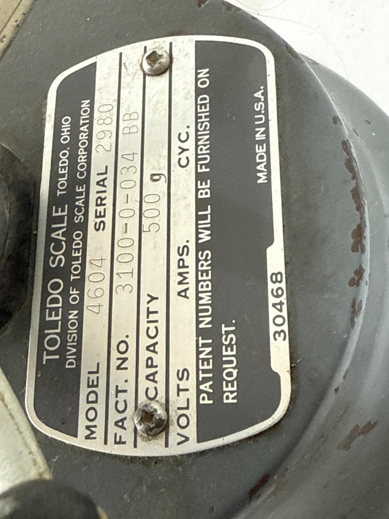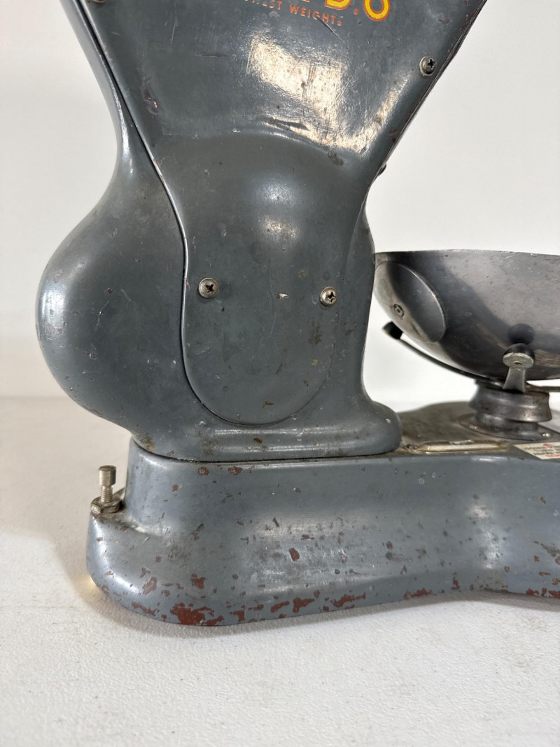 This mid-century bench scale by Toledo Scale Co. features a cast metal body in its original gray enamel finish, boldly marked “TOLEDO – Honest Weight.” The dial offers both pound and percentage readings, housed in a clear display that speaks to its precision engineering. Model: 4601 | Serial: 2980 | Capacity: 500g Factory No.: 31090-0034 BB Design: Removable scooped metal pan, factory decals intact, and original maker’s plate Condition: Authentic wear from decades of use—oxidation, paint loss, and surface marks add character without compromising integrity Size: 14" × 7" × 15" Founded in 1901 by Henry Theobald, the Toledo Scale Company revolutionized weighing technology with its “No Springs, Honest Weight” slogan—a nod to its gravity-based accuracy. Known for producing durable, high-precision scales, Toledo became a trusted name in industrial and retail environments across the U.S.