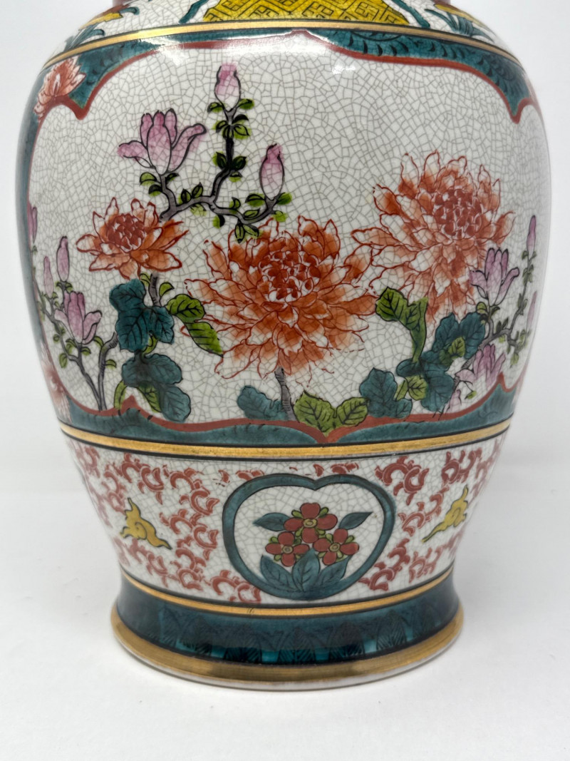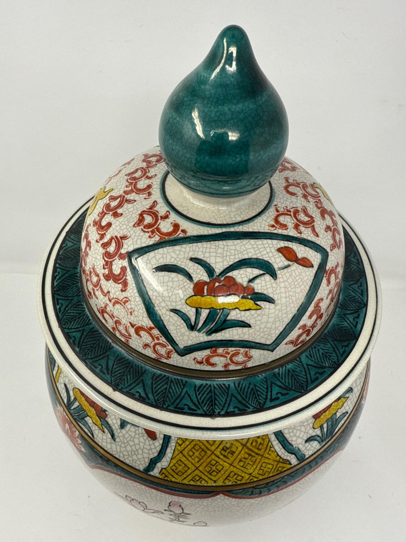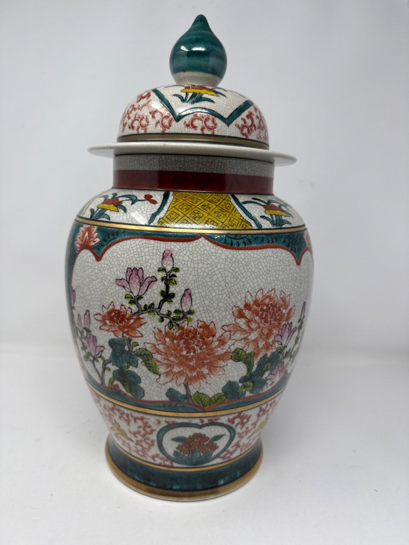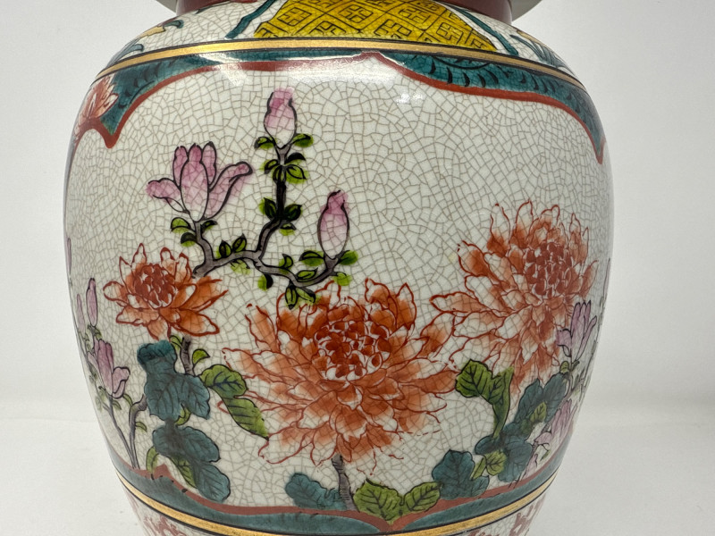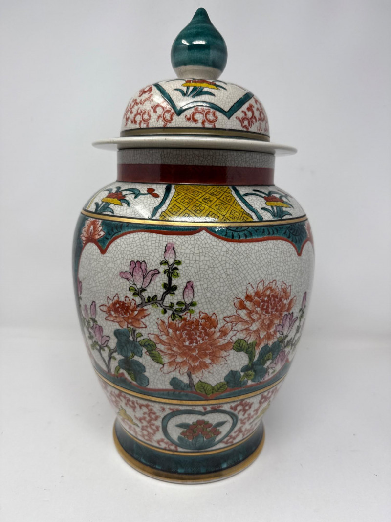 This decorative lidded jar showcases hand-painted chrysanthemums and magnolia blossoms across a crackle-glazed surface, framed by geometric borders and stylized floral cartouches. A domed lid with a green finial completes the design, echoing the jar’s vibrant palette of red, green, yellow, teal, and gold.