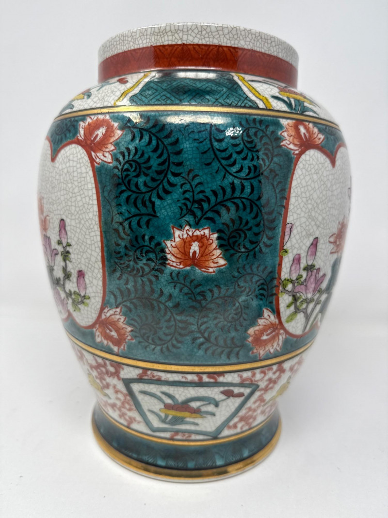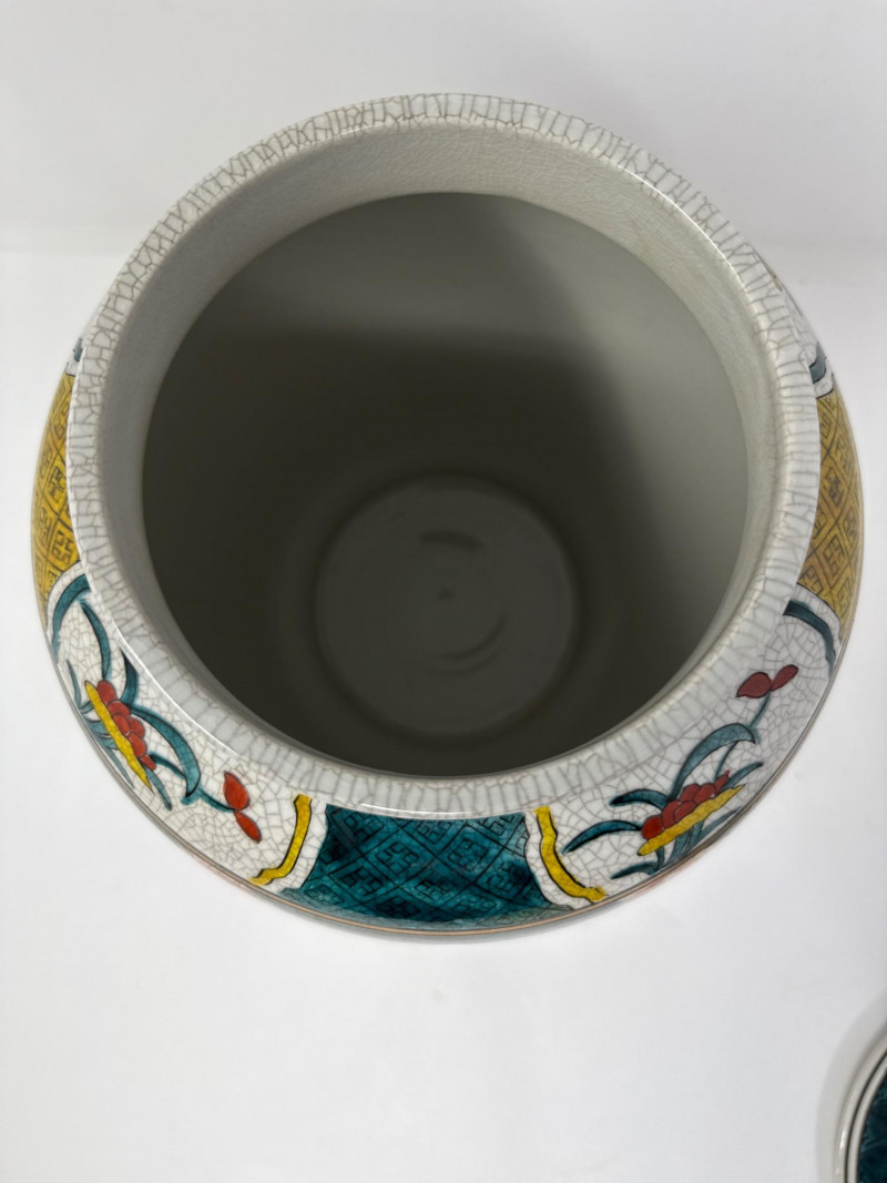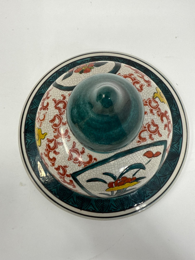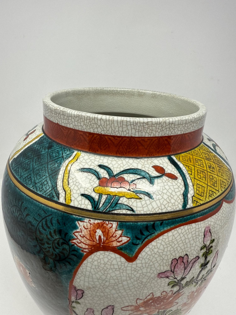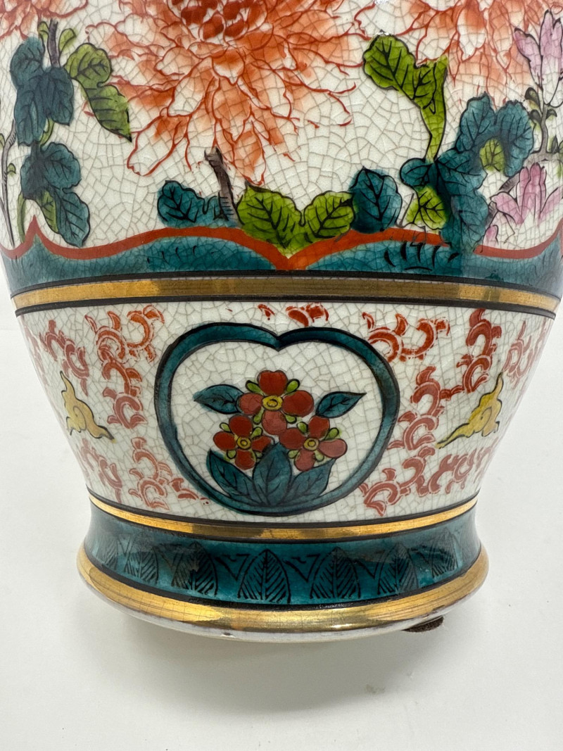This decorative lidded jar showcases hand-painted chrysanthemums and magnolia blossoms across a crackle-glazed surface, framed by geometric borders and stylized floral cartouches. A domed lid with a green finial completes the design, echoing the jar’s vibrant palette of red, green, yellow, teal, and gold.
