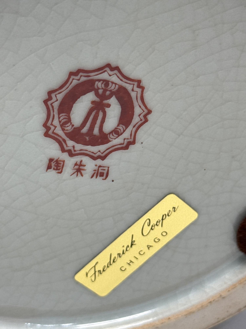 Marked on the underside with Chinese characters and a Frederick Cooper (Chicago) label, this piece reflects the mid-20th-century fusion of Eastern artistry and Western decorative trends. Dimensions: 8.5 in W x 16.5 in H Frederick Cooper, founded in Chicago in 1923, became known for elegant lighting and imported decorative arts. By the mid-20th century, the company was sourcing Asian porcelains like this jar, tailored for Western interiors. The label reflects Cooper’s legacy of blending artistry with refined home styling.