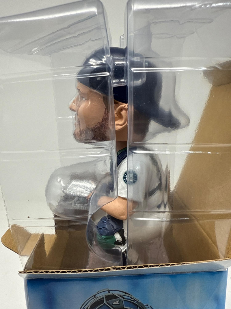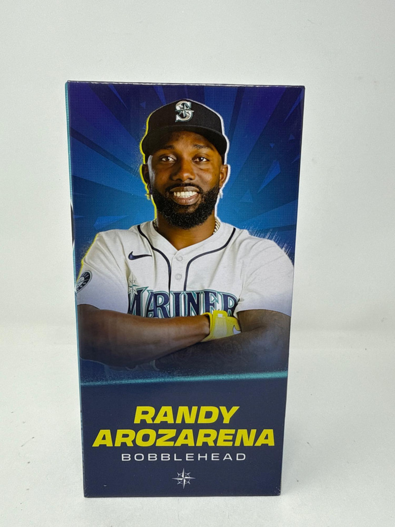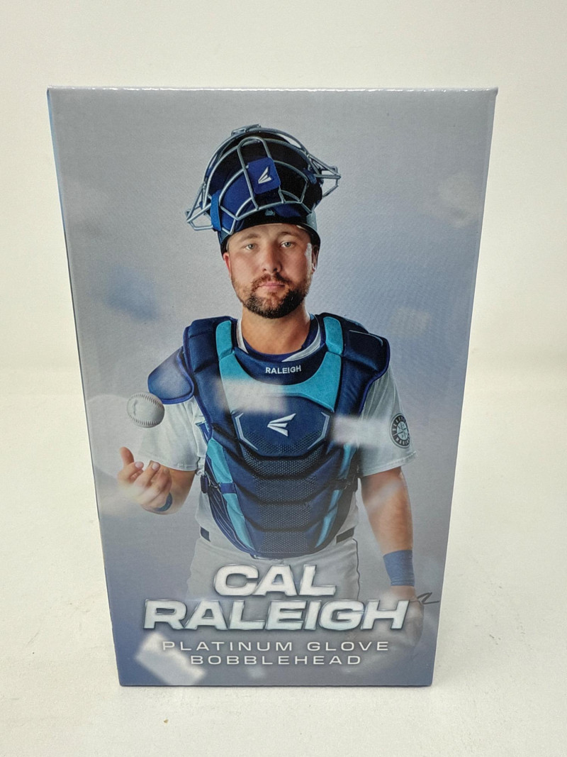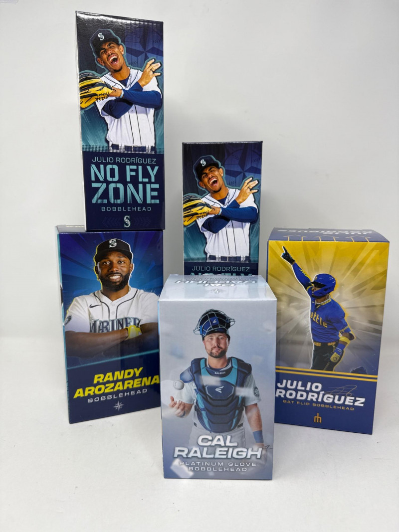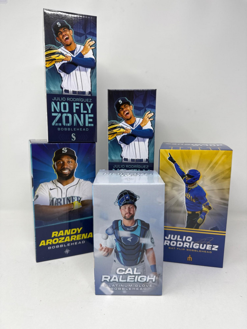 Five boxed bobbleheads featuring standout Major League Baseball players, each known for their impact on the field and fan-favorite status. This set includes a Platinum Glove edition of Cal Raleigh, a Bat Flip edition of Julio Rodríguez, and a Randy Arozarena figure in Mariners colors. Included Bobbleheads: Cal Raleigh “Platinum Glove” Bobblehead – Celebrates Raleigh’s elite defensive performance in 2022, when he led MLB catchers in caught stealing, framing runs, and defensive runs saved. The only catcher in American League history to win the Rawlings Platinum Glove. Three Julio Rodríguez “Bat Flip” Bobblehead – Captures Rodríguez’s swagger and explosive hitting style. A rising star with All-Star credentials and a highlight reel of clutch moments. Randy Arozarena Bobblehead – Known for his postseason heroics and electric energy, Arozarena appears here in a Mariners jersey, adding a unique twist for fans and collectors. Condition:
