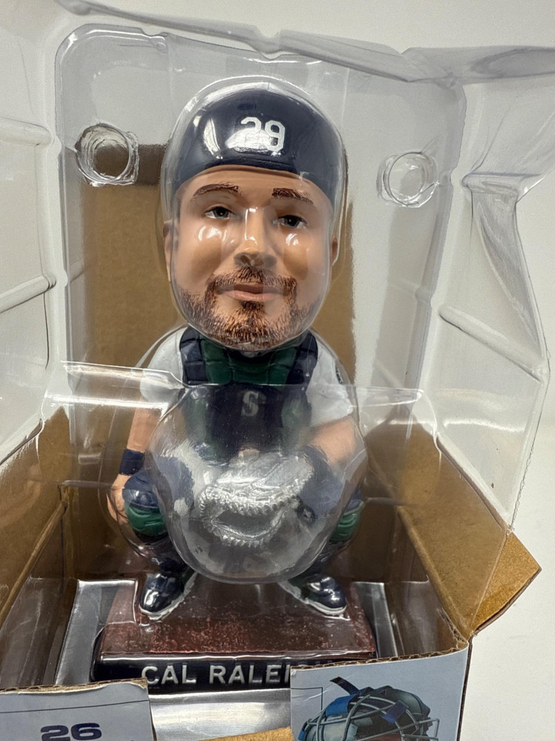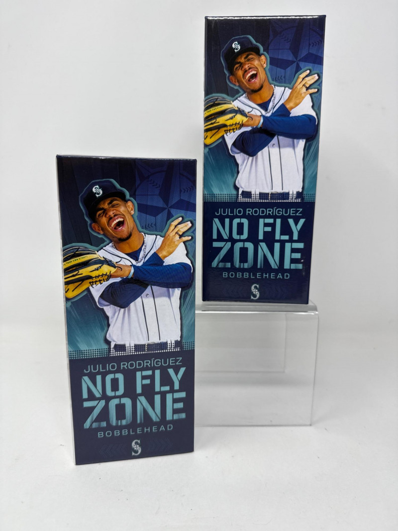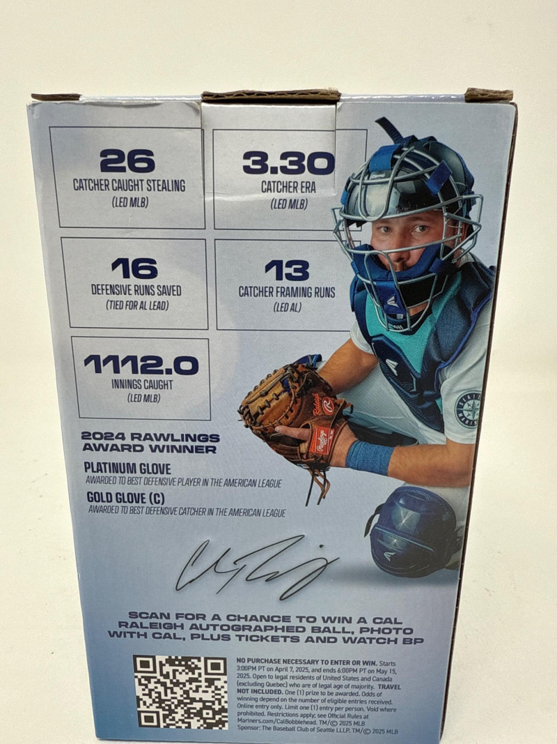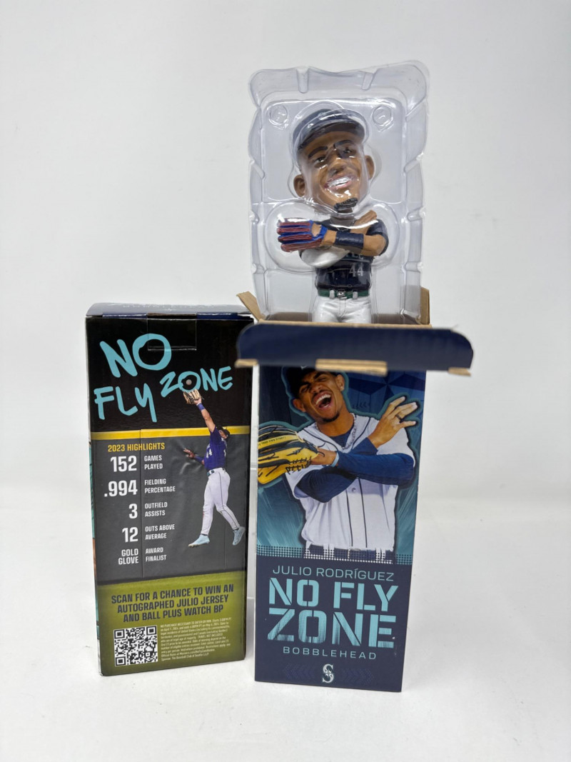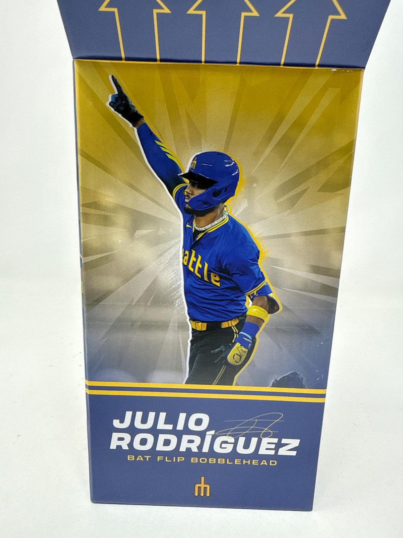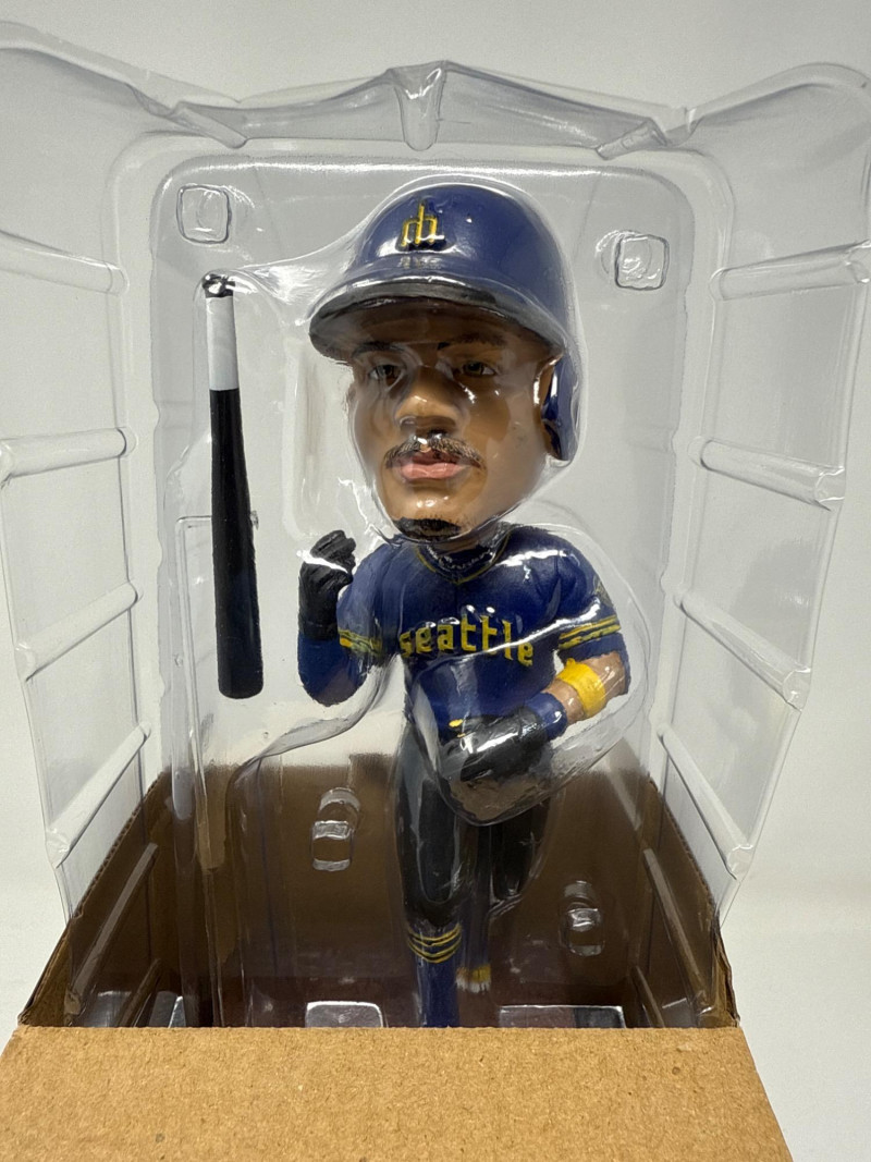 Five boxed bobbleheads featuring standout Major League Baseball players, each known for their impact on the field and fan-favorite status. This set includes a Platinum Glove edition of Cal Raleigh, a Bat Flip edition of Julio Rodríguez, and a Randy Arozarena figure in Mariners colors. Included Bobbleheads: Cal Raleigh “Platinum Glove” Bobblehead – Celebrates Raleigh’s elite defensive performance in 2022, when he led MLB catchers in caught stealing, framing runs, and defensive runs saved. The only catcher in American League history to win the Rawlings Platinum Glove. Three Julio Rodríguez “Bat Flip” Bobblehead – Captures Rodríguez’s swagger and explosive hitting style. A rising star with All-Star credentials and a highlight reel of clutch moments. Randy Arozarena Bobblehead – Known for his postseason heroics and electric energy, Arozarena appears here in a Mariners jersey, adding a unique twist for fans and collectors. Condition: