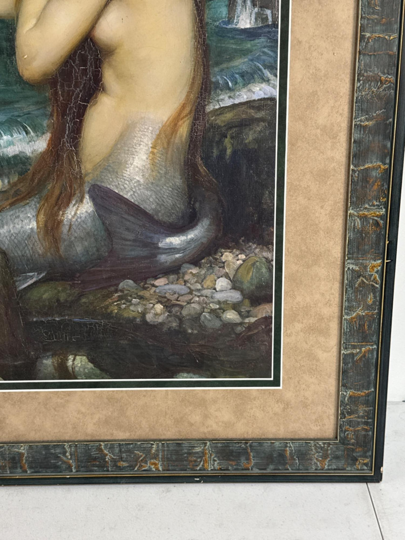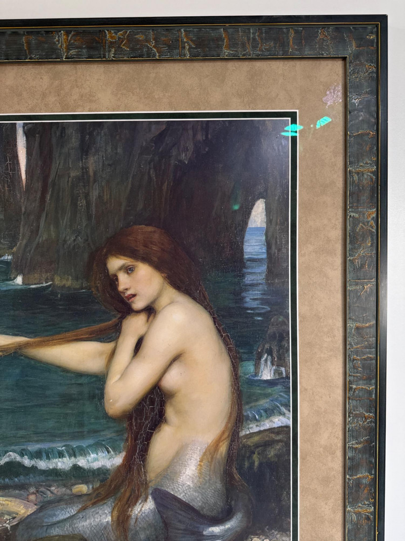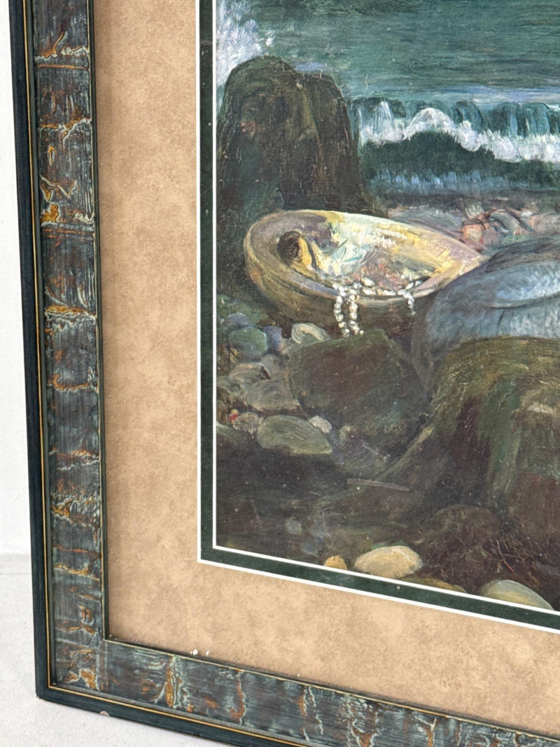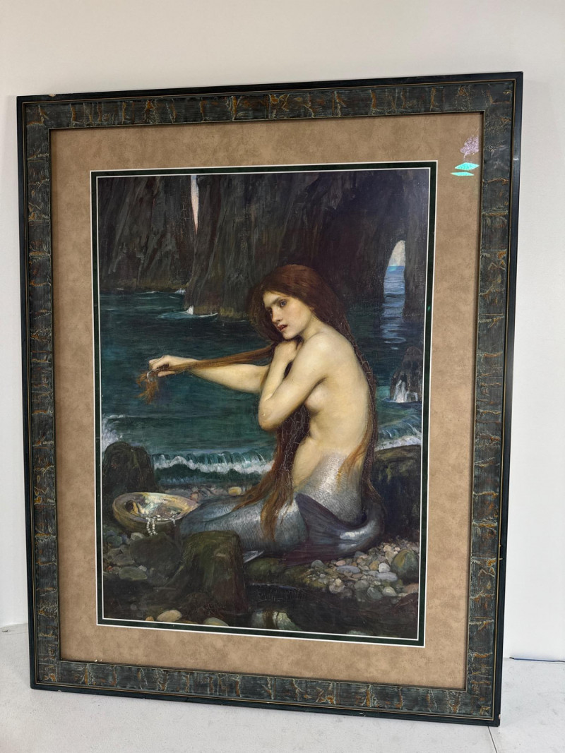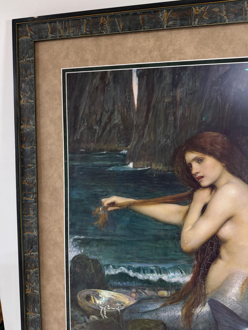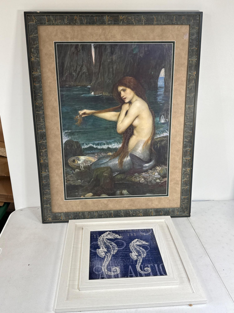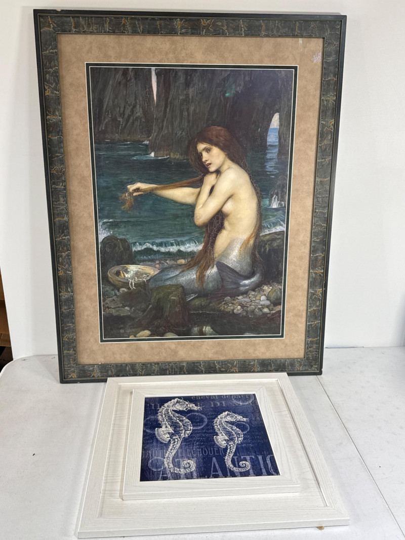 A coastal-inspired art pairing that blends mythological elegance with modern marine design: Reproduction of Waterhouse’s iconic 1900 painting, originally in the Tate collection. Depicts a mermaid seated on a rocky shore, combing her auburn hair beside a shell basin of pearls. Framed in a double mat with a wide decorative outer frame in muted brown and green tones. Framed dimensions: approx. 29.5" W × 38" H. Contemporary giclée print featuring two stylized white seahorses on a deep navy textured background with layered script. Presented in a wide whitewashed wood frame for a clean coastal look. Framed dimensions: approx. 20" W × 20" H. Both are modern prints (not original artworks). Frames and glass in very good condition with only minor wear from display. A Mermaid remains one of Waterhouse’s most recognized mythological subjects, widely reproduced in fine art collections. Navy Sea Horses offers a fresh nautical contrast, making this duo ideal for beach house décor, gallery walls, or themed interiors. A Mermaid by John William Waterhouse (1849–1917) – Framed Reproduction Print