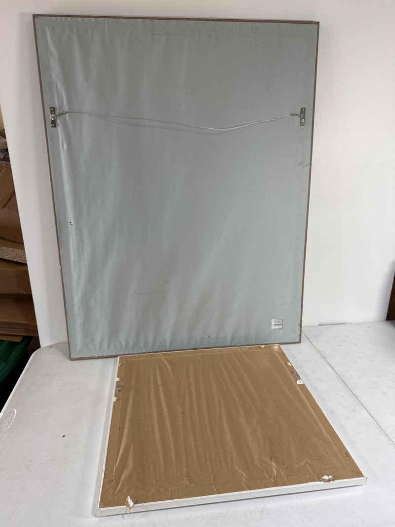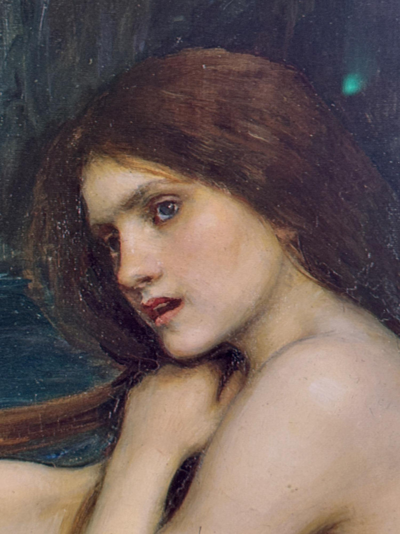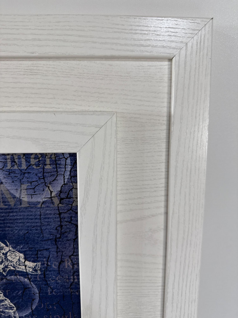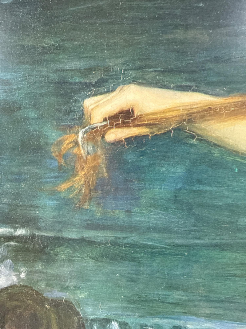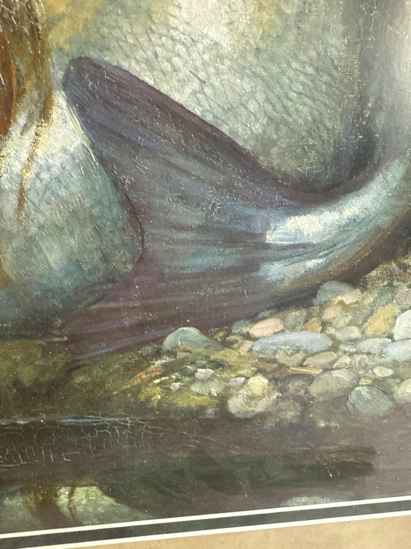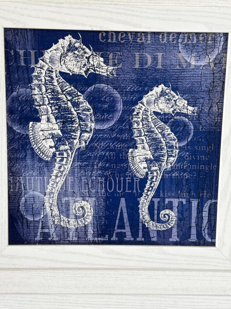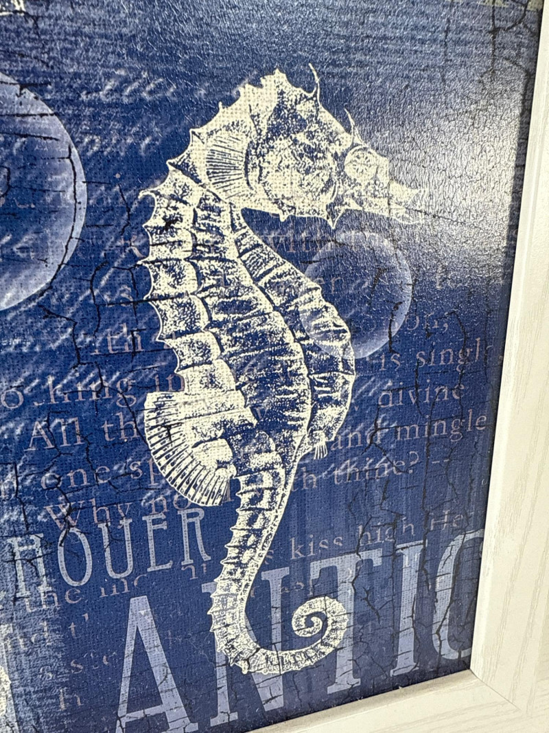 A coastal-inspired art pairing that blends mythological elegance with modern marine design: Reproduction of Waterhouse’s iconic 1900 painting, originally in the Tate collection. Depicts a mermaid seated on a rocky shore, combing her auburn hair beside a shell basin of pearls. Framed in a double mat with a wide decorative outer frame in muted brown and green tones. Framed dimensions: approx. 29.5" W × 38" H. Contemporary giclée print featuring two stylized white seahorses on a deep navy textured background with layered script. Presented in a wide whitewashed wood frame for a clean coastal look. Framed dimensions: approx. 20" W × 20" H. Both are modern prints (not original artworks). Frames and glass in very good condition with only minor wear from display. A Mermaid remains one of Waterhouse’s most recognized mythological subjects, widely reproduced in fine art collections. Navy Sea Horses offers a fresh nautical contrast, making this duo ideal for beach house décor, gallery walls, or themed interiors. A Mermaid by John William Waterhouse (1849–1917) – Framed Reproduction Print