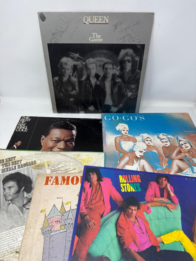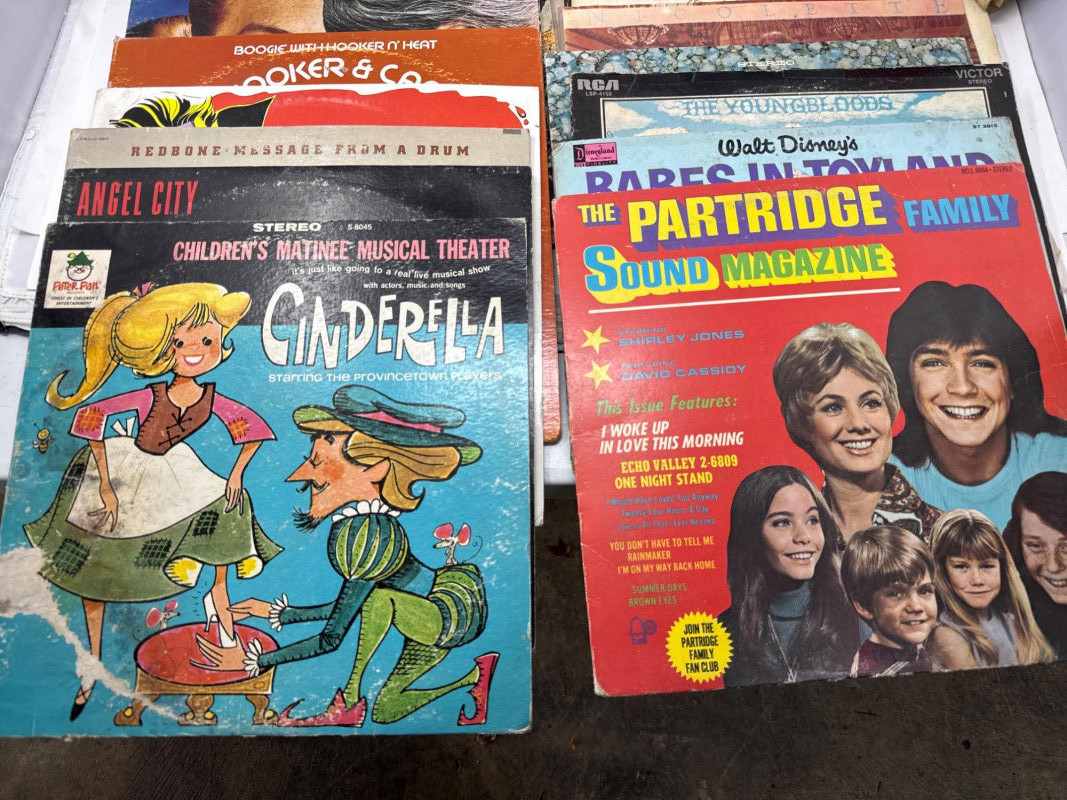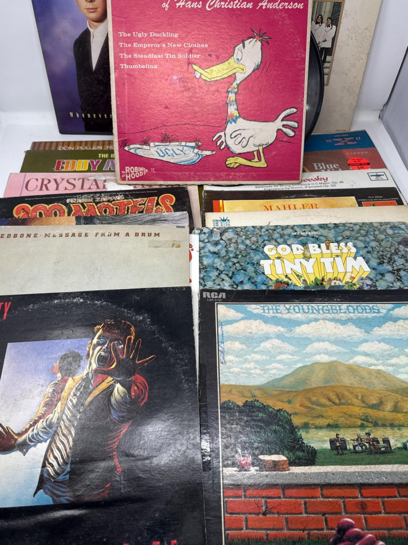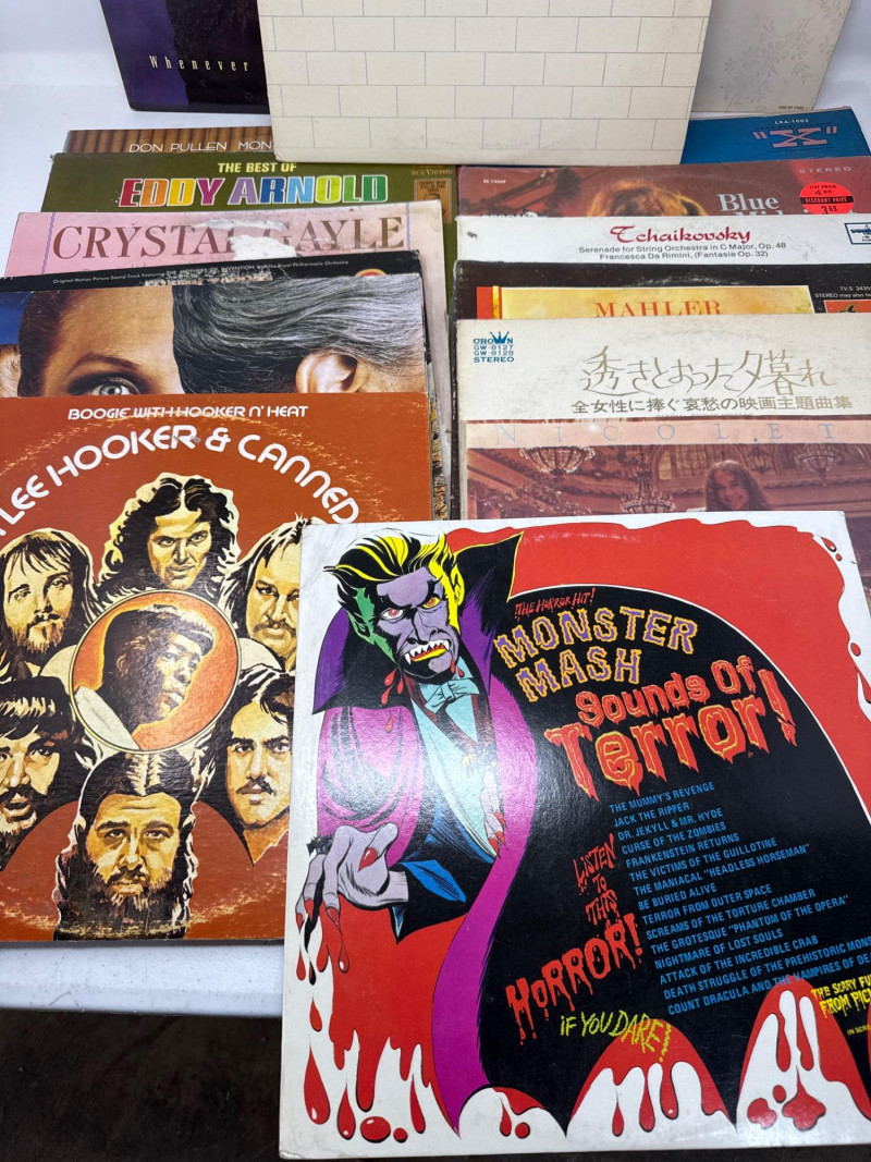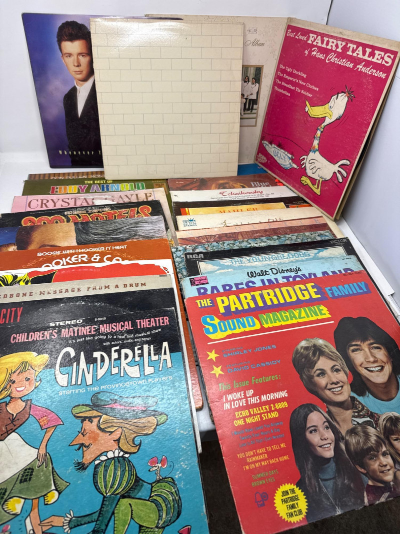 A nostalgic and genre-spanning assortment of vintage vinyl LPs and album covers, featuring rock, pop, jazz, country, and children’s recordings. This mixed lot includes iconic titles from legendary artists alongside charming family favorites — ideal for collectors, decorators, or vinyl enthusiasts seeking variety. Pink Floyd – The Wall (Columbia, double LP, gatefold cover with illustrated inner sleeves) The Rolling Stones – Dirty Work (CBS Records, 1986, vibrant cover art) insert only Rick Astley – Whenever You Need Somebody (RCA Records, includes “Never Gonna Give You Up”) Merle Haggard – The Best of the Best (Capitol Records, country classic) Crystal Gayle – The Best of Crystal Gayle Eddy Arnold – The Best Of Eddy Arnold John Lee Hooker & Canned Heat – Hooker ‘n Heat Frank Zappa – 200 Motels (United Artists, original motion picture soundtrack, 2 LP set) Mahler – Symphony No. 1 “Titan” Includes vintage titles such as Cinderella (Children’s Matinee Musical Theater), Hans Christian Andersen Fairy Tales, The Partridge Family Sound Magazine, Walt Disney’s Babes in Toyland, Monster Mash – Sounds of Terror, and others. Queen – The Game, The Go-Go’s – Beauty and the Beat, and Nat King Cole – The Best of Nat King Cole, Rolling Stones are album covers only — vinyl records are not included for these titles. Vinyl condition ranges from fair to good, with visible wear and some scratches noted. Album covers show shelf wear, edge wear, and light staining consistent with age and handling. Please refer to photos for close-up details and specific condition indicators. A well-rounded lot offering both classic rock essentials and vintage children’s LPs, with added decorative value from collectible covers. Perfect for display, listening, or nostalgic gifting. Highlights Include: