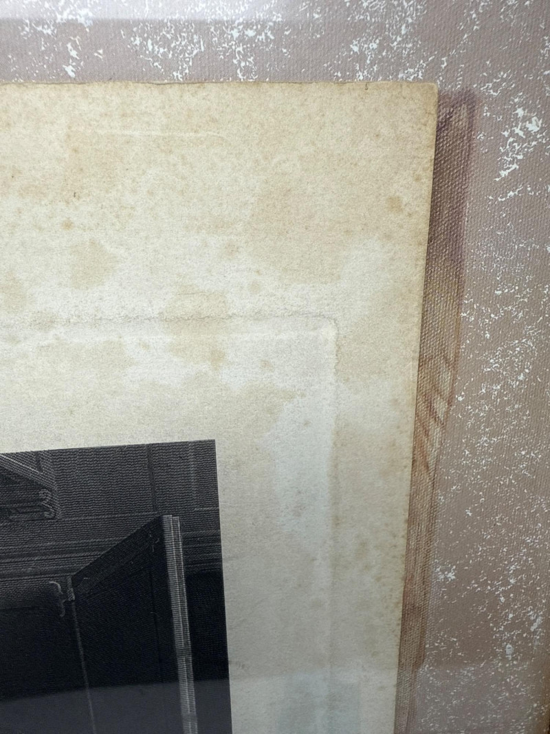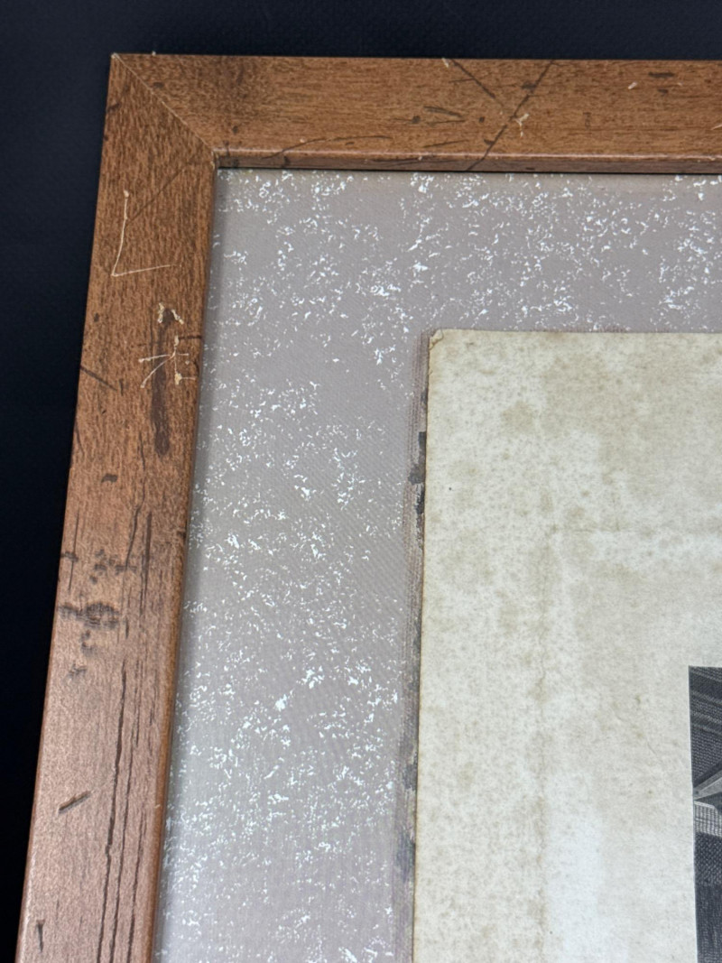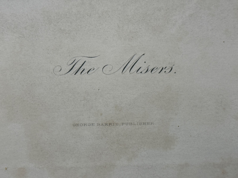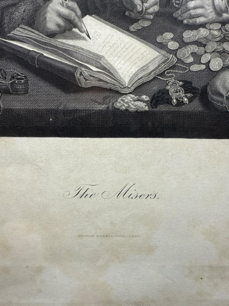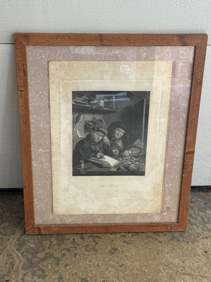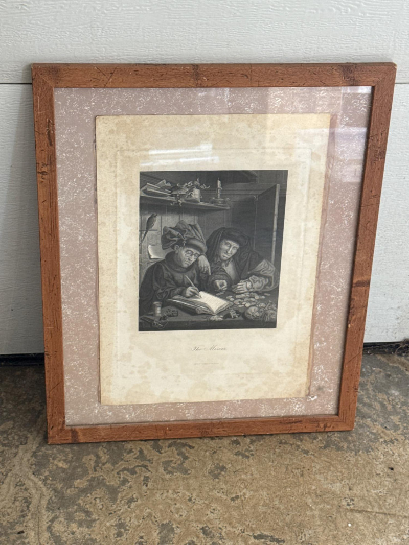 A produced print titled The Misers, based on the original painting by Flemish Renaissance artist Quentin Matsys (1466–1530). This version reproduces the 19th-century engraving by Herbert Bourne, and was published by George Barrie of Philadelphia—renowned for high-quality art prints and reproductions of Old Master works. The image depicts two figures hunched over a ledger, surrounded by coins and valuables—a classic allegory of greed and avarice, popular in Northern Renaissance art. The print shows strong contrast and fine detail, reflecting the precision of Bourne’s original engraving. Presented under glass in a simple wood frame with a wide mat showing foxing and age-related discoloration. A collectible example of late 19th-century art publishing, blending Renaissance iconography with Victorian-era printmaking traditions.