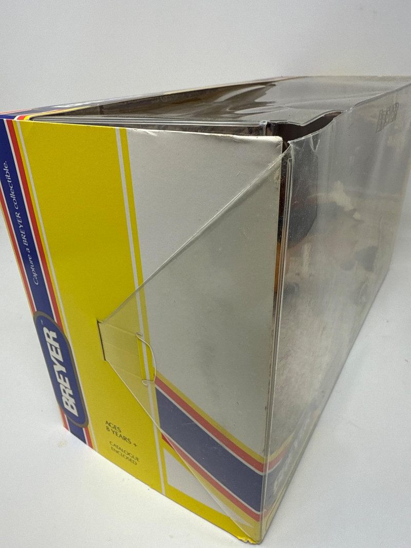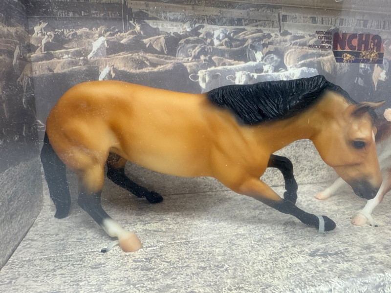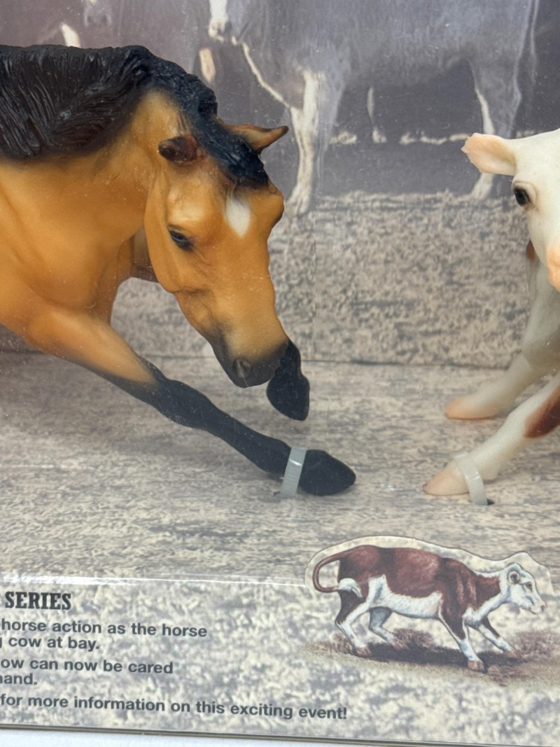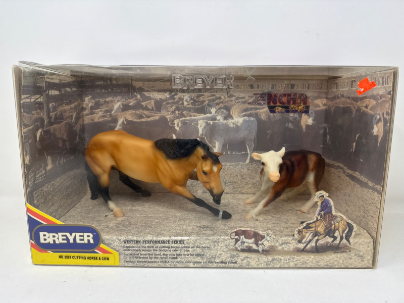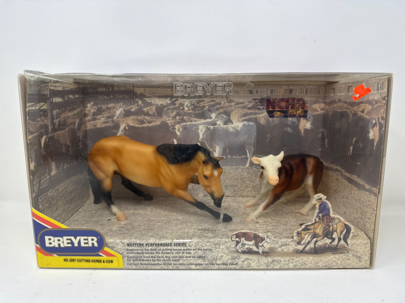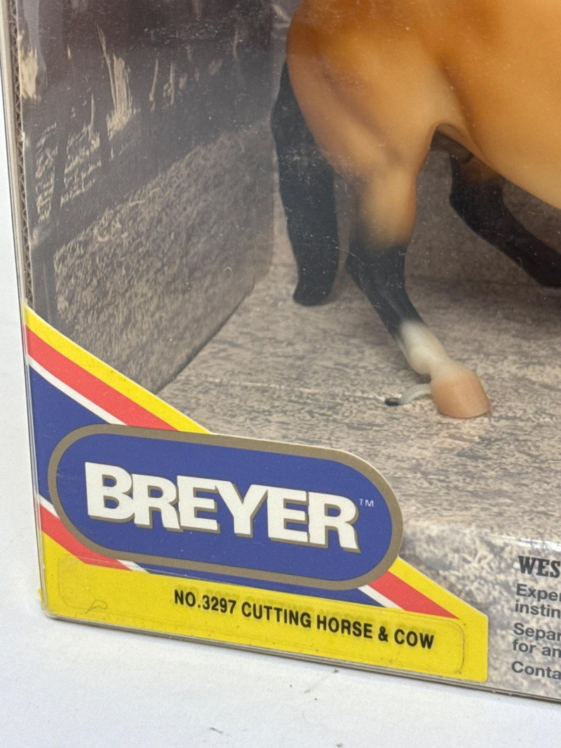 This Breyer model features a dynamic duo from the world of western riding: a tan and black cutting horse in mid-action pose and a brown-and-white cow, both rendered in realistic scale and detail. The backdrop inside the box depicts a cattle pen scene, enhancing the authenticity and storytelling appeal of the set. A small illustration in the lower corner shows a cowboy herding cattle with a dog, reinforcing the working ranch theme. The packaging includes the official Breyer logo and a red price sticker, with the NCHA logo confirming its tie-in to professional cutting horse competitions. The horse model displays expressive musculature and motion, while the cow adds context and realism to the scene. This set is ideal for collectors of Breyer figures, western memorabilia, or equestrian-themed toys. Notable Features: Official NCHA branding Highly detailed horse and cow figures Original packaging with illustrated western scene Collectible model number: 1327