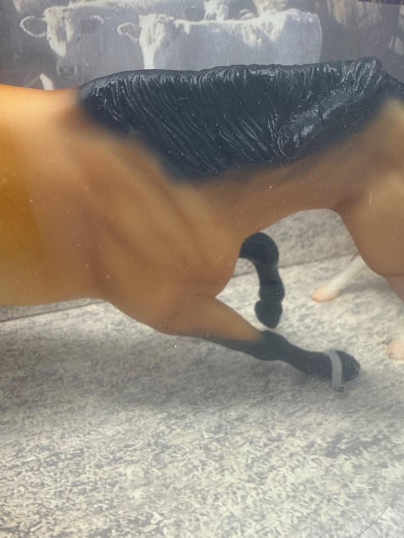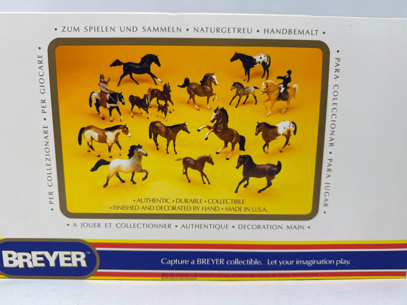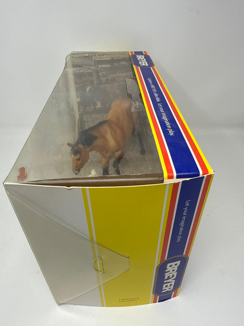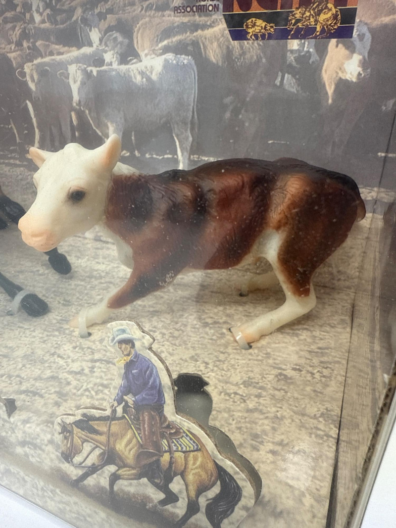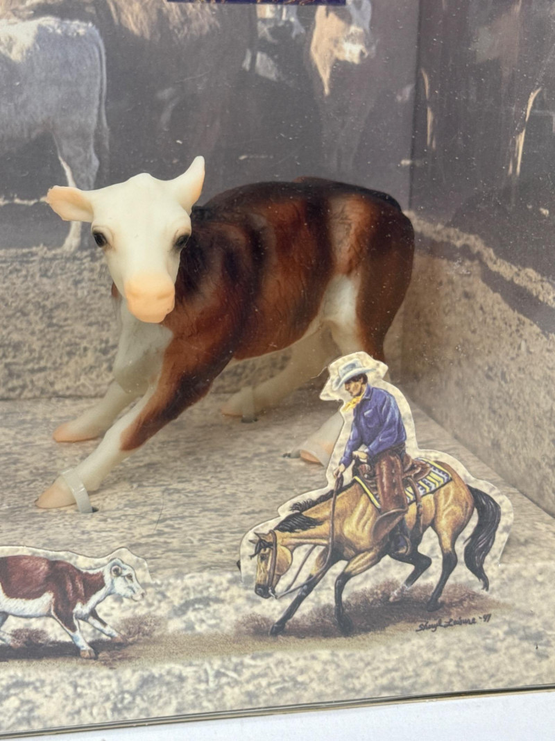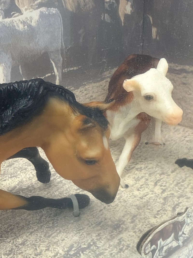 This Breyer model features a dynamic duo from the world of western riding: a tan and black cutting horse in mid-action pose and a brown-and-white cow, both rendered in realistic scale and detail. The backdrop inside the box depicts a cattle pen scene, enhancing the authenticity and storytelling appeal of the set. A small illustration in the lower corner shows a cowboy herding cattle with a dog, reinforcing the working ranch theme. The packaging includes the official Breyer logo and a red price sticker, with the NCHA logo confirming its tie-in to professional cutting horse competitions. The horse model displays expressive musculature and motion, while the cow adds context and realism to the scene. This set is ideal for collectors of Breyer figures, western memorabilia, or equestrian-themed toys. Notable Features: Official NCHA branding Highly detailed horse and cow figures Original packaging with illustrated western scene Collectible model number: 1327