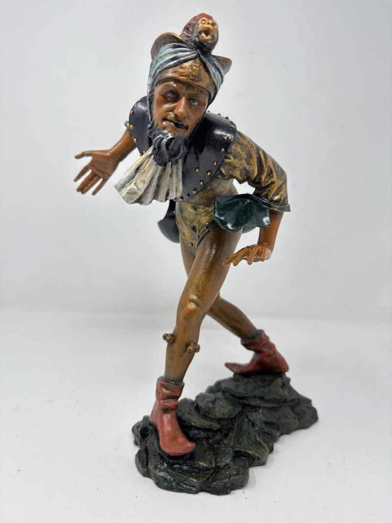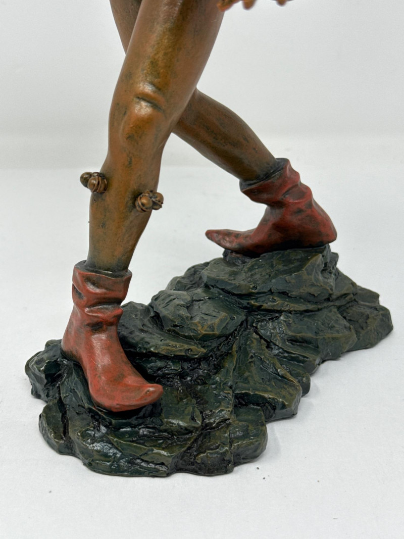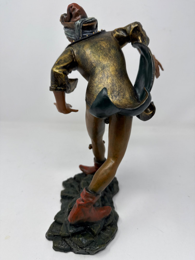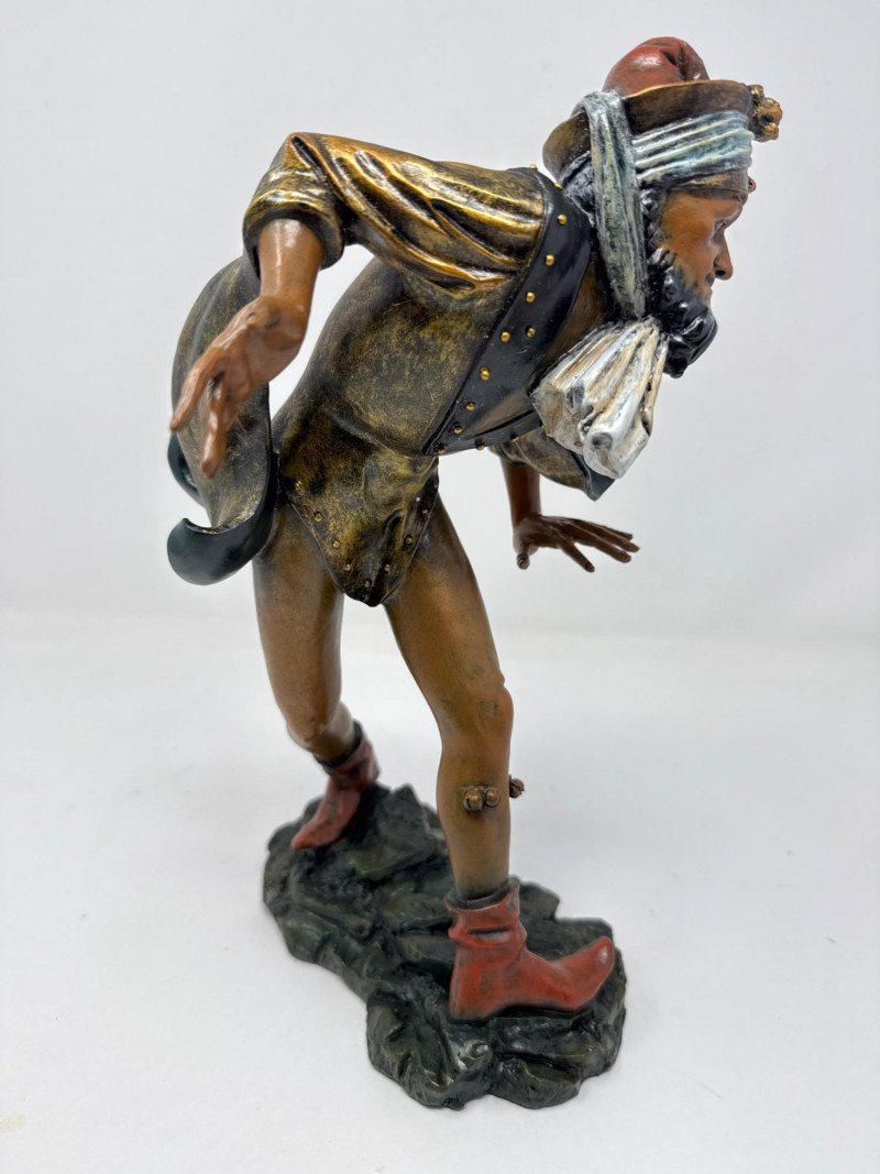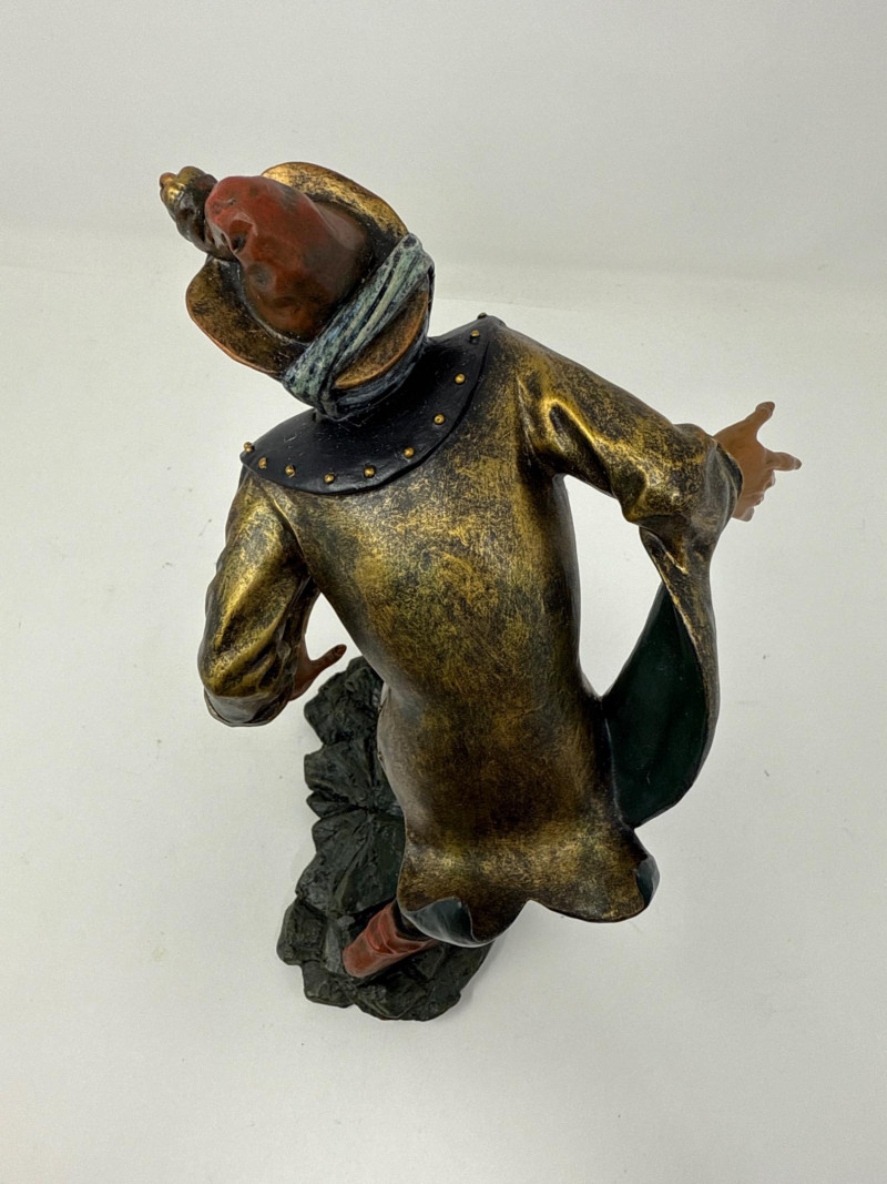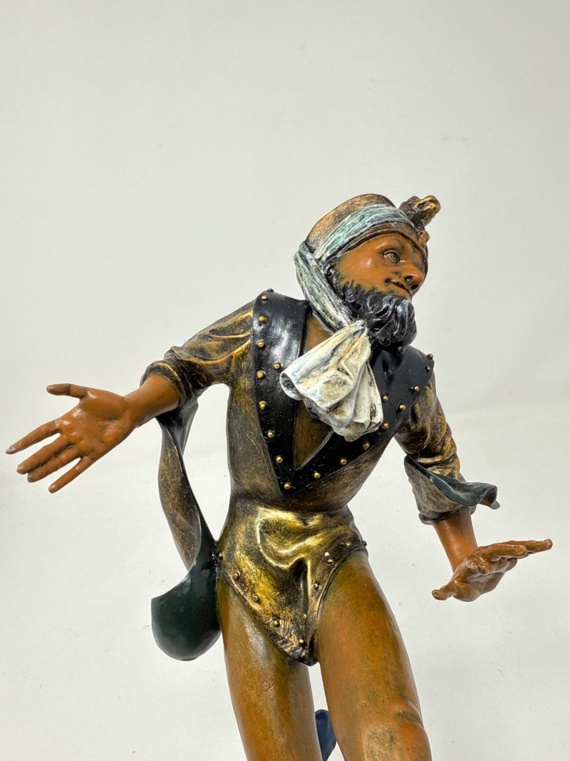 A replica inspired by Erasmus Grasser’s iconic Moriskentänzer figures, originally sculpted circa 1480 for Munich’s Old Town Hall. This figure echoes the dynamic posture and ornate costume of the historical Moorish dancers, complete with bell accents and stylized movement. The design references the Betley window and is part of a tradition that influenced Morri's dancing across Europe. Dimensions: 12" H × 8" L × 7" W Material: Painted composite with metallic detailing Condition: New in box (NIB); no visible flaws Provenance Note: Modeled after the Die Moriskentänzer figures housed in the Münchener Stadtmuseum Historical Reference: Erasmus Grasser’s Morisken dancers are considered foundational to European dance iconography, as discussed in Francis Douce’s Illustrations of Shakespeare and of Ancient Manners (1807)