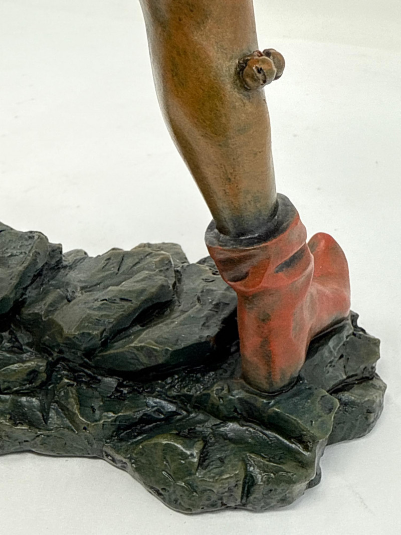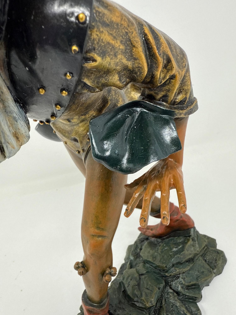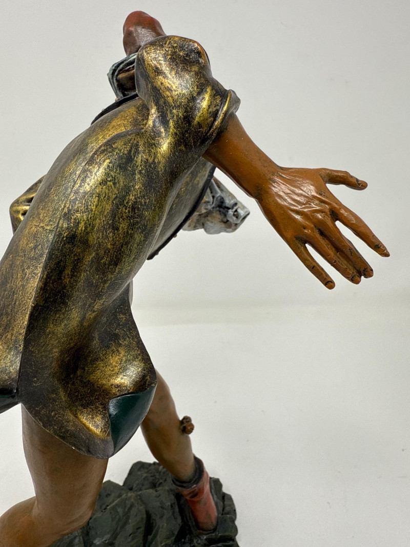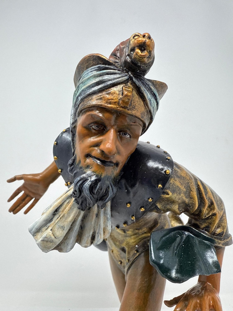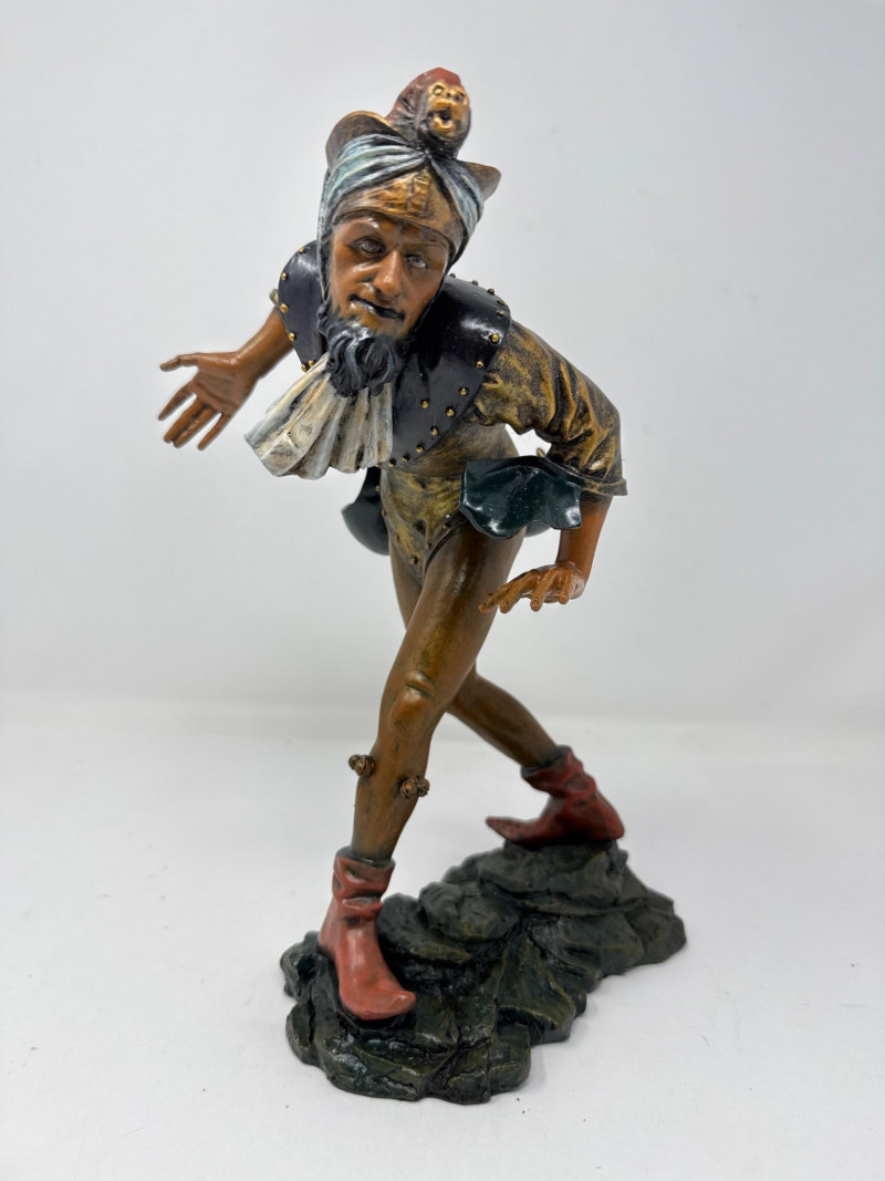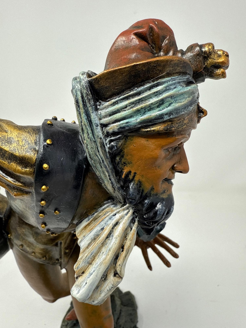 A replica inspired by Erasmus Grasser’s iconic Moriskentänzer figures, originally sculpted circa 1480 for Munich’s Old Town Hall. This figure echoes the dynamic posture and ornate costume of the historical Moorish dancers, complete with bell accents and stylized movement. The design references the Betley window and is part of a tradition that influenced Morri's dancing across Europe. Dimensions: 12" H × 8" L × 7" W Material: Painted composite with metallic detailing Condition: New in box (NIB); no visible flaws Provenance Note: Modeled after the Die Moriskentänzer figures housed in the Münchener Stadtmuseum Historical Reference: Erasmus Grasser’s Morisken dancers are considered foundational to European dance iconography, as discussed in Francis Douce’s Illustrations of Shakespeare and of Ancient Manners (1807)