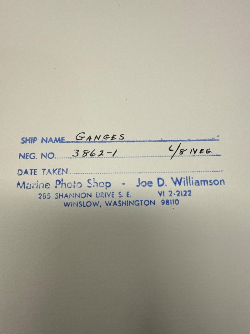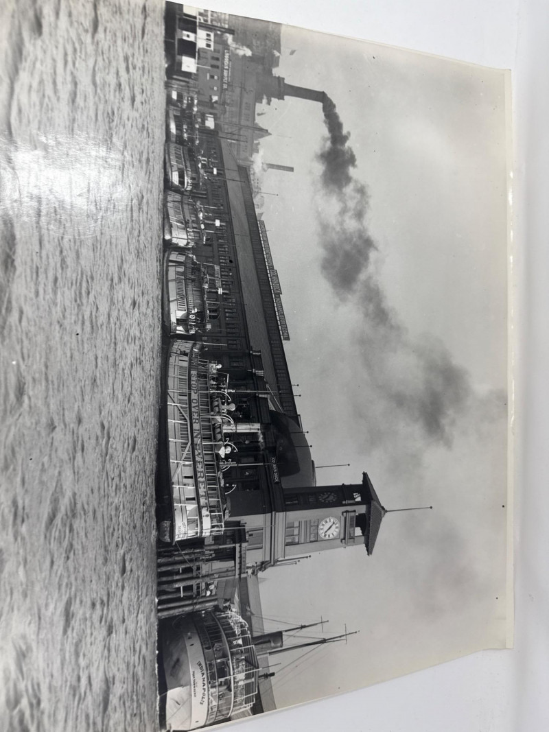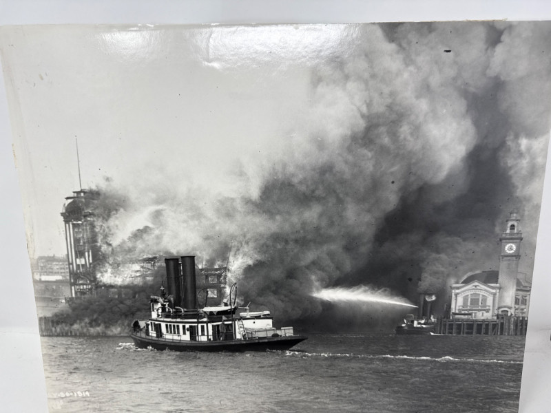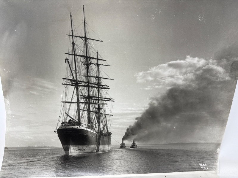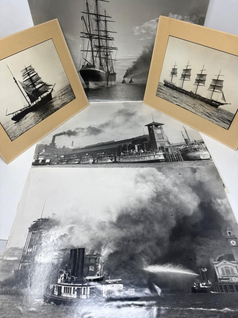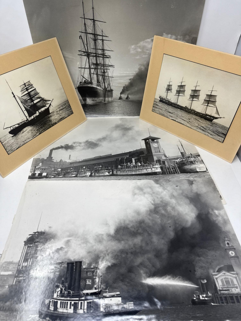 Five evocative black-and-white prints documenting Pacific Northwest maritime history, including tall ships, tugboats, and the dramatic 1914 Seattle waterfront fire. Tall Ship Portraits (2) – Mounted prints of four-masted sailing vessels under full sail, including the Ganges, captured by renowned maritime photographer Joe D. Williamson. Studio stamp and negative numbers present. Ship with Tugboats – Photograph of a towering square-rigged ship escorted by steam-powered tugboats, trailing smoke across open waters. Seattle Waterfront Fire (1914) – Striking image showing thick smoke plumes and a fireboat in action near Colman Dock. Period signage references steamers and battleships. Additional Scenes – Views of the Fremont Bridge, Seattle waterfront, and working tugboats—capturing the transition from sail to steam. Marine Photo Shop – Joe D. Williamson, Winslow, WA. Williamson was a key chronicler of Pacific Northwest maritime life, and his studio stamps and catalog notations add historical depth and authenticity.Highlights: