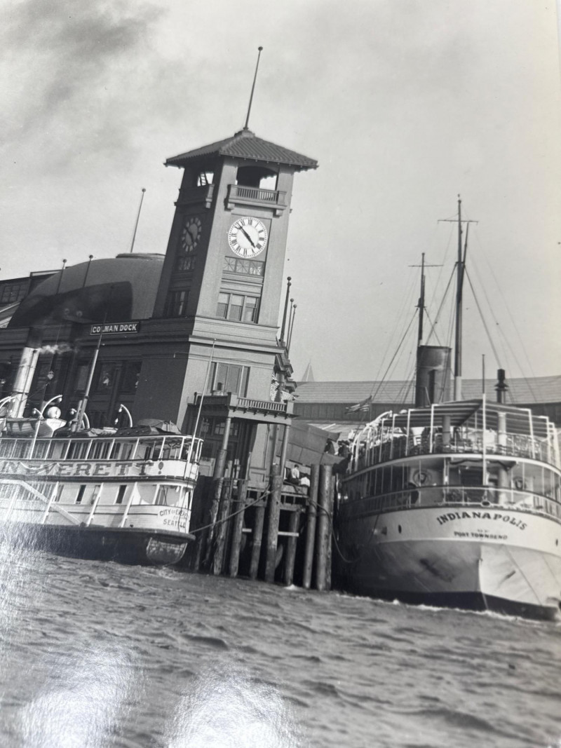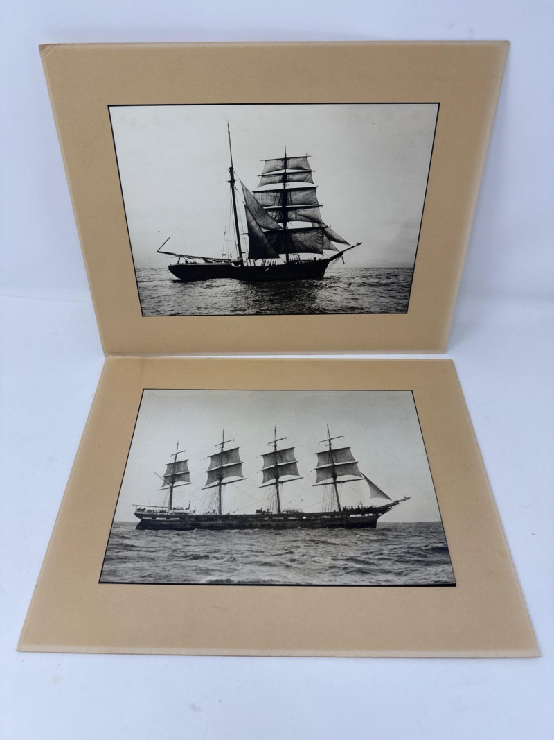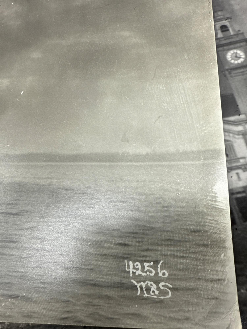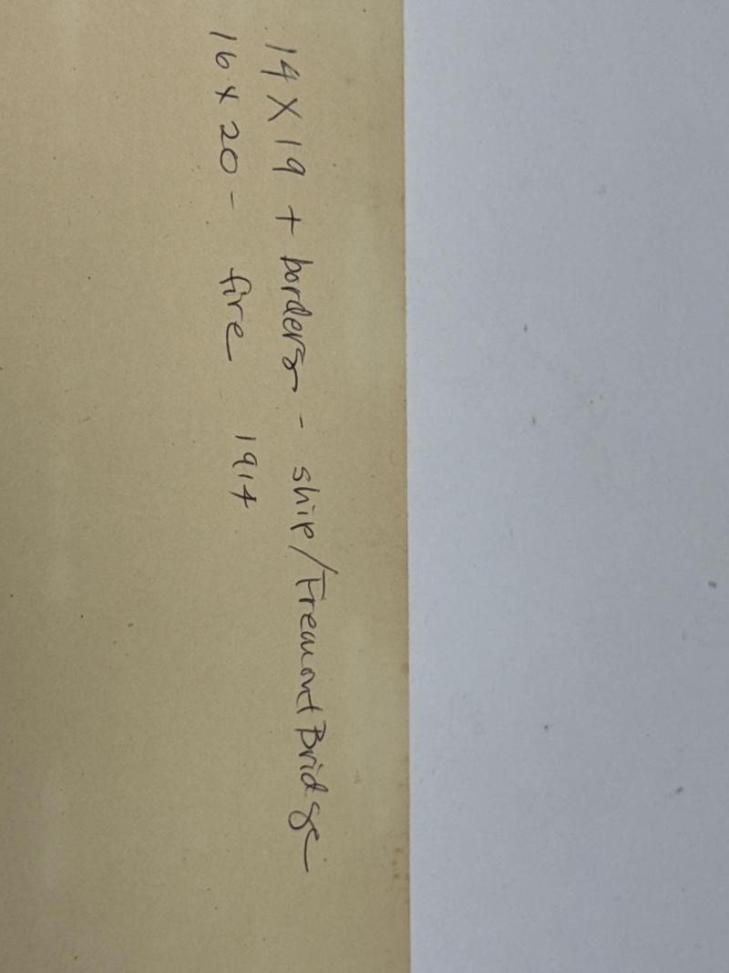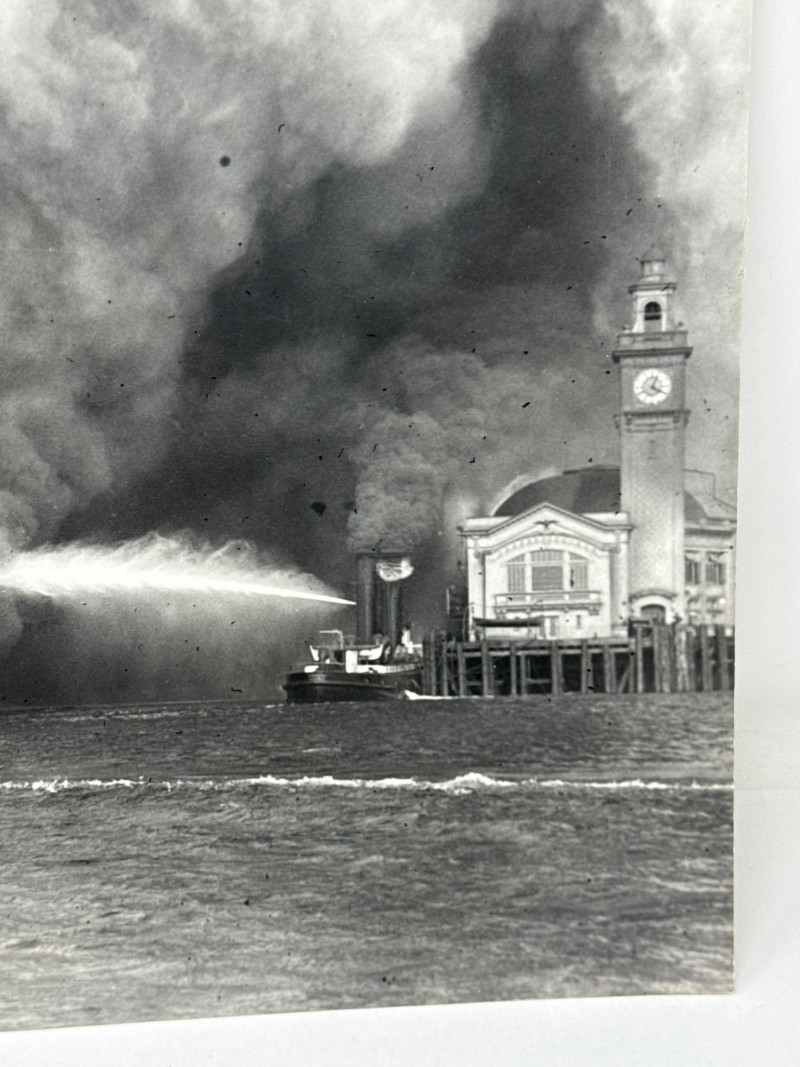 Five evocative black-and-white prints documenting Pacific Northwest maritime history, including tall ships, tugboats, and the dramatic 1914 Seattle waterfront fire. Tall Ship Portraits (2) – Mounted prints of four-masted sailing vessels under full sail, including the Ganges, captured by renowned maritime photographer Joe D. Williamson. Studio stamp and negative numbers present. Ship with Tugboats – Photograph of a towering square-rigged ship escorted by steam-powered tugboats, trailing smoke across open waters. Seattle Waterfront Fire (1914) – Striking image showing thick smoke plumes and a fireboat in action near Colman Dock. Period signage references steamers and battleships. Additional Scenes – Views of the Fremont Bridge, Seattle waterfront, and working tugboats—capturing the transition from sail to steam. Marine Photo Shop – Joe D. Williamson, Winslow, WA. Williamson was a key chronicler of Pacific Northwest maritime life, and his studio stamps and catalog notations add historical depth and authenticity.Highlights: