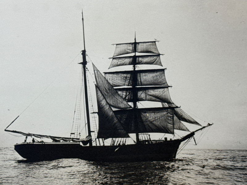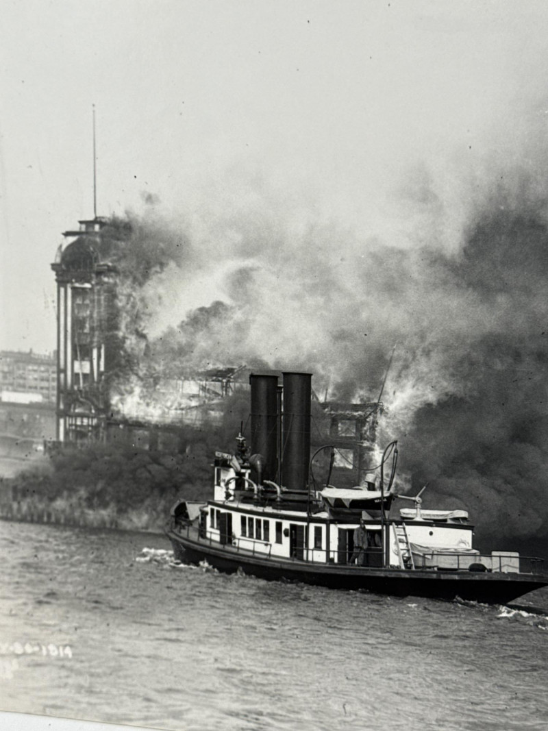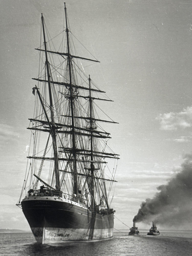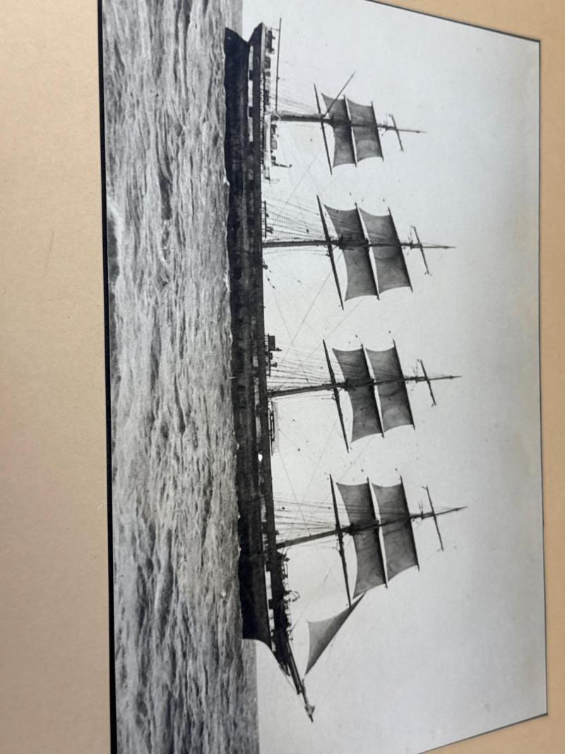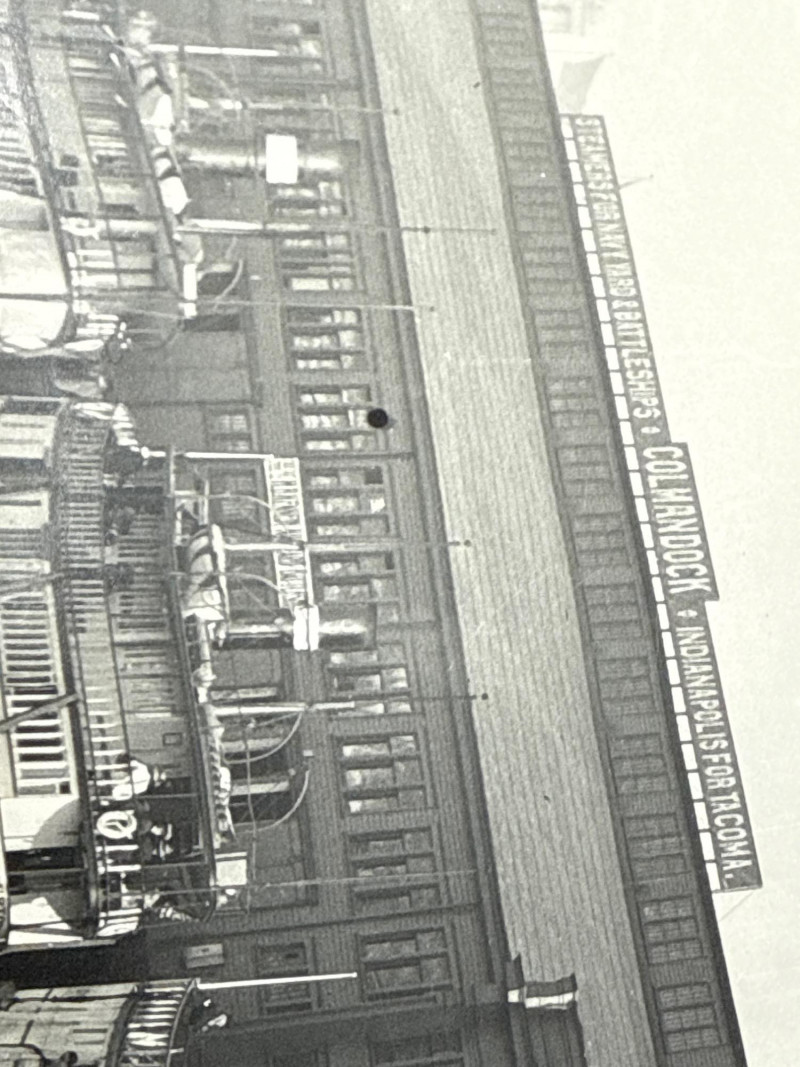 Five evocative black-and-white prints documenting Pacific Northwest maritime history, including tall ships, tugboats, and the dramatic 1914 Seattle waterfront fire. Tall Ship Portraits (2) – Mounted prints of four-masted sailing vessels under full sail, including the Ganges, captured by renowned maritime photographer Joe D. Williamson. Studio stamp and negative numbers present. Ship with Tugboats – Photograph of a towering square-rigged ship escorted by steam-powered tugboats, trailing smoke across open waters. Seattle Waterfront Fire (1914) – Striking image showing thick smoke plumes and a fireboat in action near Colman Dock. Period signage references steamers and battleships. Additional Scenes – Views of the Fremont Bridge, Seattle waterfront, and working tugboats—capturing the transition from sail to steam. Marine Photo Shop – Joe D. Williamson, Winslow, WA. Williamson was a key chronicler of Pacific Northwest maritime life, and his studio stamps and catalog notations add historical depth and authenticity.Highlights: