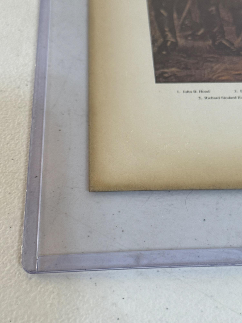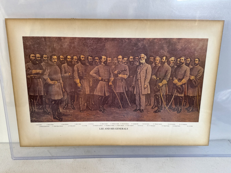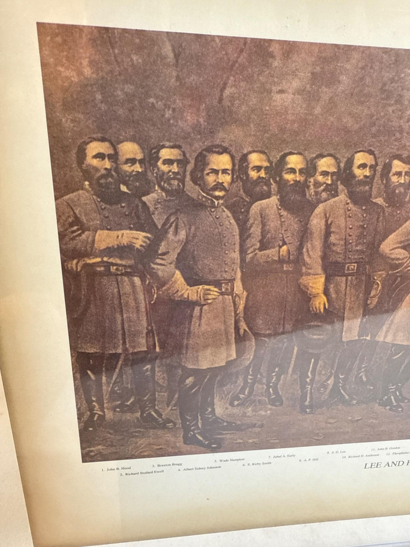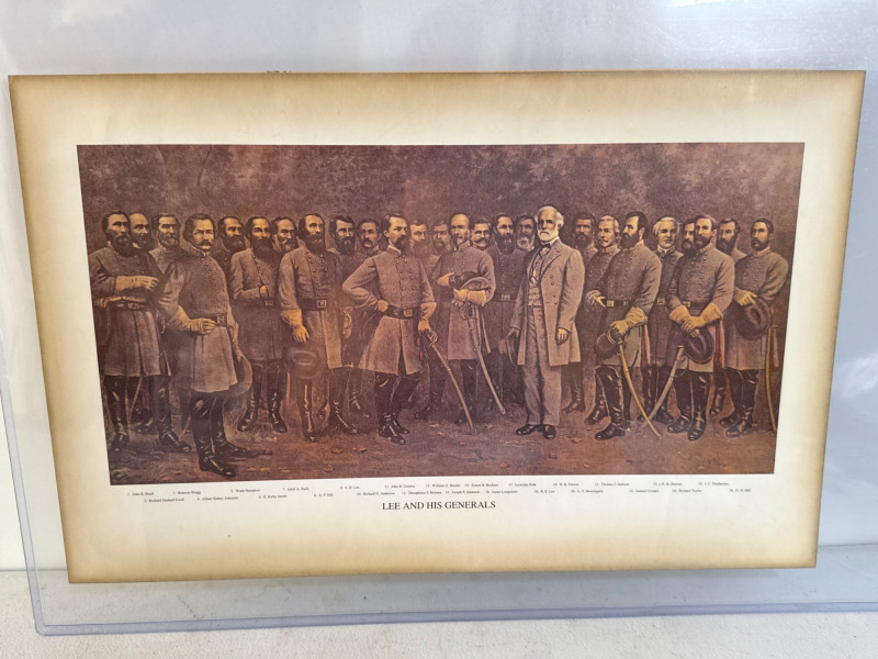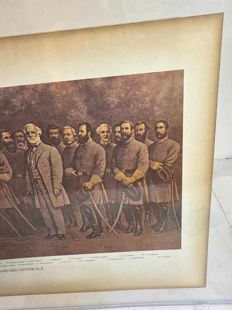 This vintage lithograph titled Lee and His Generals presents a formal group portrait of Confederate General Robert E. Lee surrounded by over twenty of his key officers from the American Civil War. Each figure is identified by name in the printed caption below the image, with a numbered legend across the bottom margin. Notable generals include James Longstreet, J.E.B. Stuart, Joseph E. Johnston, and John B. Gordon. The print exhibits even toning and age-related browning to the margins, consistent with its vintage nature. Despite light foxing, the image retains excellent contrast and detail, making it a compelling example of postwar commemorative art. Highlights: Title: LEE AND HIS GENERALS printed prominently below the image Numbered legend identifying each general Preserved under protective covering Historically significant postwar lithograph Dimensions: Approx. 17" L × 11" W (sight)