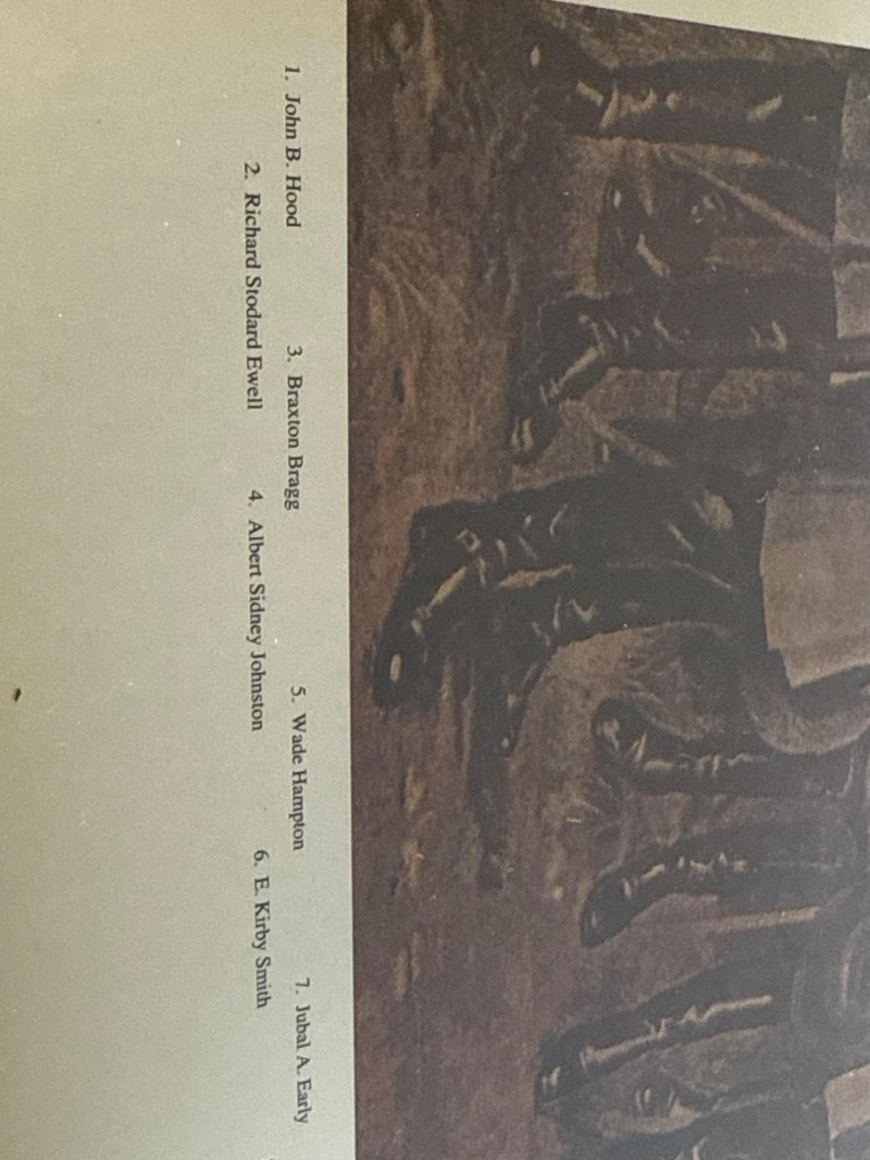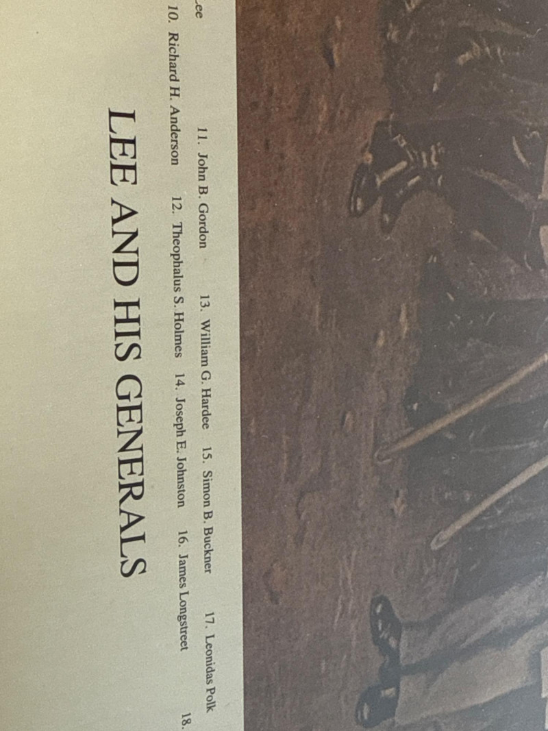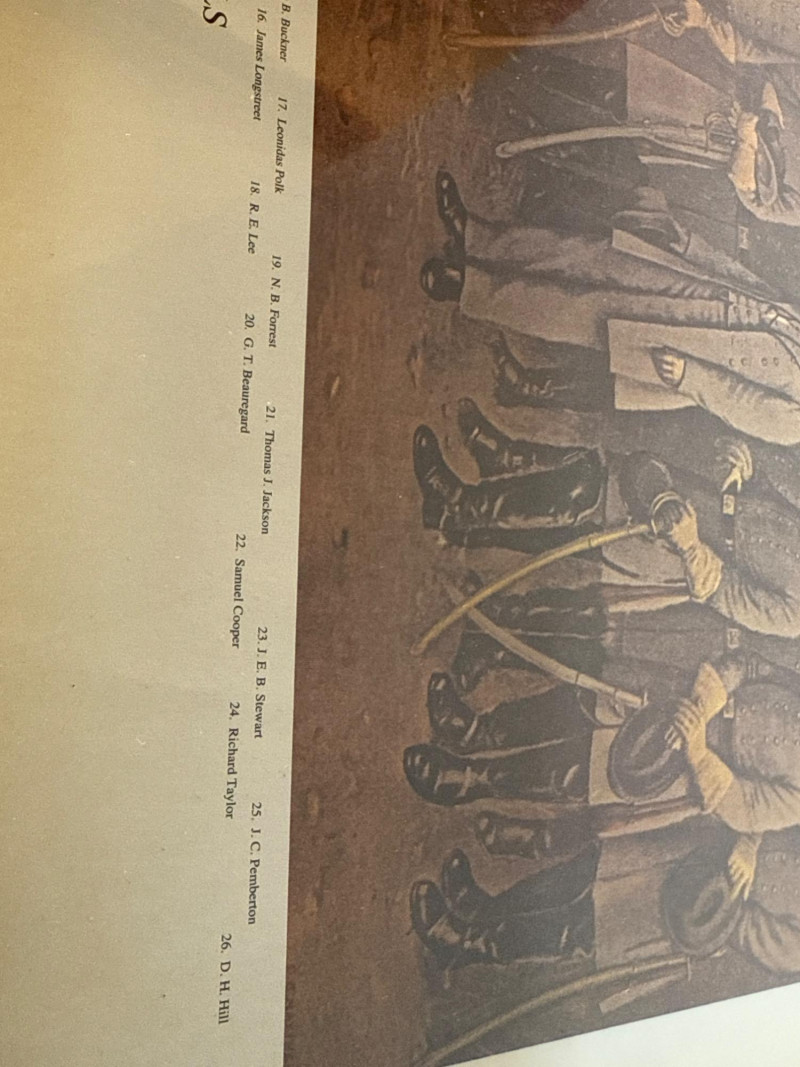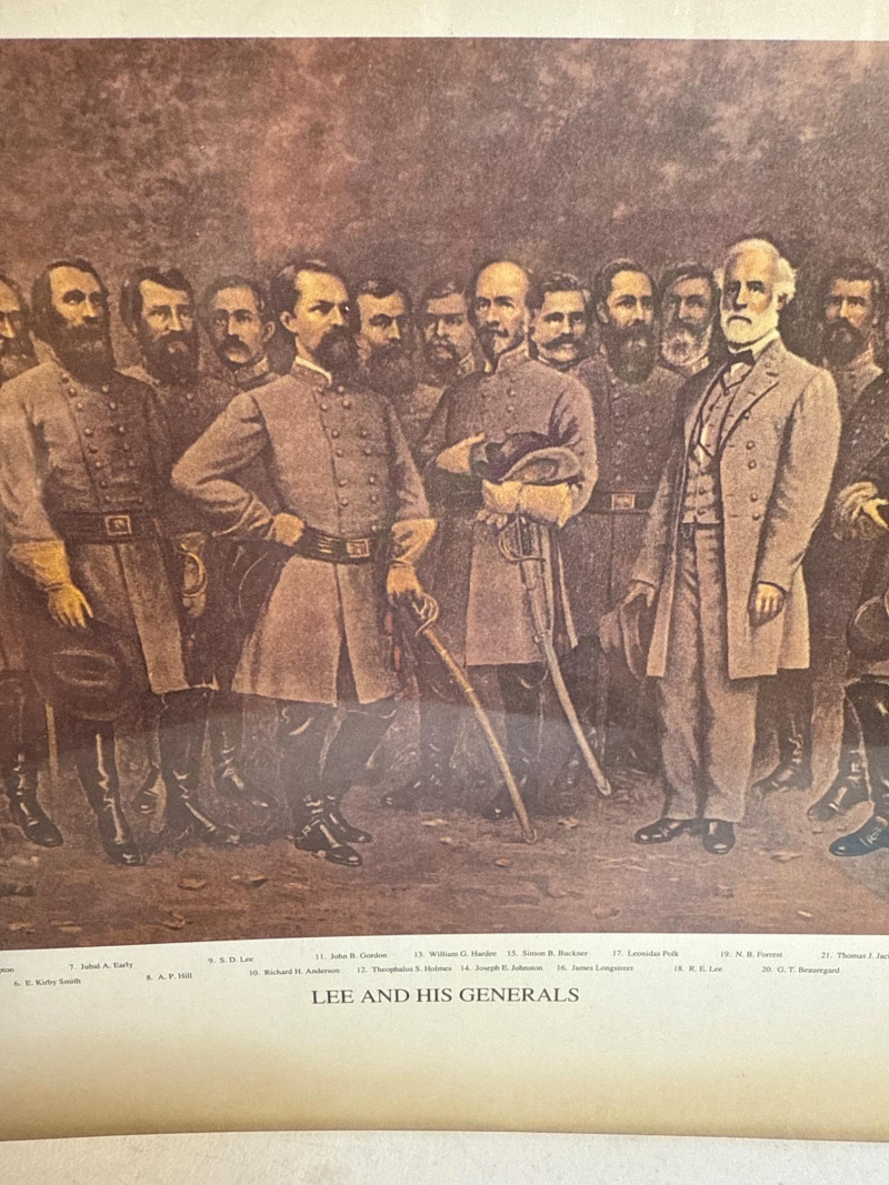 This vintage lithograph titled Lee and His Generals presents a formal group portrait of Confederate General Robert E. Lee surrounded by over twenty of his key officers from the American Civil War. Each figure is identified by name in the printed caption below the image, with a numbered legend across the bottom margin. Notable generals include James Longstreet, J.E.B. Stuart, Joseph E. Johnston, and John B. Gordon. The print exhibits even toning and age-related browning to the margins, consistent with its vintage nature. Despite light foxing, the image retains excellent contrast and detail, making it a compelling example of postwar commemorative art. Highlights: Title: LEE AND HIS GENERALS printed prominently below the image Numbered legend identifying each general Preserved under protective covering Historically significant postwar lithograph Dimensions: Approx. 17" L × 11" W (sight)