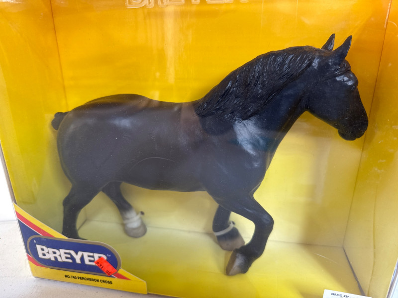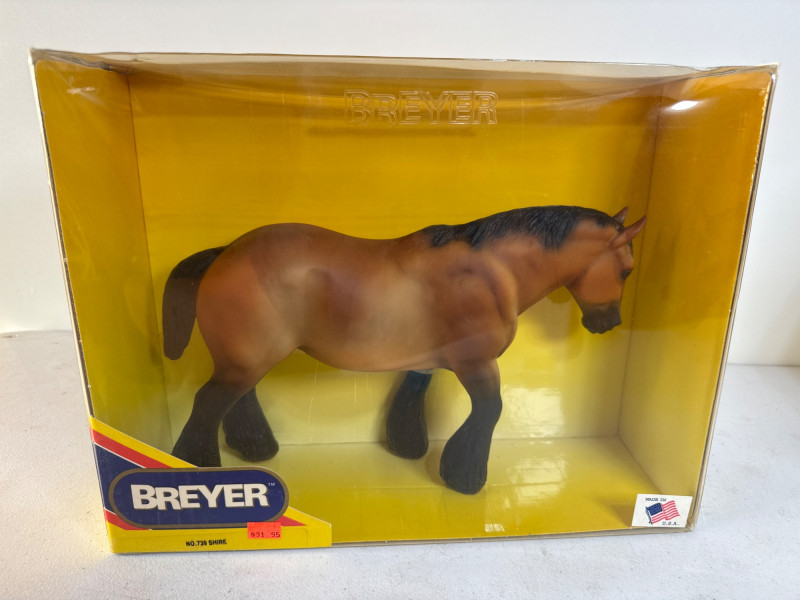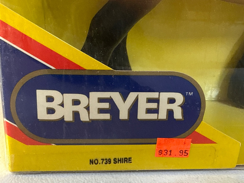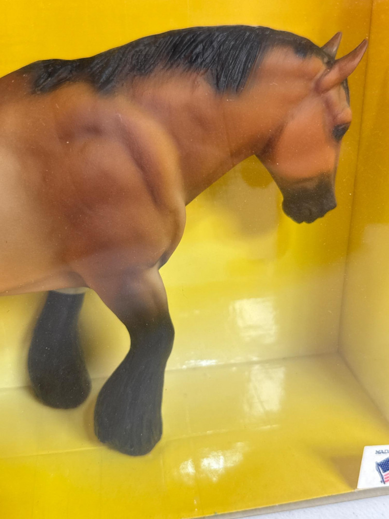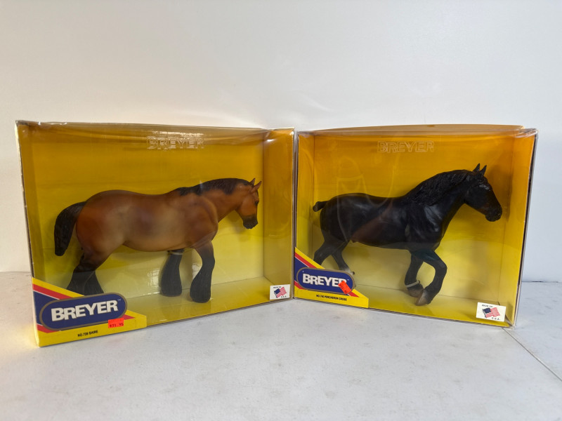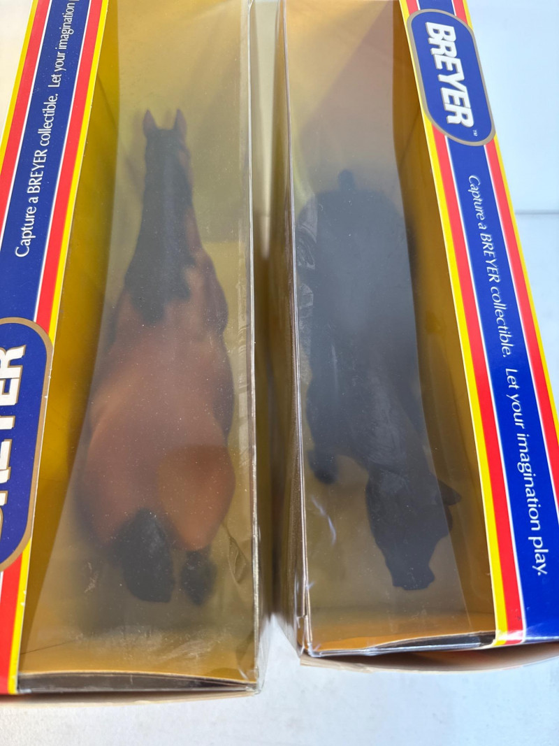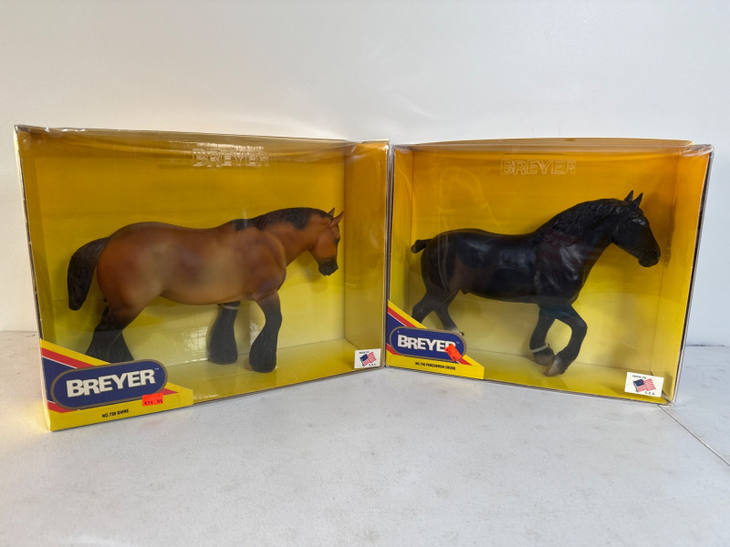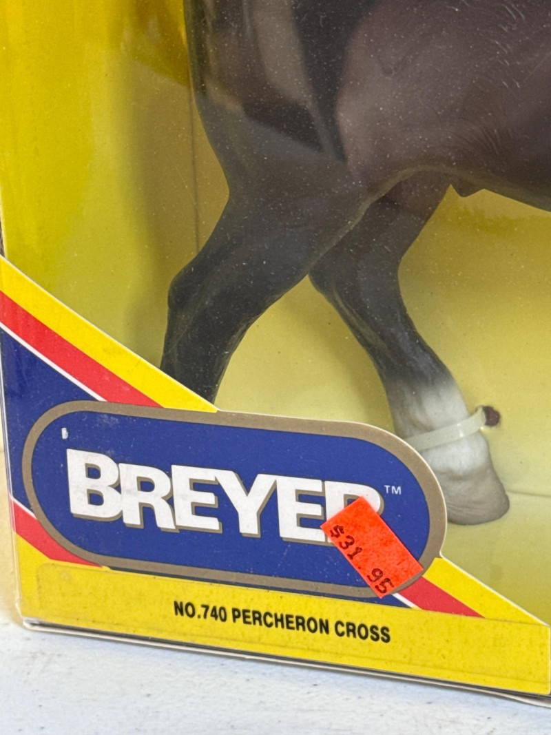 A pair of original Breyer Traditional Series draft horse models, each preserved in factory-sealed packaging with clear display windows and signature yellow backdrops. Color: Shaded bay with dark points and feathered legs Breed Representation: Classic English Shire, known for its immense strength and regal bearing Details: Sculpted to emphasize muscular build and breed-specific leg feathering Color: Deep black with white highlights Breed Representation: French Percheron lineage, celebrated for versatility and endurance Details: Contrasting accents highlight the model’s dynamic posture and draft power Packaging: Original “Made in U.S.A.” boxes with intact display windows Retail Stickers: Both retain original price tags of $31.95Breyer No. 739 – Shire Draft Horse