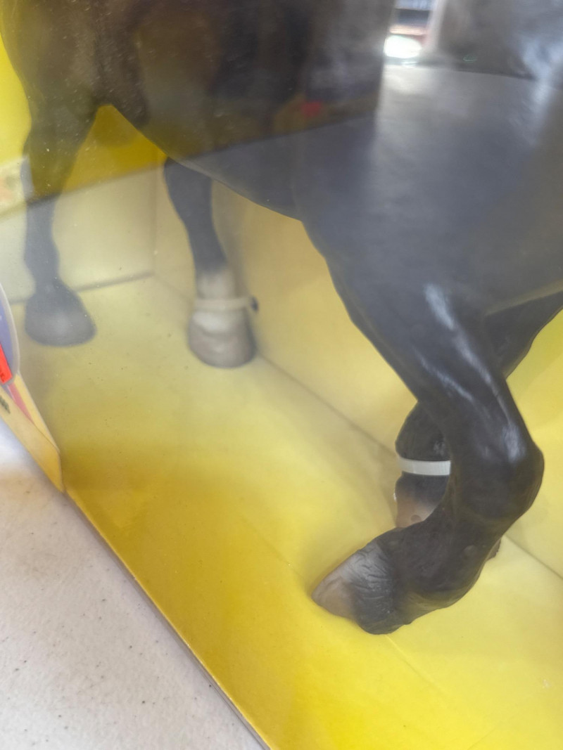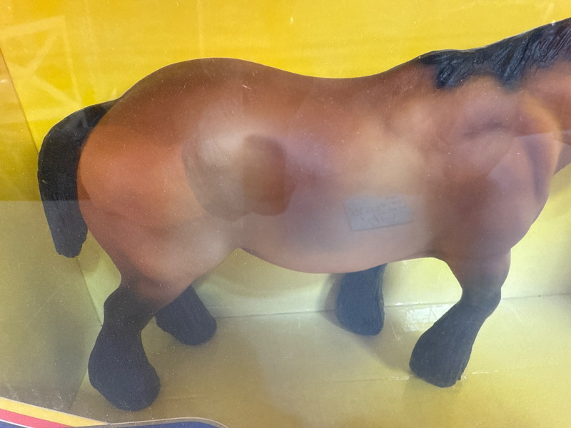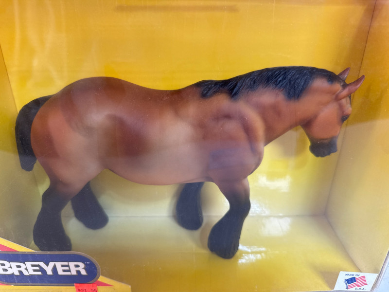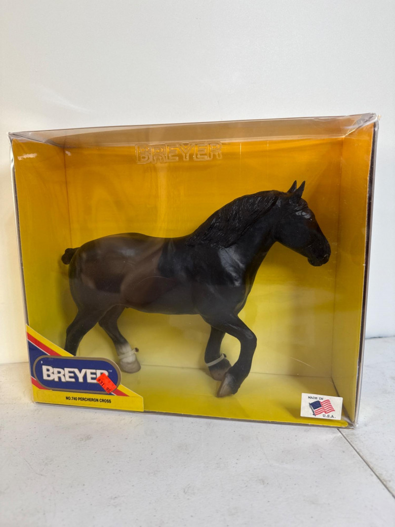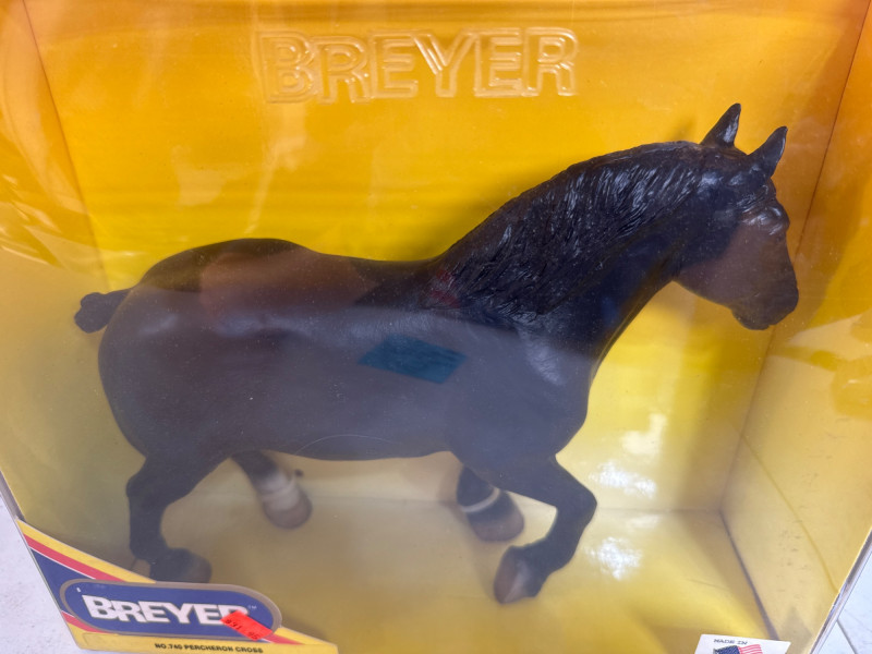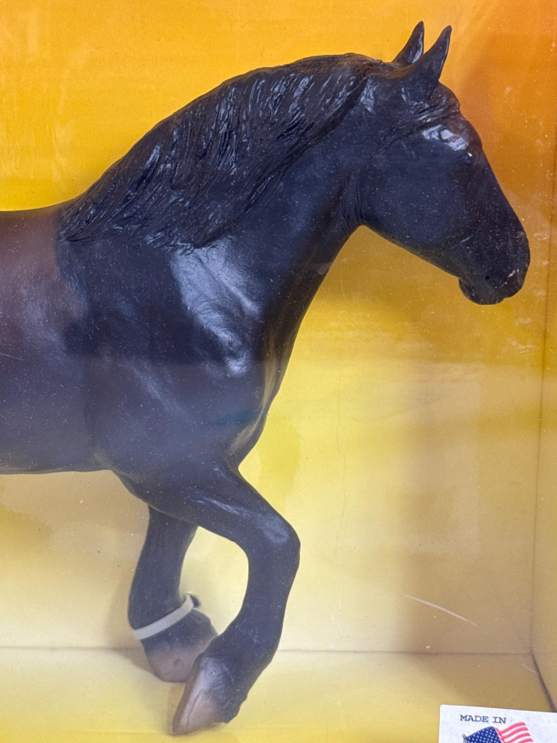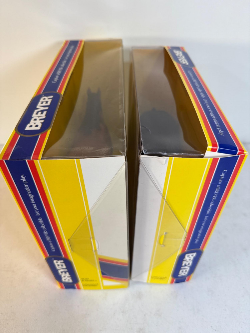 A pair of original Breyer Traditional Series draft horse models, each preserved in factory-sealed packaging with clear display windows and signature yellow backdrops. Color: Shaded bay with dark points and feathered legs Breed Representation: Classic English Shire, known for its immense strength and regal bearing Details: Sculpted to emphasize muscular build and breed-specific leg feathering Color: Deep black with white highlights Breed Representation: French Percheron lineage, celebrated for versatility and endurance Details: Contrasting accents highlight the model’s dynamic posture and draft power Packaging: Original “Made in U.S.A.” boxes with intact display windows Retail Stickers: Both retain original price tags of $31.95Breyer No. 739 – Shire Draft Horse