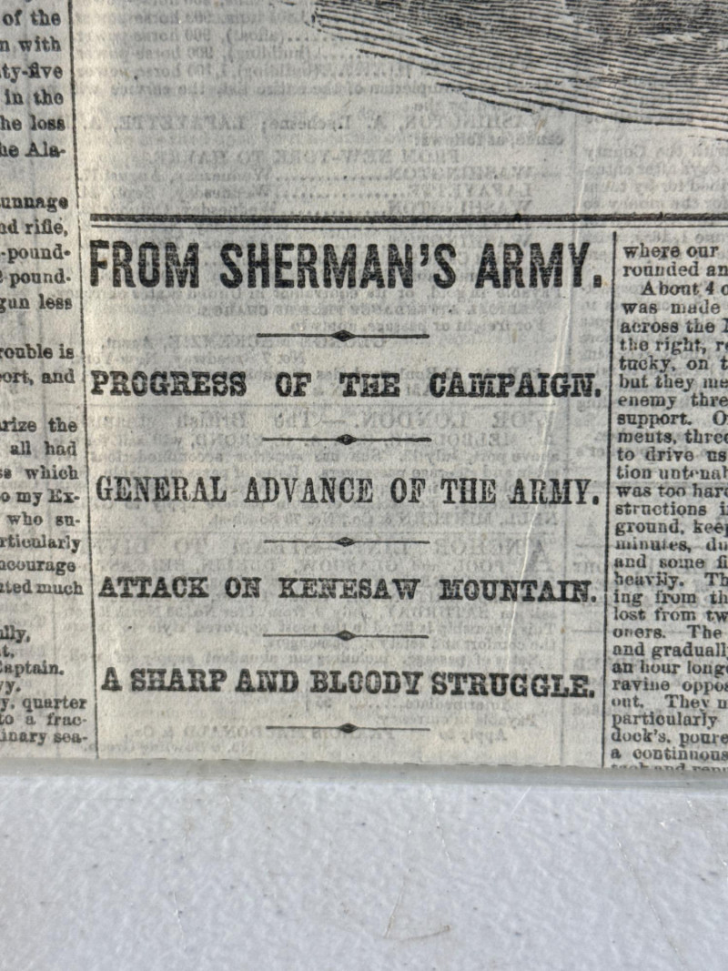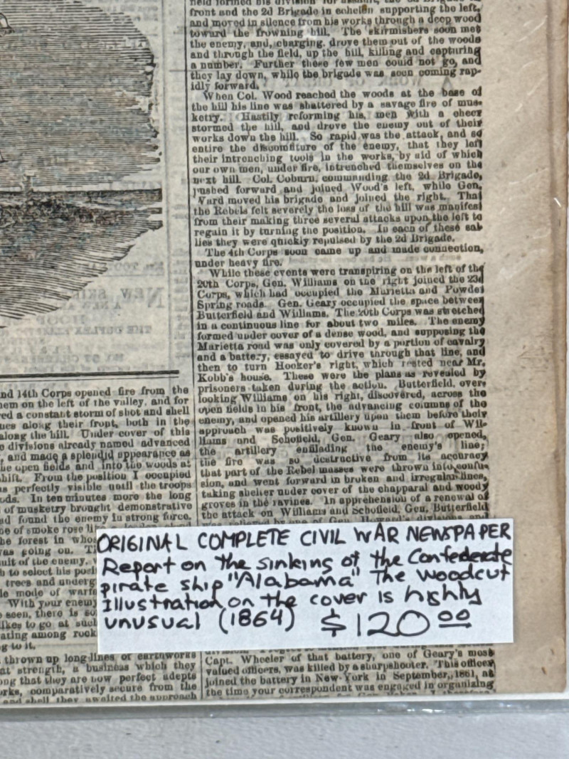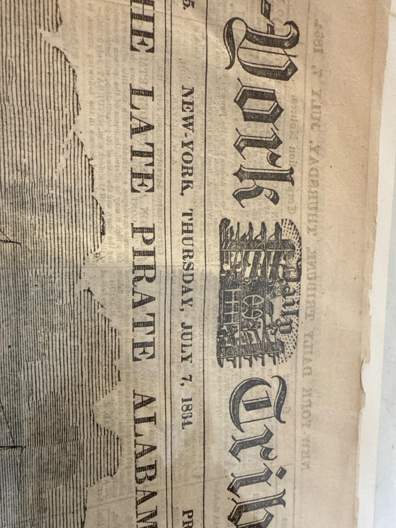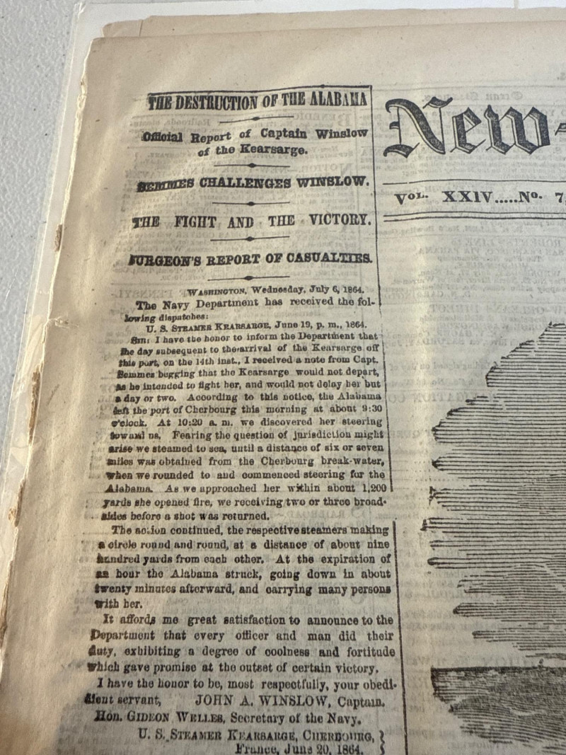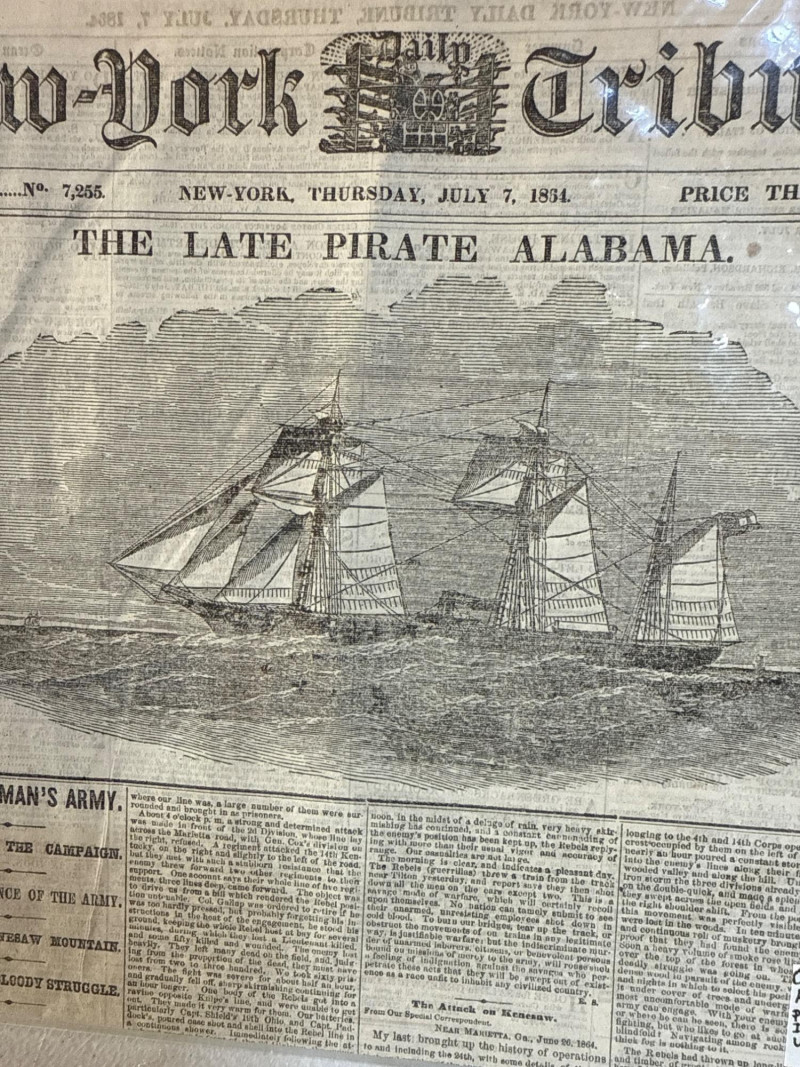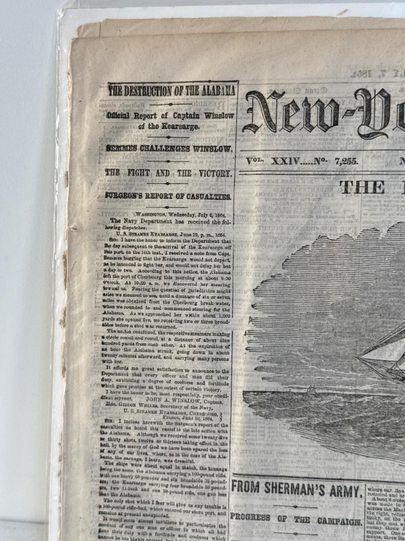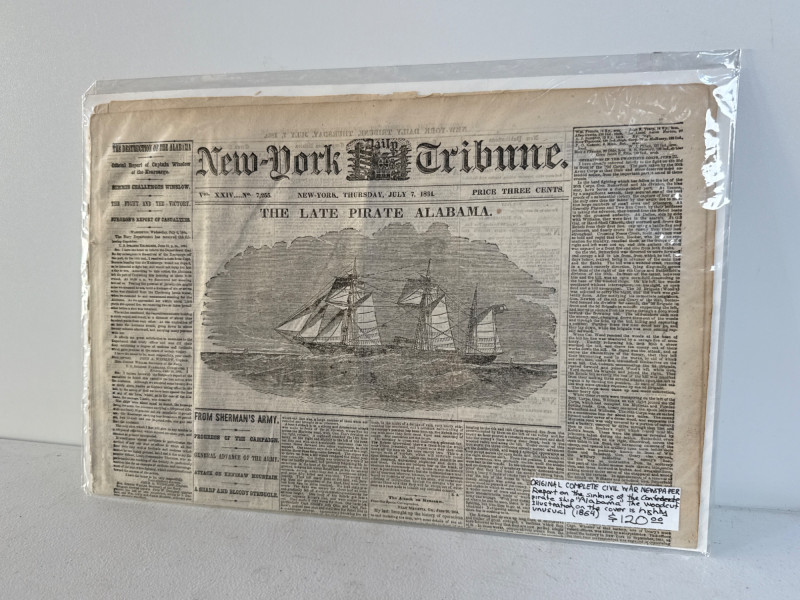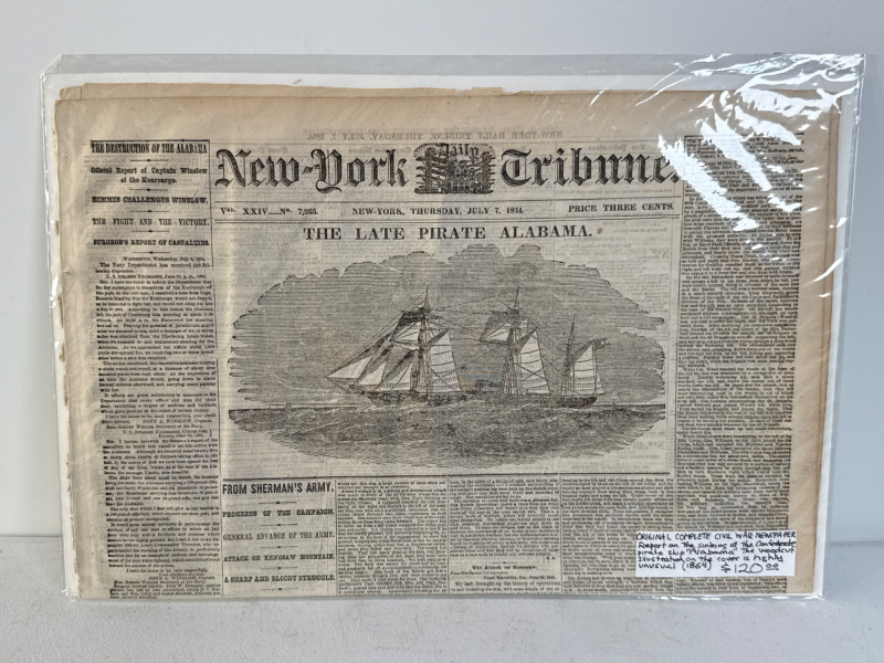 Complete issue dated July 7, 1864, featuring front-page coverage of the sinking of the Confederate raider CSS Alabama. Includes a rare woodcut illustration of the vessel. Commanded by Captain Raphael Semmes, the Alabama was a notorious commerce destroyer before being sunk by the USS Kearsarge off Cherbourg, France. This edition offers firsthand reporting from the naval conflict and reflects Northern wartime sentiment. Condition: Age-toned, minor edge wear, complete issue; very good overall Significance: Scarce illustrated Civil War newspaper documenting a pivotal naval engagement Estimate: $120+
