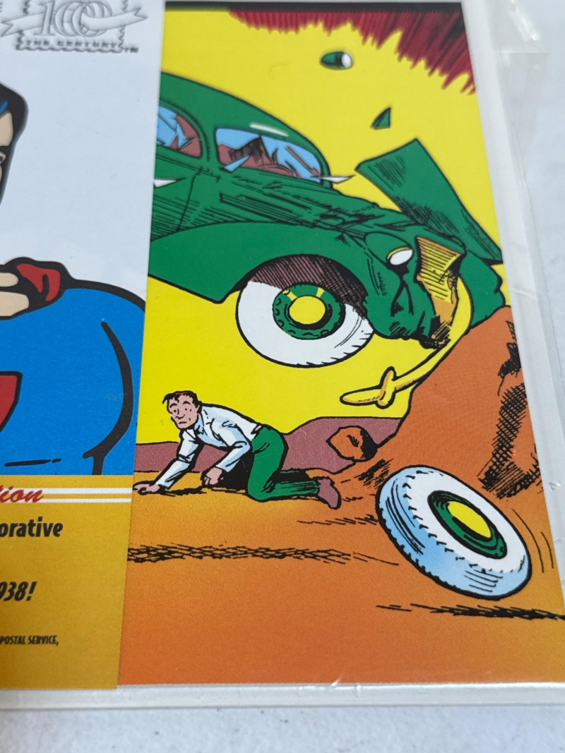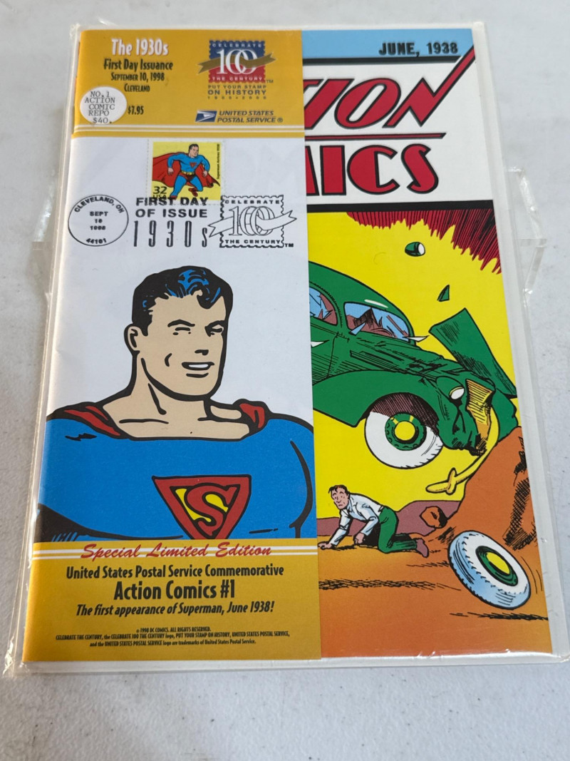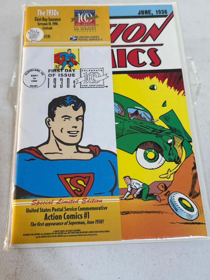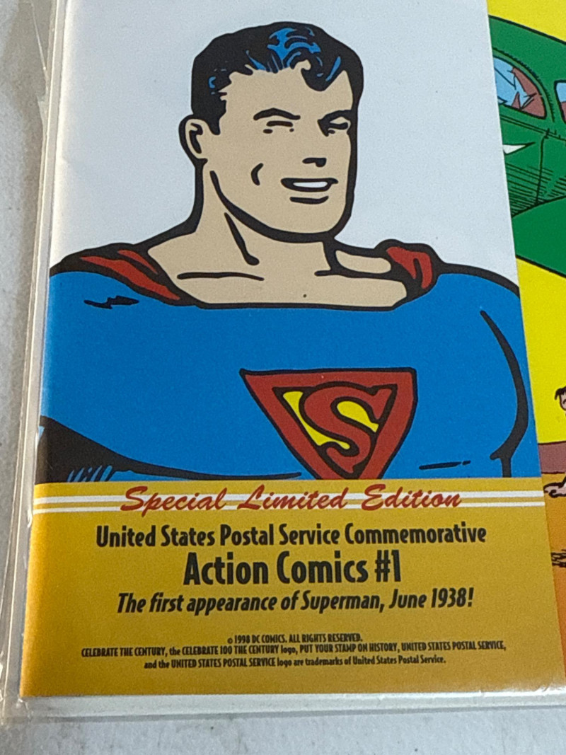 Issued by the United States Postal Service in 1998 as part of its Celebrate the Century: The 1930s series, this Special Limited Edition commemorative honors Superman’s historic debut in Action Comics #1 (June 1938). First Day of Issue: 32¢ Superman stamp with official USPS cancellation, postmarked September 10, 1998, Syracuse, NY Design: Full-color reproduction of the iconic cover—Superman lifting a green car