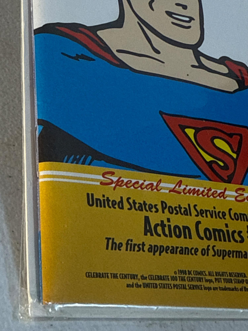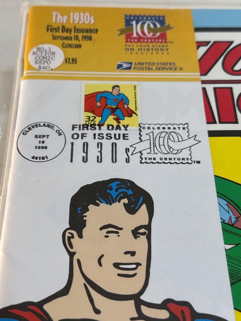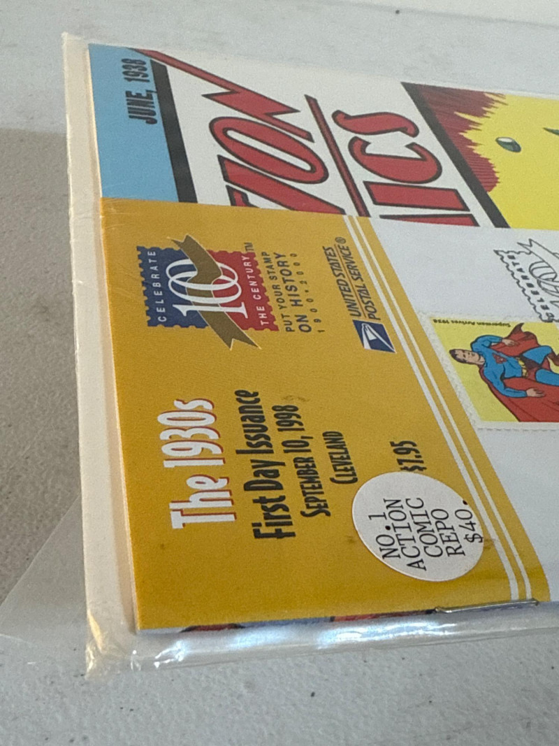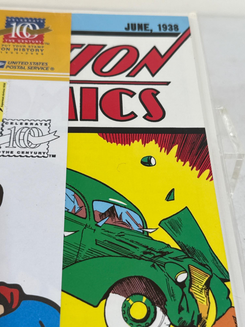 Issued by the United States Postal Service in 1998 as part of its Celebrate the Century: The 1930s series, this Special Limited Edition commemorative honors Superman’s historic debut in Action Comics #1 (June 1938). First Day of Issue: 32¢ Superman stamp with official USPS cancellation, postmarked September 10, 1998, Syracuse, NY Design: Full-color reproduction of the iconic cover—Superman lifting a green car