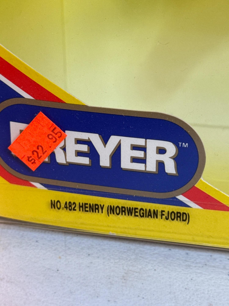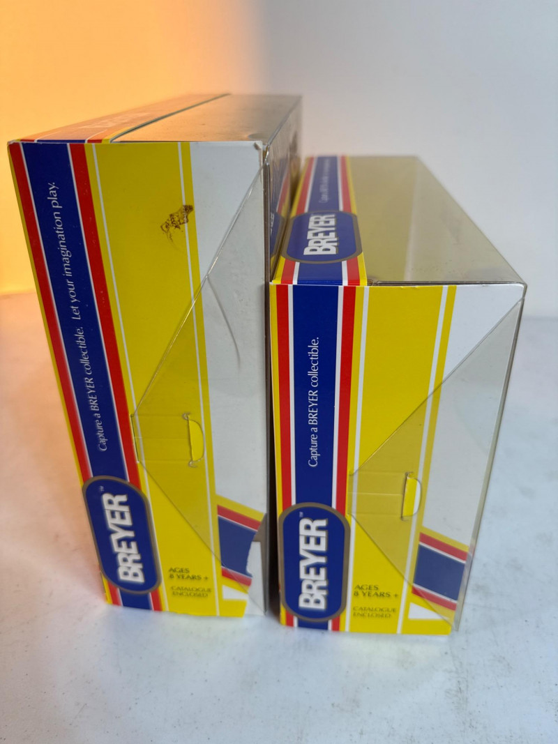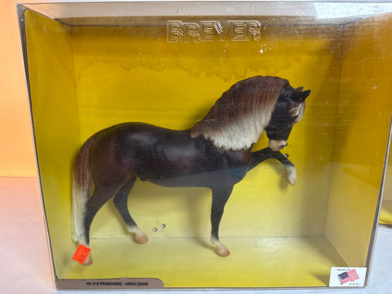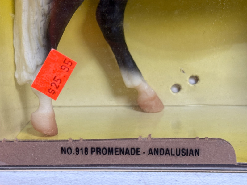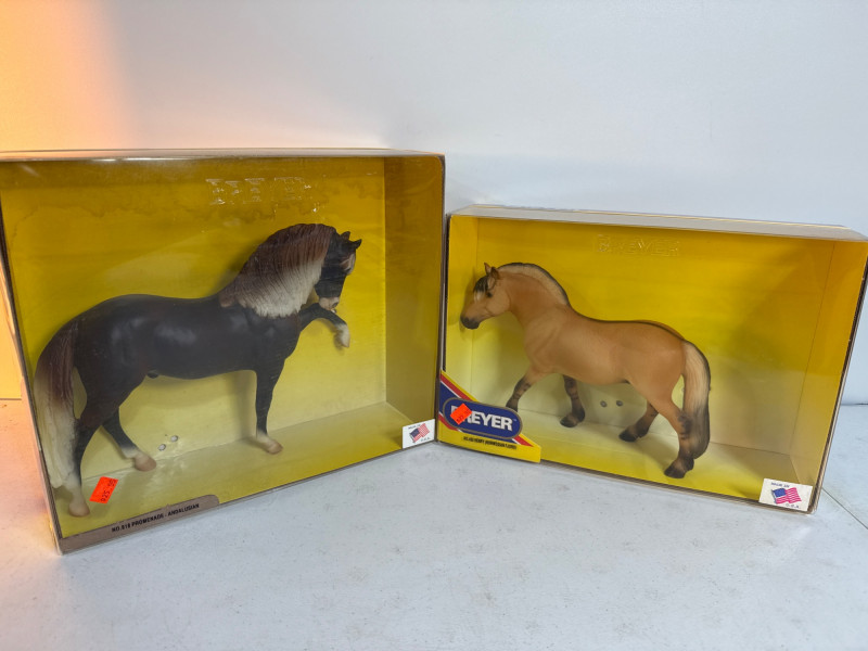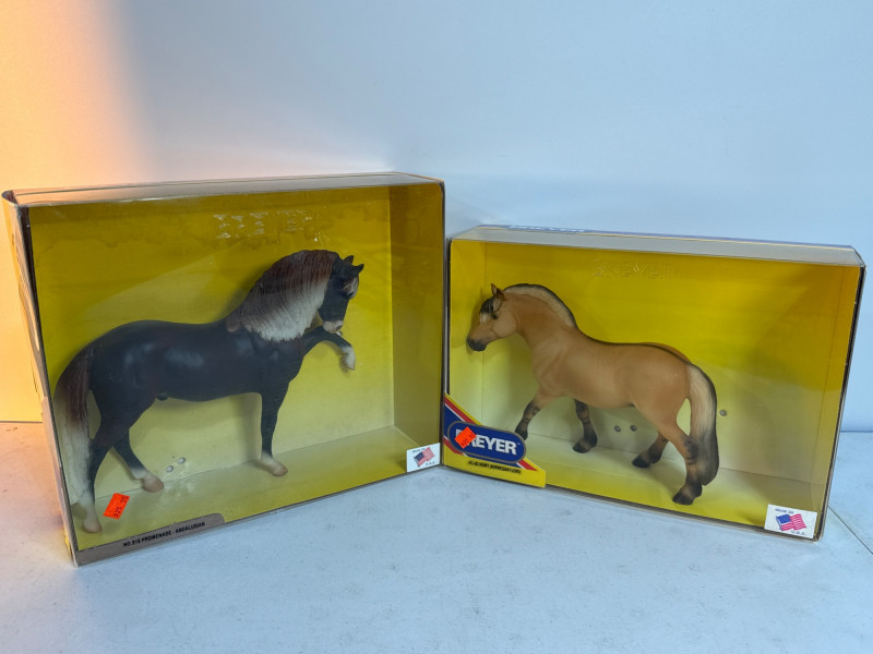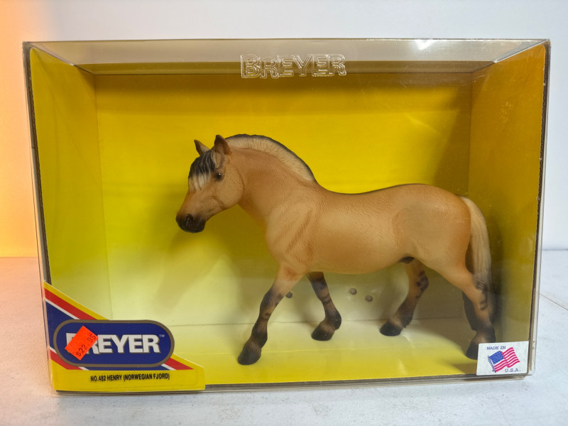 This lot includes two original Breyer Traditional Series horse models; both preserved in their original factory packaging with clear display windows: Breyer No. 918 “Promenade” – Andalusian Molded in a rich dark bay with shaded highlights and a lighter mane and tail. Sculpted in a raised foreleg pose, evoking classical dressage movement. Original retail price sticker ($25.95) intact. Box marked “Made in U.S.A.” Breyer No. 482 “Henry” – Norwegian Fjord Finished in a dun coat with primitive leg barring and a signature two-tone mane. Depicted in a walking pose, reflecting the breed’s sturdy and versatile nature. Original retail price sticker ($22.95) intact. Box marked “Made in U.S.A.” Collectability: Early boxed Breyer models are highly collectible, especially when featuring iconic breeds like the Andalusian and Norwegian Fjord. Their preserved condition and original packaging enhance appeal for Breyer enthusiasts and equine model collectors alike.