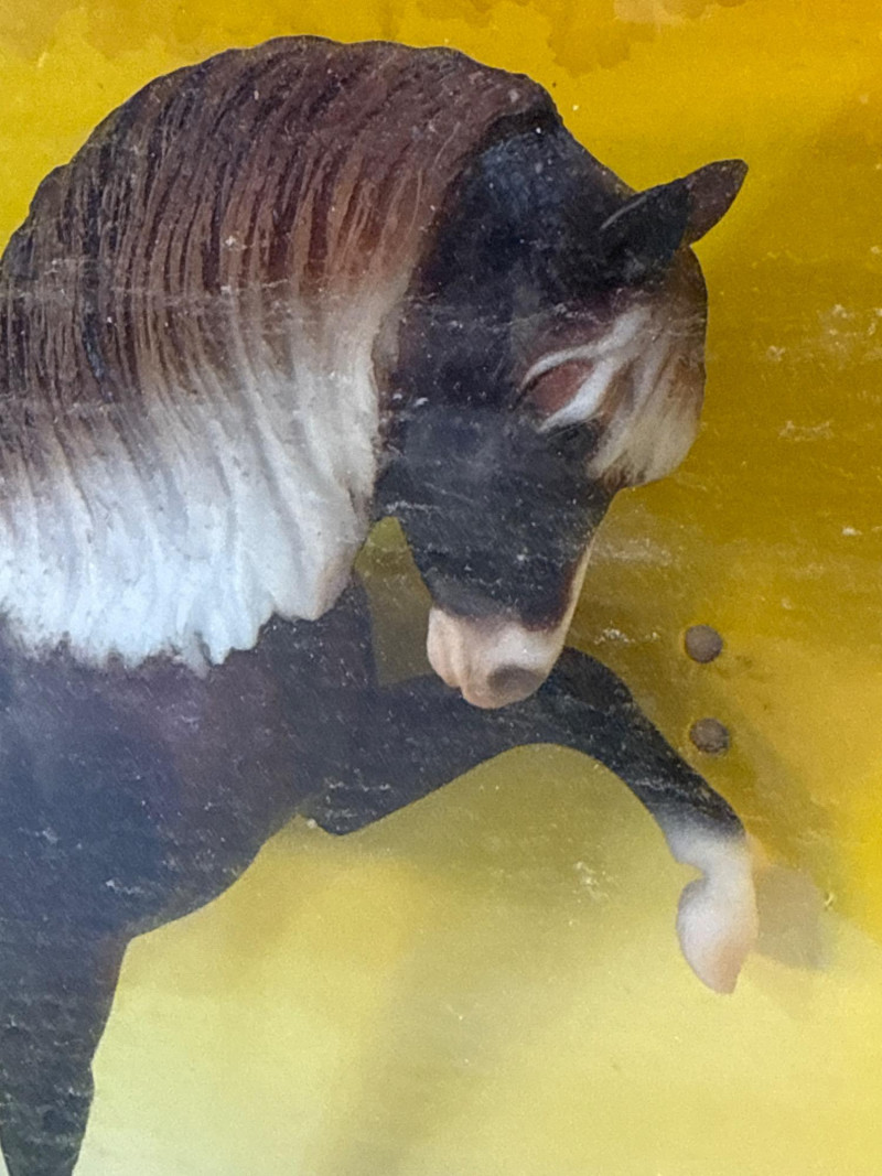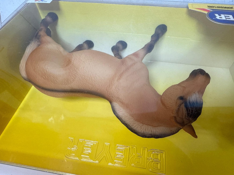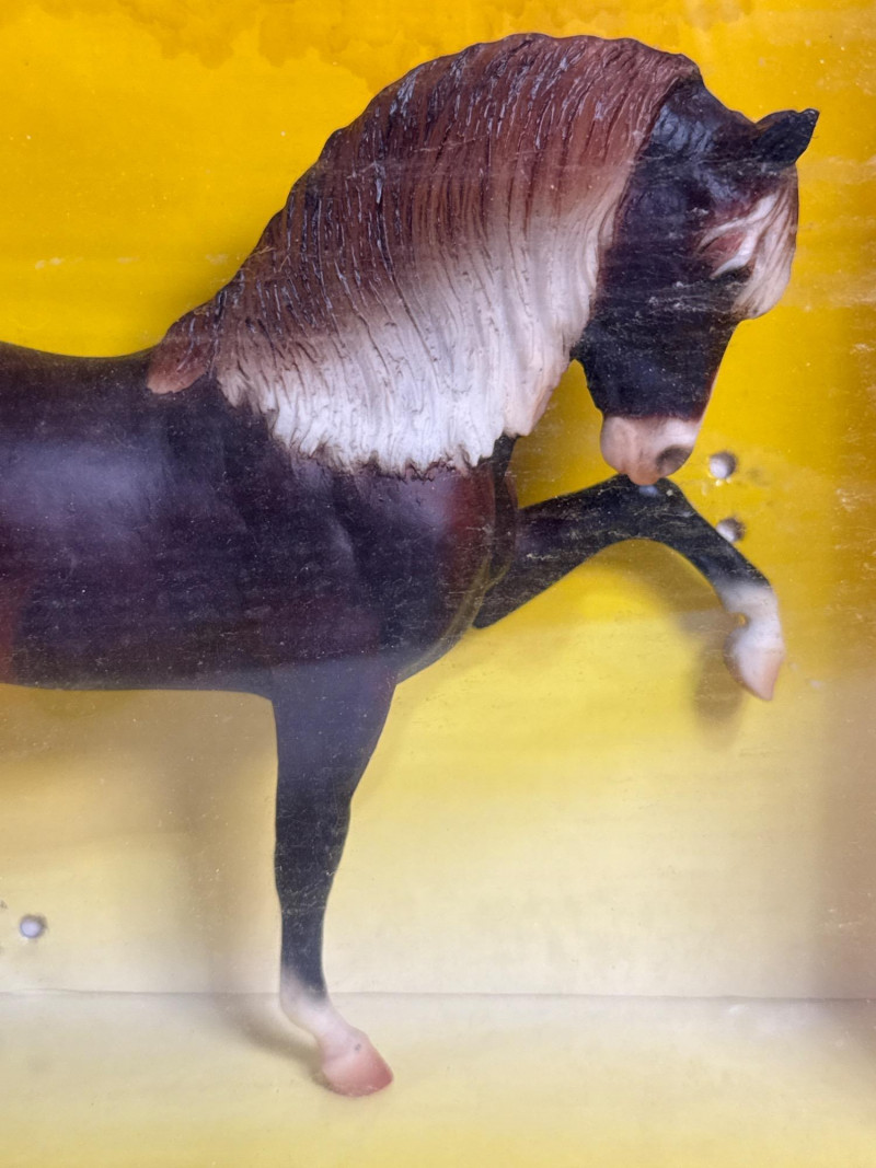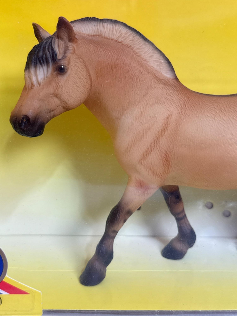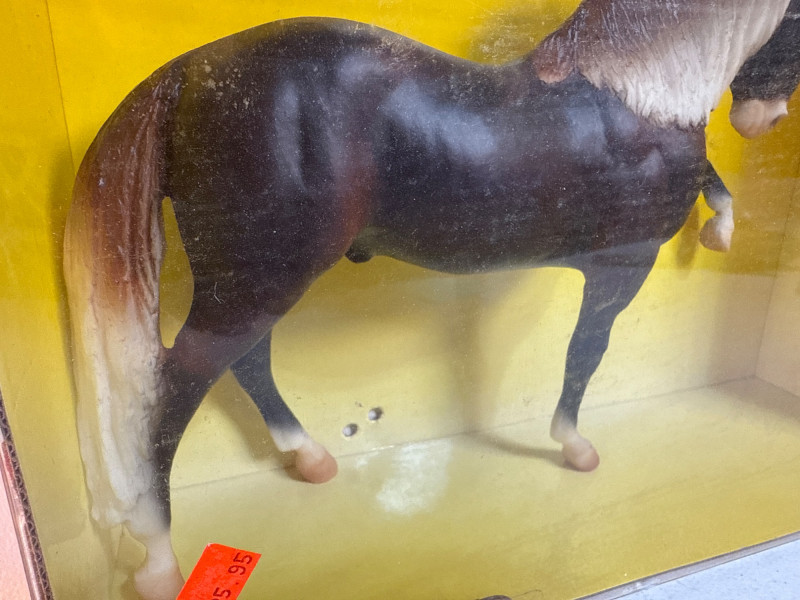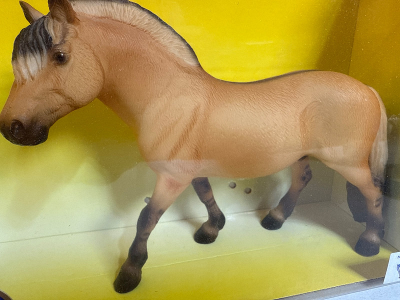 This lot includes two original Breyer Traditional Series horse models; both preserved in their original factory packaging with clear display windows: Breyer No. 918 “Promenade” – Andalusian Molded in a rich dark bay with shaded highlights and a lighter mane and tail. Sculpted in a raised foreleg pose, evoking classical dressage movement. Original retail price sticker ($25.95) intact. Box marked “Made in U.S.A.” Breyer No. 482 “Henry” – Norwegian Fjord Finished in a dun coat with primitive leg barring and a signature two-tone mane. Depicted in a walking pose, reflecting the breed’s sturdy and versatile nature. Original retail price sticker ($22.95) intact. Box marked “Made in U.S.A.” Collectability: Early boxed Breyer models are highly collectible, especially when featuring iconic breeds like the Andalusian and Norwegian Fjord. Their preserved condition and original packaging enhance appeal for Breyer enthusiasts and equine model collectors alike.