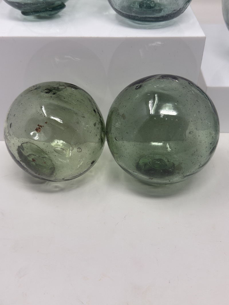 A charming collection of 7 vintage hand-blown glass fishing floats in a variety of seafoam green, aqua, and light olive tones. Traditionally used by fishermen to keep their nets and lines afloat, these decorative glass orbs now make beautiful coastal or nautical accents for shelves, bowls, or outdoor spaces. Each float is unique, showcasing bubbles, pontil marks, and minor variations in color and size consistent with vintage glass craftsmanship. Estimated Measurements (Diameter Range): Smallest: approx. 4 inches Largest: approx. 7 inches