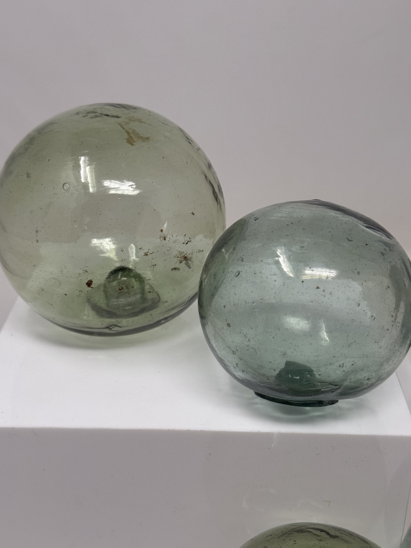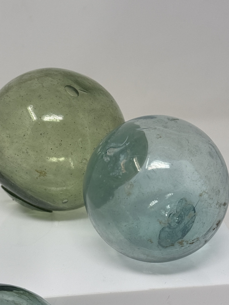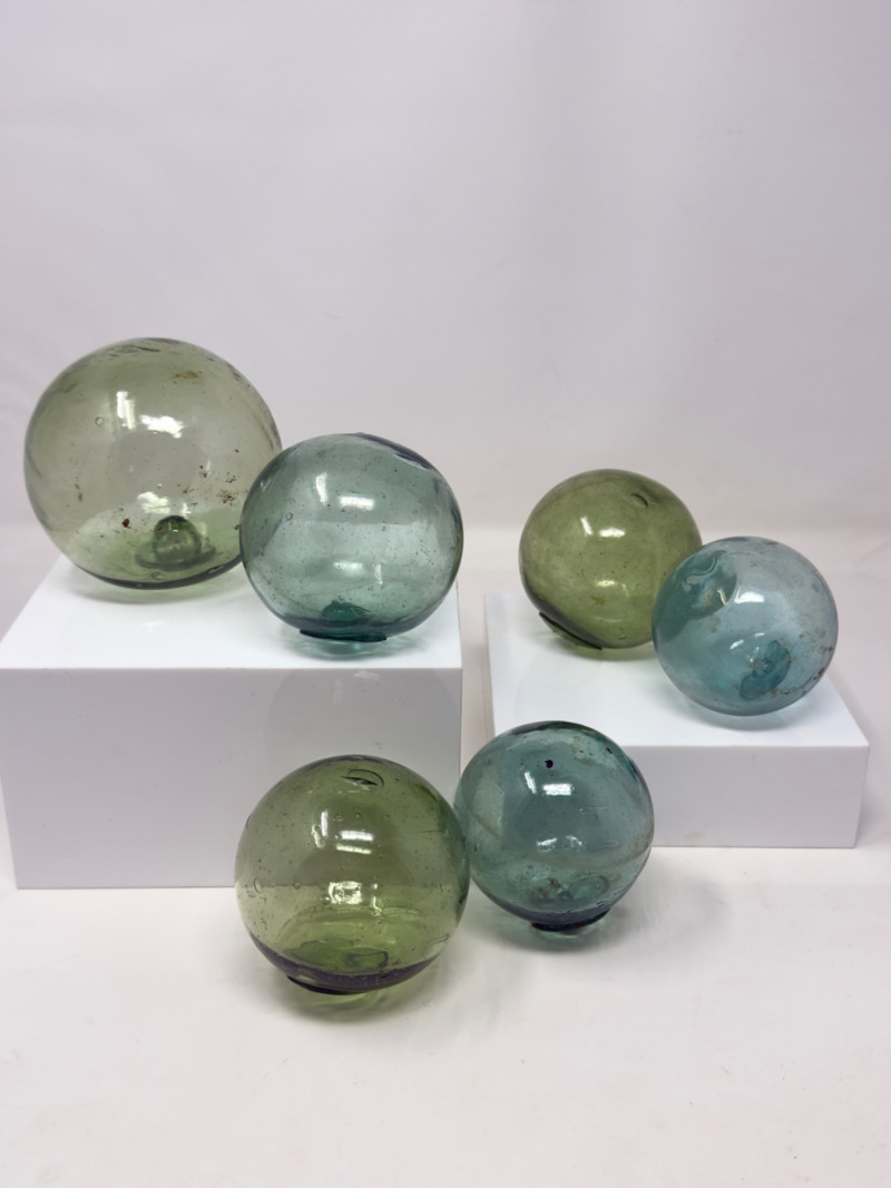 This set of 6 vintage glass fishing floats features stunning hues of seafoam green, aqua blue, and olive. Hand-blown and rich with character, each orb displays beautiful imperfections like air bubbles, faint striations, and pontil scars — hallmarks of their maritime history. These were once used by fishermen to buoy their nets and traps; now, they serve as elegant coastal decor for indoor or outdoor spaces. Estimated Measurements (Diameter Range): Smallest: approx. 3.5 inches Largest: approx. 6.5 inches