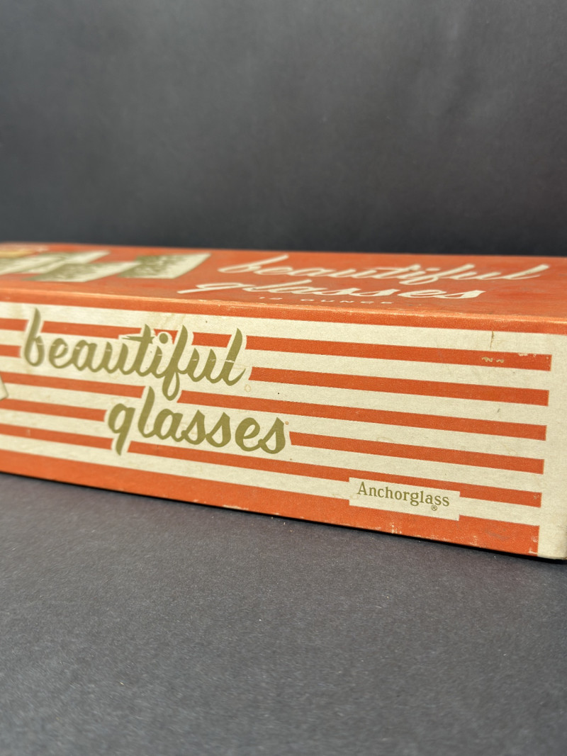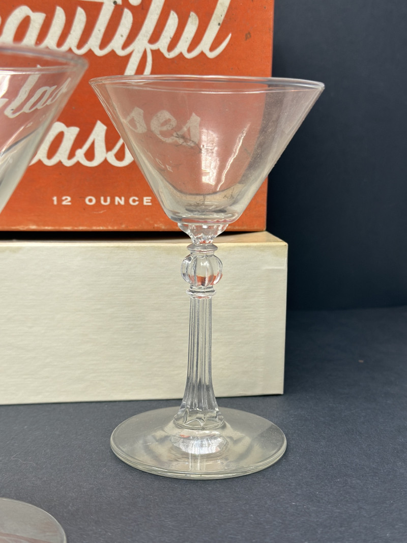 A charming mid-century boxed set of four vintage stemmed glasses, ideal for cocktails, aperitifs, or wine. These glasses feature faceted stems with a decorative knop detail and flared bowls, balancing elegance with everyday functionality. Original red-and-white packaging labeled "Beautiful Glasses" adds collectible appeal. Included Items: Set of 4 Glasses – Clear glass with faceted stem detail, mid-century design (each approx. 5.25" tall, 3.5" diameter at rim). Original Box – Graphic red-and-green mid-century packaging, marked "Beautiful Glasses," holds four pieces. Condition: