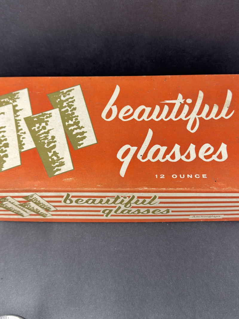Glasses show light wear consistent with age; no chips or cracks noted. Box displays age-related wear but remains intact.