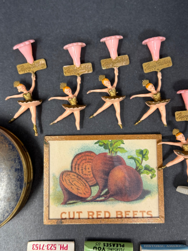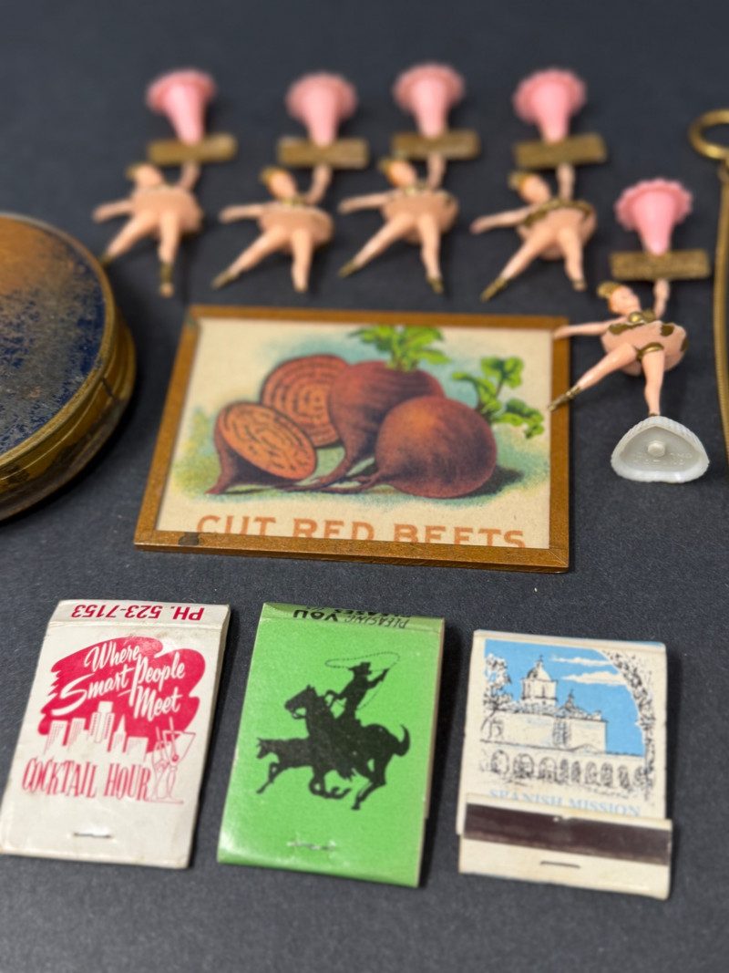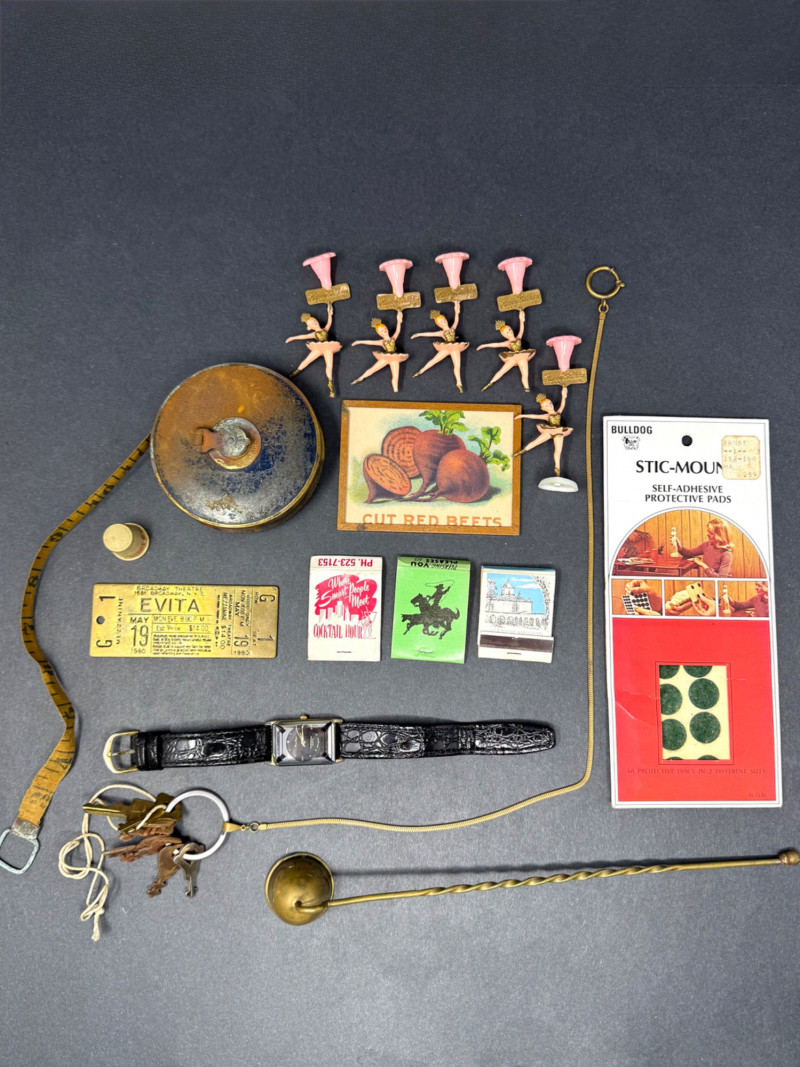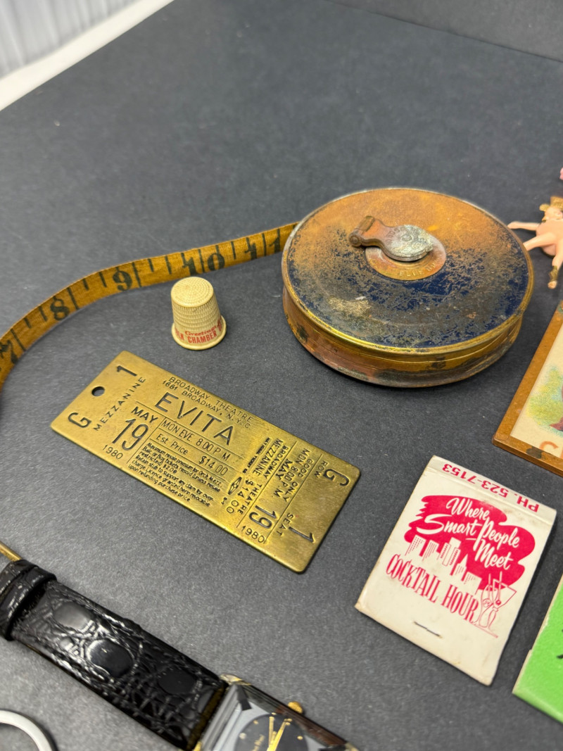 An eclectic assortment of vintage smalls and ephemera, spanning mid-20th century utility, advertising, and decorative items. This curated lot is ideal for collectors of Americana, resale, or display. Includes: Brassware: Vintage brass twisted-handle ladle (approx. 12" long), brass bell (approx. 3" diameter). Advertising & Ephemera: “Cut Red Beets” lithograph trade card, theater ticket stub (“Evita,” 1980), 3 vintage matchbooks, and Bulldog “Stic-Mount” protective pads (NOS, sealed). Novelty Figurines: 6 mid-century plastic ballerina cupcake toppers (approx. 2.5" tall). Miscellaneous: Key ring with vintage keys, leather wristwatch (unbranded, approx. 9" L), metal tape measure (approx. 6' range). Era: Mid-20th century to 1980s Condition: Mixed vintage condition consistent with age and use; some items show patina and wear, others remain unused/sealed.