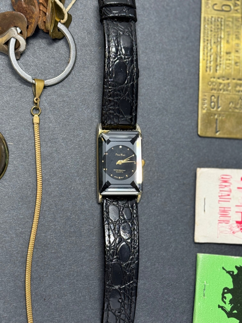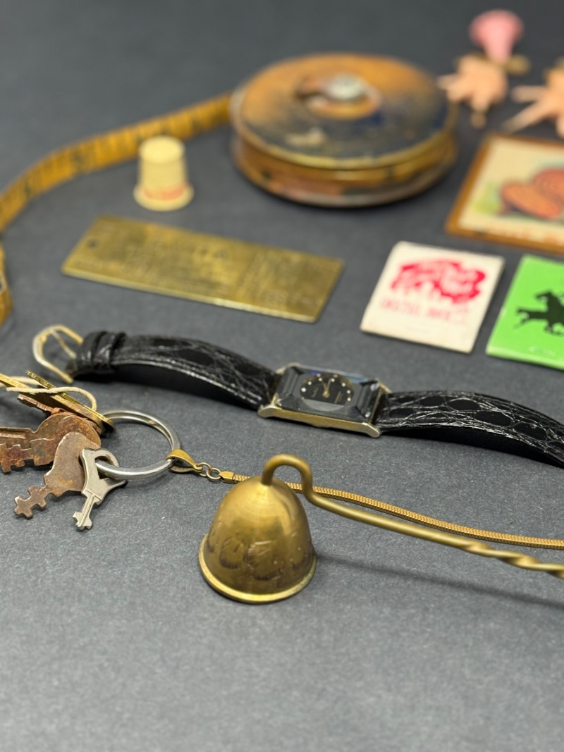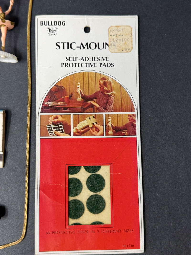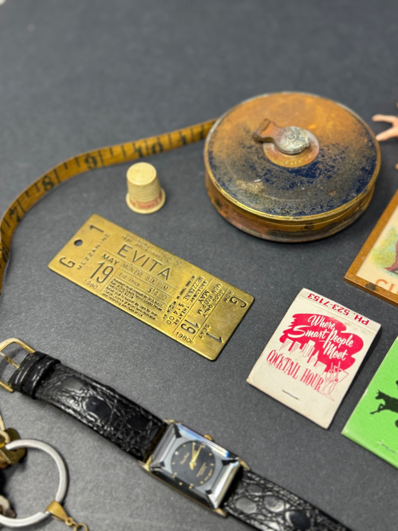 An eclectic assortment of vintage smalls and ephemera, spanning mid-20th century utility, advertising, and decorative items. This curated lot is ideal for collectors of Americana, resale, or display. Includes: Brassware: Vintage brass twisted-handle ladle (approx. 12" long), brass bell (approx. 3" diameter). Advertising & Ephemera: “Cut Red Beets” lithograph trade card, theater ticket stub (“Evita,” 1980), 3 vintage matchbooks, and Bulldog “Stic-Mount” protective pads (NOS, sealed). Novelty Figurines: 6 mid-century plastic ballerina cupcake toppers (approx. 2.5" tall). Miscellaneous: Key ring with vintage keys, leather wristwatch (unbranded, approx. 9" L), metal tape measure (approx. 6' range). Era: Mid-20th century to 1980s Condition: Mixed vintage condition consistent with age and use; some items show patina and wear, others remain unused/sealed.