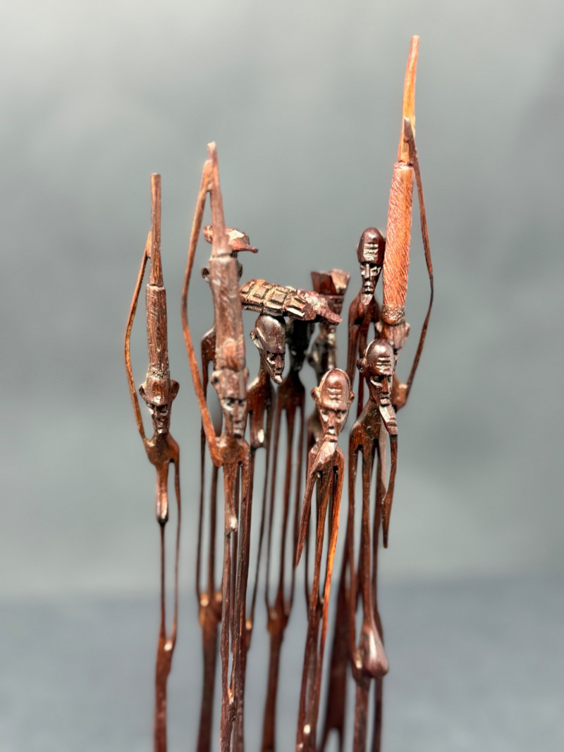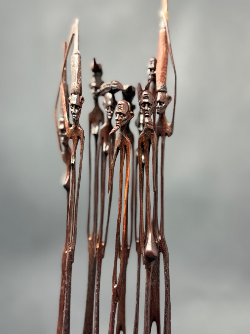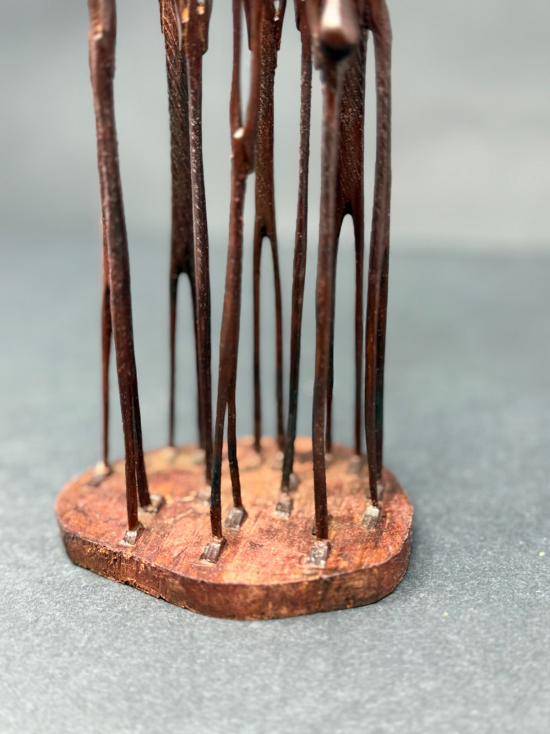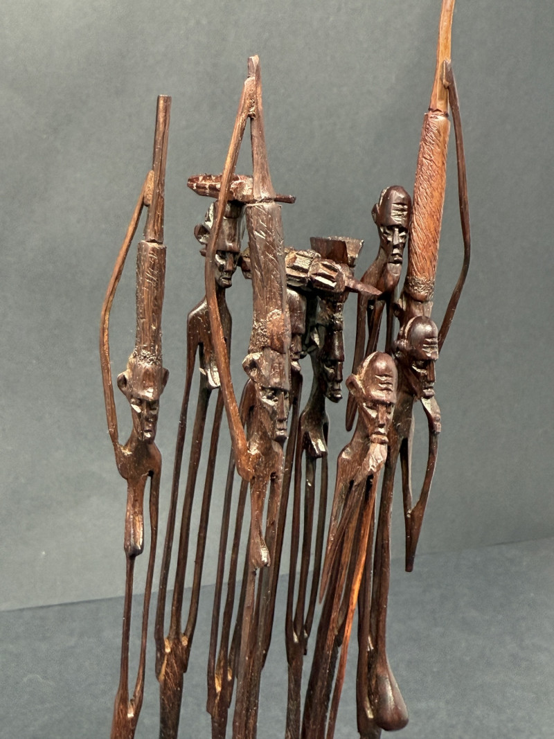 Rare Vintage Hand-Carved Ebony Wood Sculpture – Maasai Tribe Style – 1980s A rare and striking vintage hand-carved ebony wood sculpture in the style of the Maasai Tribe, attributed to Ndonye Mwanzino (c. 1980s). Carved from a single piece of dense ebony, the work features elongated figures with expressive detail, embodying both cultural heritage and fine craftsmanship. Highly collectible and seldom found in this size and form. Artist/Attribution: Ndonye Mwanzino (Maasai Tribe, Kenya/Tanzania) Era: 1980s Material: Solid ebony wood Dimensions: Approx. 14" H × 5" W × 4" D Condition: Excellent vintage condition; minor wear consistent with age.