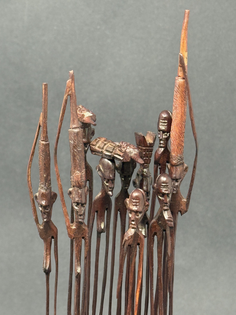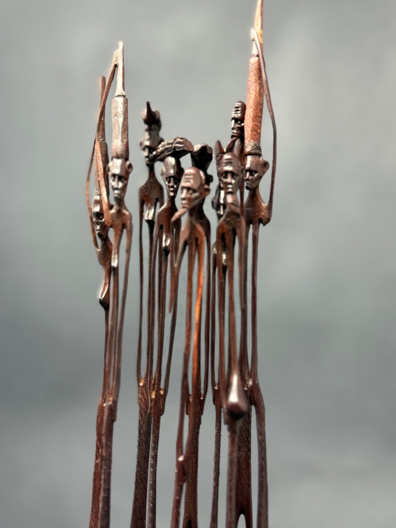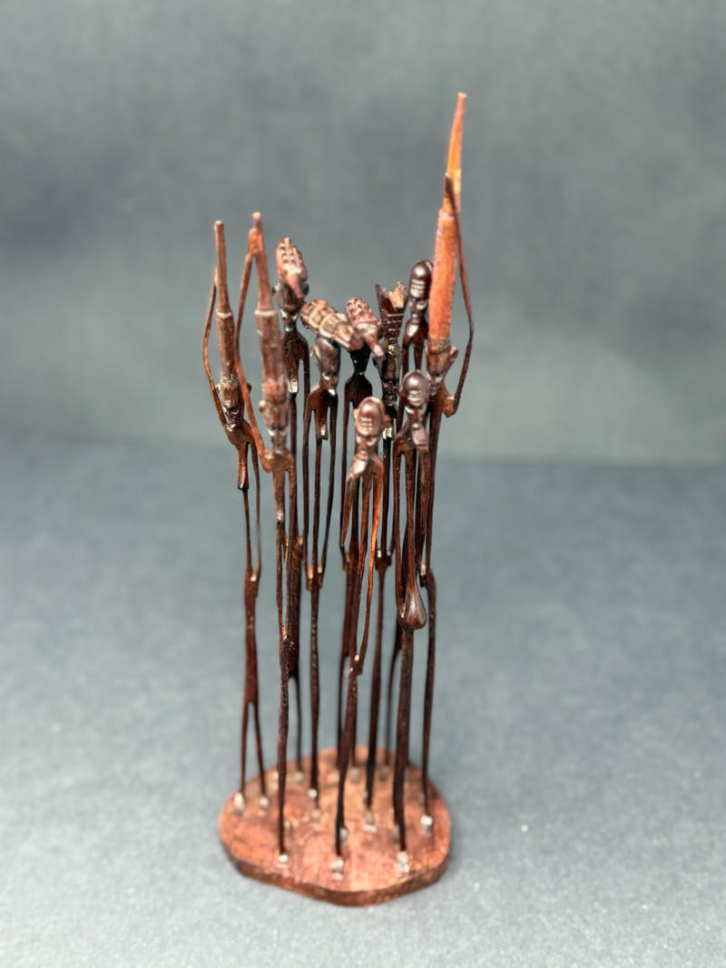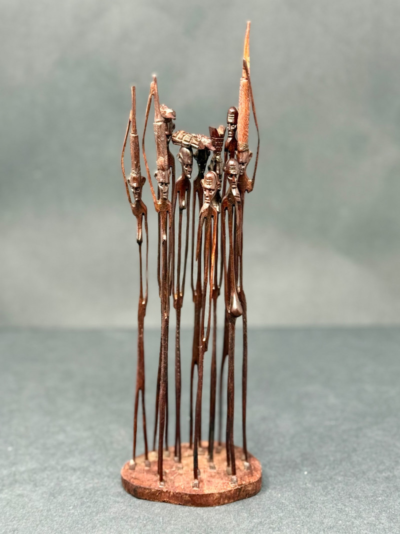 Rare Vintage Hand-Carved Ebony Wood Sculpture – Maasai Tribe Style – 1980s A rare and striking vintage hand-carved ebony wood sculpture in the style of the Maasai Tribe, attributed to Ndonye Mwanzino (c. 1980s). Carved from a single piece of dense ebony, the work features elongated figures with expressive detail, embodying both cultural heritage and fine craftsmanship. Highly collectible and seldom found in this size and form. Artist/Attribution: Ndonye Mwanzino (Maasai Tribe, Kenya/Tanzania) Era: 1980s Material: Solid ebony wood Dimensions: Approx. 14" H × 5" W × 4" D Condition: Excellent vintage condition; minor wear consistent with age.