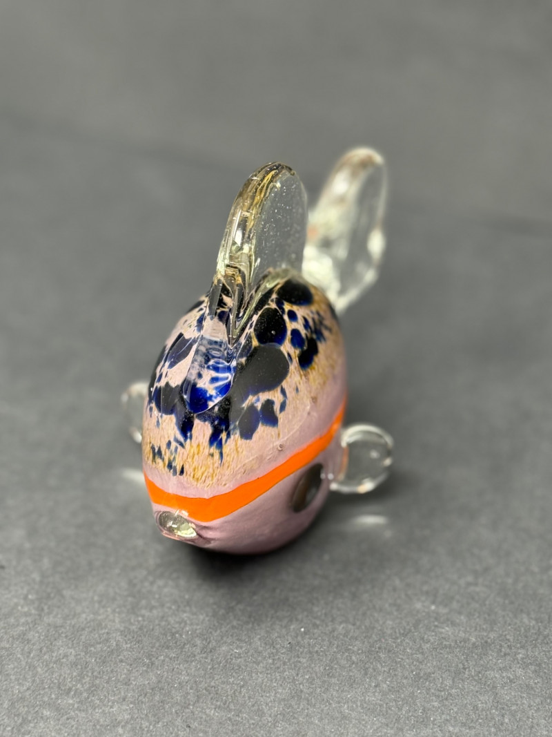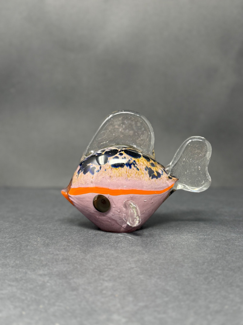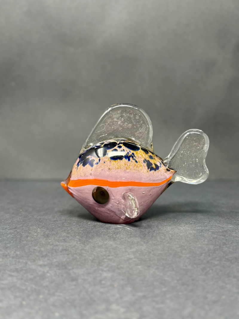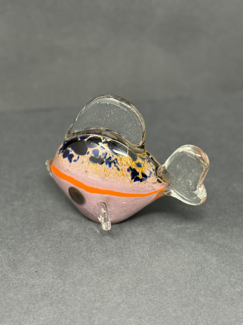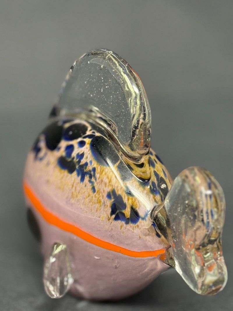 Vintage Murano-Style Art Glass Fish Figurine – Handblown A colorful vintage art glass fish figurine, handblown in the Murano style with clear glass fins and tail, speckled blue and black accents, and a vivid orange band around a lavender-pink body. A playful decorative piece with vibrant mid-century charm. Era: Mid to late 20th Century Material: Handblown art glass Dimensions: Approx. 4.5" L × 3.5" H × 2" W Condition: Excellent vintage condition with light wear from display; no chips or cracks noted.