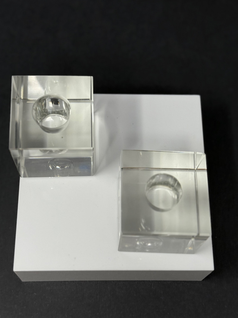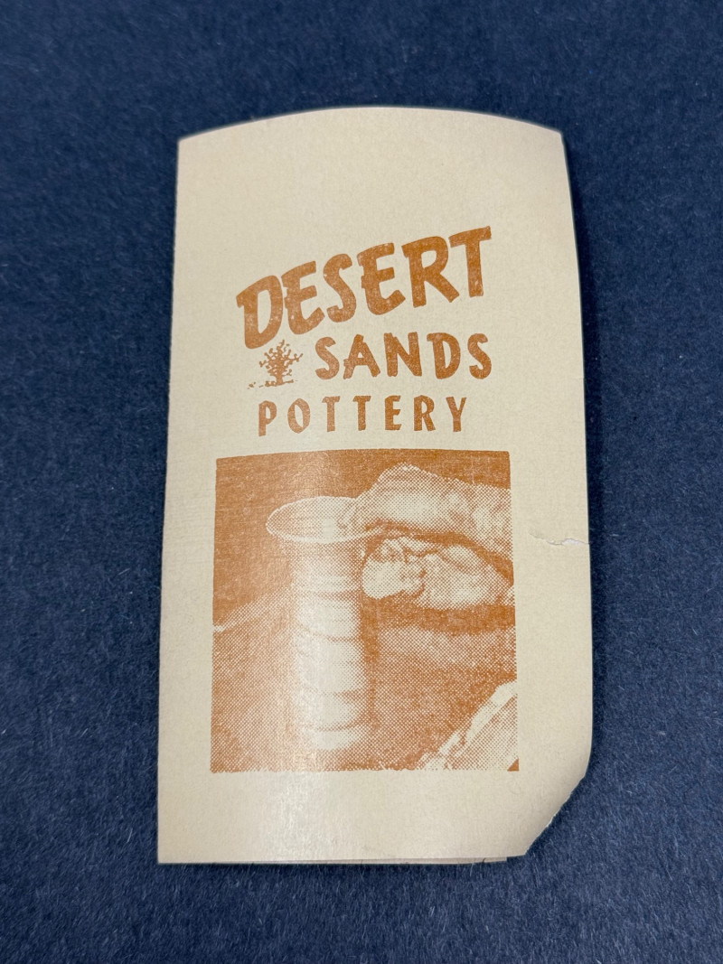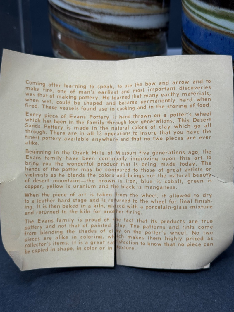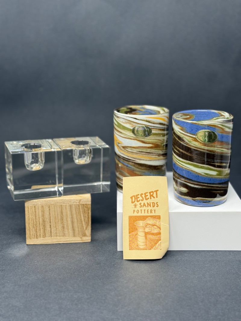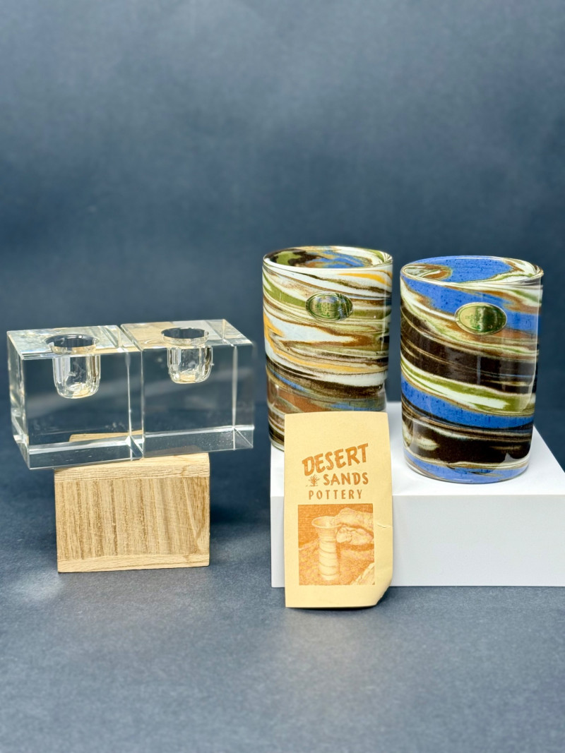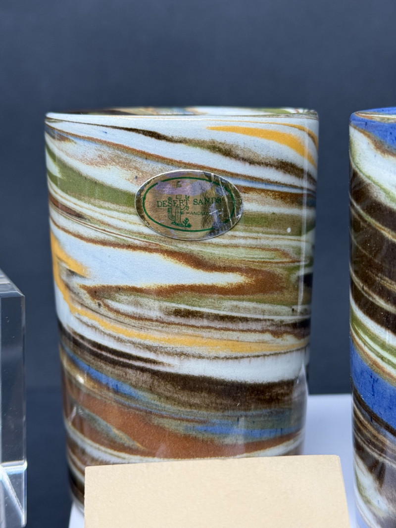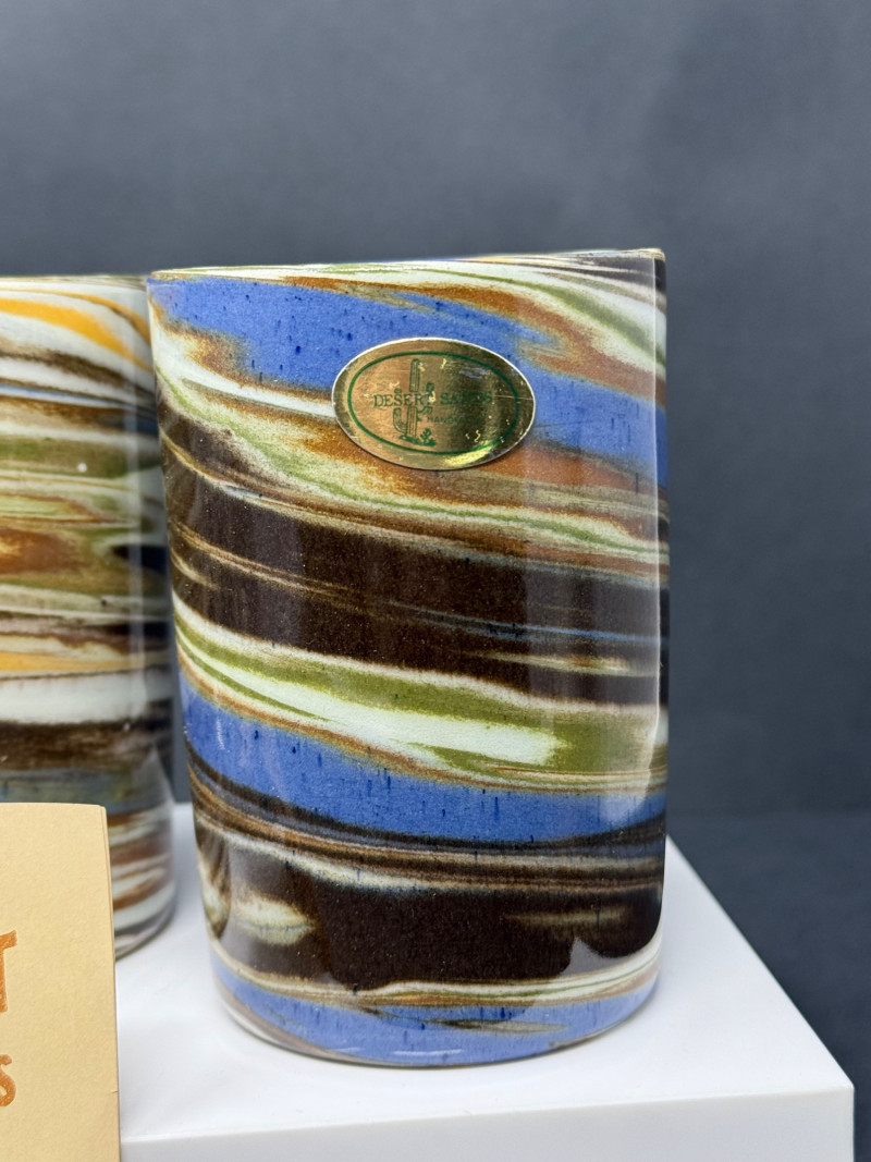 Vintage Desert Sands Pottery Tumblers with Original Labels & Acrylic Candle Holders – Lot of 4 A mid-century lot featuring two Desert Sands Pottery tumblers and a pair of modern acrylic block candle holders. Desert Sands Pottery (2): Classic hand-thrown tumblers in the signature desert swirl glaze, featuring earth tones with accents of blue and green. Both retain original foil labels and include the original Desert Sands Pottery brochure. Approx. 4.25" H × 3.25" W. Acrylic Candle Holders (2): Clear Lucite block design, each approx. 2.5" cube, fits standard taper candles. Era: Pottery c. 1950s–1960s; candle holders c. 1970s–80s Makers: Desert Sands Pottery (Nevada, USA); unmarked acrylic holders Condition: Excellent vintage condition; pottery shows no chips or cracks, acrylic blocks with light surface wear. Historical Note: Desert Sands Pottery was founded in Boulder City, Nevada, in the mid-20th century, and is known for its distinctive “desert swirl” glaze technique that layered colorful sands into the clay body. The pieces became popular tourist souvenirs in the American Southwest during the 1950s–60s and are now prized by collectors of Western and mid-century ceramics.