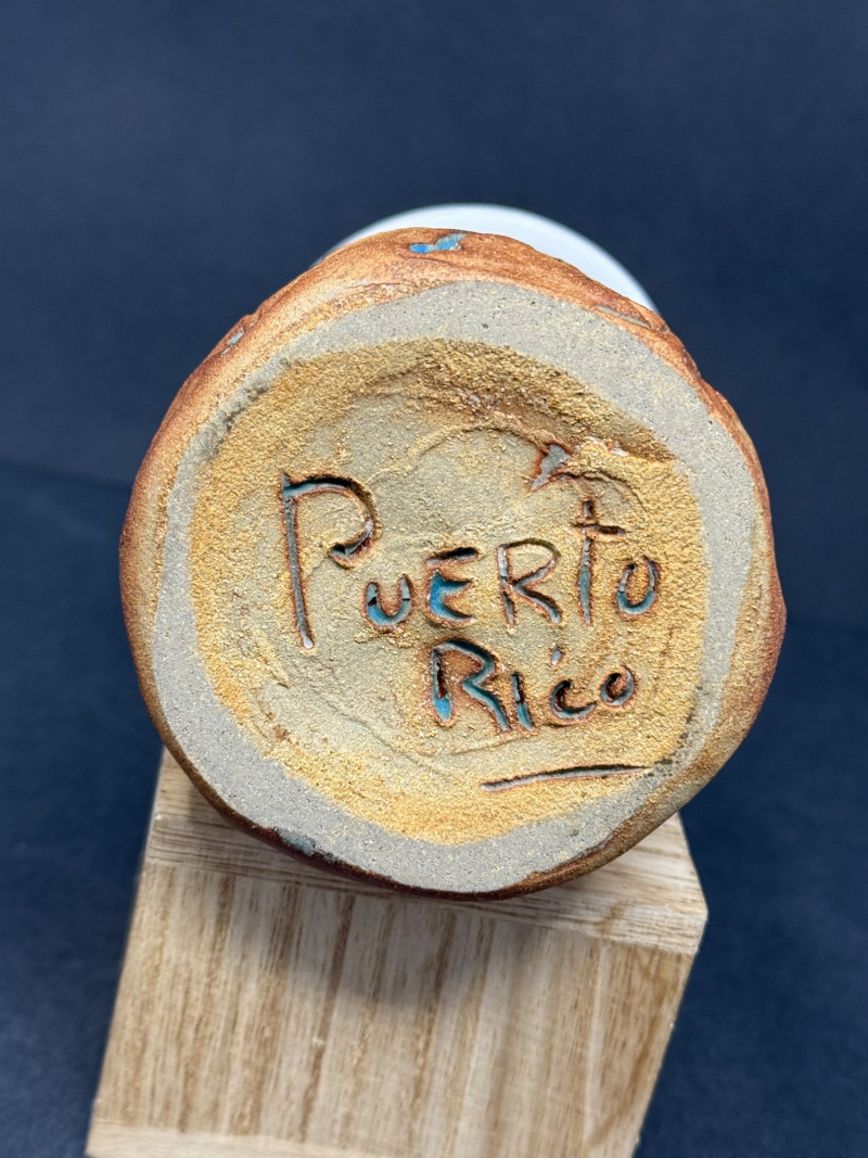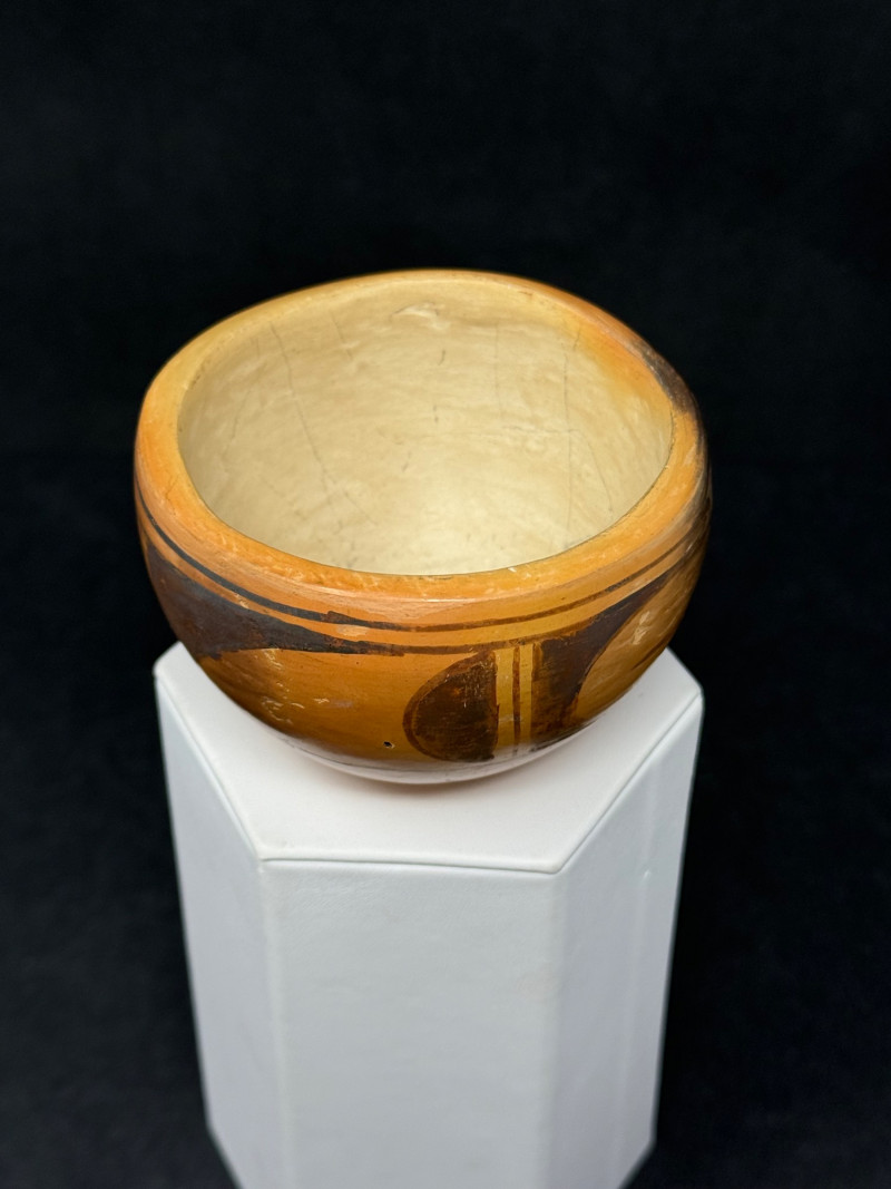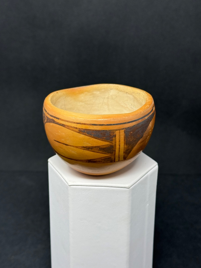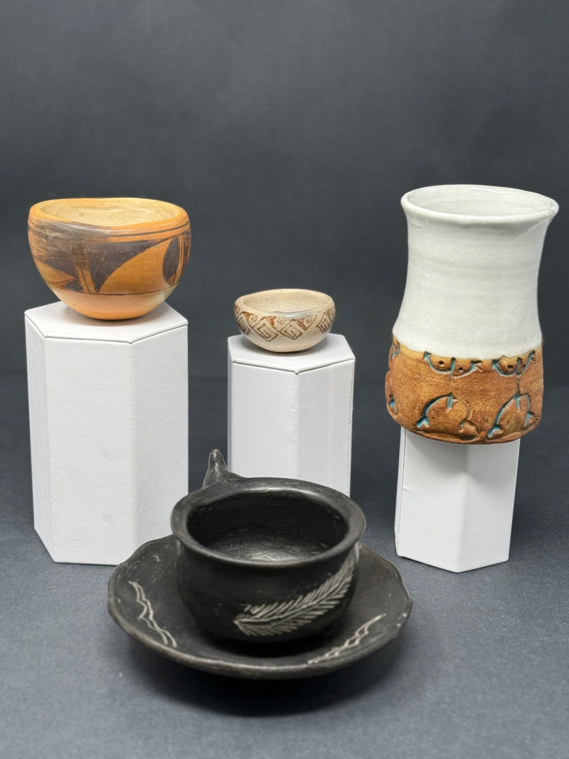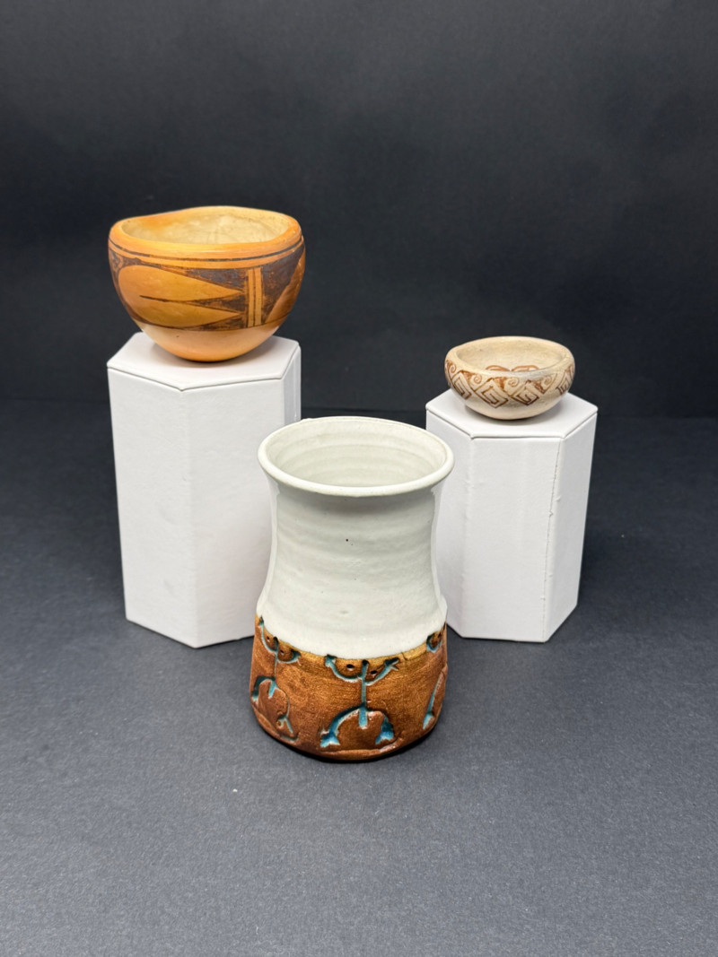 Native American Hopi Pottery Bowl, Miniature Pueblo Pottery, & Hector Marrero Studio Vessel – Lot of 4 A mixed lot of Native American and studio pottery, featuring both traditional pueblo-style bowls and a signed modernist vessel by Puerto Rican potter Hector Marrero. Hopi Pottery Bowl (1): Traditional hand-coiled and painted clay bowl with geometric black-on-red design. Approx. 3.5" H × 4.5" W. Miniature Pueblo Pottery Bowl (1): Light clay with hand-incised Greek key and wave patterns, approx. 2" H × 3.5" W. Hector Marrero Studio Vessel (1): Wheel-thrown stoneware vase with white glazed upper body and textured ochre base featuring stylized human figures in turquoise. Signed piece, Puerto Rico. Approx. 5.5" H × 4" W. Blackware Bowl & Saucer (1 set): Pueblo-inspired black pottery with incised feather and wave designs. Bowl approx. 2.5" H × 4" W; saucer approx. 5.5" diameter. Era: Mid to late 20th Century Makers: Hopi Tribe (USA); Hector Marrero (Puerto Rico); Pueblo style (attributed) Condition: Very good vintage condition; minor surface wear, no major chips or cracks. Historical Note: Hopi pottery continues a centuries-old tradition of coiled clay vessels decorated with symbolic geometric designs representing water, crops, and migration. The Hector Marrero studio piece reflects the influence of Puerto Rican modernist pottery of the mid-20th century, celebrated for blending indigenous Caribbean motifs with contemporary design.